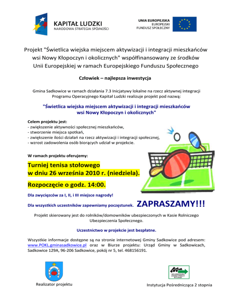 Projekt "Świetlica wiejska miejscem aktywizacji i integracji mieszkańców wsi Nowy Kłopoczyn i okolicznych" współfinansowany ze środków Unii Europejskiej w ramach Europejskiego Funduszu Społecznego Człowiek – najlepsza inwestycja Gmina Sadkowice w ramach działania 7.3 Inicjatywy lokalne na rzecz aktywnej integracji Programu Operacyjnego Kapitał Ludzki realizuje projekt pod nazwą: "Świetlica wiejska miejscem aktywizacji i integracji mieszkańców wsi Nowy Kłopoczyn i okolicznych" Celem projektu jest: - zwiększenie aktywności społecznej mieszkańców, - stworzenie miejsca spotkań, - zwiększenie ilości działań na rzecz aktywizacji i integracji społecznej, - wzrost zadowolenia osób biorących udział w projekcie. W ramach projektu oferujemy: Turniej tenisa stołowego w dniu 26 września 2010 r. (niedziela). Rozpoczęcie o godz. 14:00. Dla zwycięzców za I, II, i III miejsce nagrody! Dla wszystkich uczestników zapewniamy poczęstunek. ZAPRASZAMY!!! Projekt skierowany jest do rolników/domowników ubezpieczonych w Kasie Rolniczego Ubezpieczenia Społecznego. Uczestnictwo w projekcie jest bezpłatne. Wszystkie informacje dostępne są na stronie internetowej Gminy Sadkowice pod adresem: www.POKL.gminasadkowice.pl oraz w Biurze projektu: Urząd Gminy w Sadkowicach, Sadkowice 129A, 96-206 Sadkowice, pokój nr 5, tel. 468156191. Realizator projektu Instytucja Pośrednicząca 2 stopnia