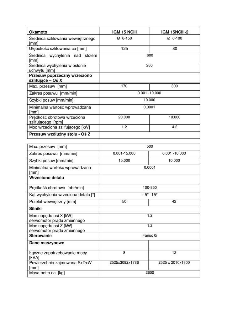 Okamoto Średnica szlifowania wewnętrznego [mm] Głębokość szlifowania ca [mm] Średnica wychylenia nad stołem [mm] Średnica wychylenia w osłonie uchwytu [mm] Przesuw poprzeczny wrzeciono szlifujące – Oś X Max. przesuw [mm] IGM 15 NCIII IGM 15NCIII-2 Ø 6-150 Ø 6-100 125 80 600 260 170 300 0.001 -10.000 Zakres posuwu [mm/min] Szybki posuw [mm/min] 10.000 Minimalna wartość wprowadzana [mm] Prędkość obrotowa wrzeciona szlifującego [rpm] Moc wrzeciona szlifującego [kW] 0,0001 20.000 10.000 1.2 4.2 Przesuw wzdłużny stołu - Oś Z 500 Max. przesuw [mm] Zakres posuwu [mm/min] Szybki posuw [mm/min] 0.001-15.000 0.001 -10.000 15.000 10.000 0,0001 Minimalna wartość wprowadzana [mm] Wrzeciono detalu Prędkość obrotowa [obr/min] 100-850 Kąt wychylenia wrzeciona detalu [°] - 5° -15° Przelot wewnętrzny [mm] 50 42 Silniki 1.2 Moc napędu osi X [kW] serwomotor prądu zmiennego Moc napędu osi Z [kW] serwomotor prądu zmiennego Sterowanie 1.2 Fanuc 0i Dane maszynowe Łączne zapotrzebowanie mocy [kVA] Powierzchnia zajmowana SxDxW [mm] Masa netto ca. [kg] 8 12 2525x3092x1786 2525 x 2010x1800 2600