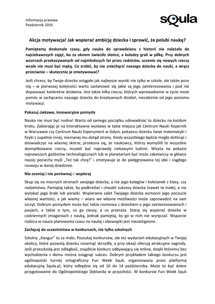Informacja prasowa Październik 2016 Akcja motywacja! Jak wspierać ambicję dziecka i sprawić, że polubi naukę? Pamiętamy doskonale czasy, gdy nauka do sprawdzianu z historii nie należała do najciekawszych zajęć, bo za oknem świeciło słońce, a koledzy grali w piłkę. Przy dobrych wzorcach przekazywanych od najmłodszych lat przez rodziców, uczenie się nowych rzeczy wcale nie musi być męką. Co zrobić, by nie zniechęcić naszego dziecka do nauki, a wręcz przeciwnie – skutecznie je zmotywować? Jeśli chcesz, by Twoje dziecko osiągało jak najlepsze wyniki nie tylko w szkole, ale także poza nią – w pierwszej kolejności warto zastanowić się jakie są jego zainteresowania i pod nie dopasować konkretne działania. Jest także kilka rzeczy, których wprowadzenie w życie może pomóc w zachęcaniu naszego dziecka do kreatywnych działań, niezależnie od jego poziomu motywacji. Pokazuj ciekawe, innowacyjne pomysły Nauka nie musi być nudna! Warto od samego początku udowadniać to dziecku na każdym kroku. Zabierając je na interaktywne wystawy w takie miejsca jak Centrum Nauki Kopernik w Warszawie czy Centrum Nauki Experyment w Gdyni, pokażesz dziecku świat matematyki i fizyki z zupełnie innej, nieznanej mu dotąd strony. Kiedy wszystkiego będzie mogło dotknąć i doświadczyć na własnej skórze, przekona się, że naukowcy, którzy wymyślili te wszystkie skomplikowane rzeczy, musieli być naprawdę ciekawymi ludźmi. Wizyta na pokazie najnowszych gadżetów technologicznych lub w planetarium być może zakotwiczy w główce naszej pociechy myśl „Też tak chcę!” i zmotywuje je do pielęgnowania tej idei i ciągłego rozwoju w danej dziedzinie. Nie oceniaj i nie porównuj – wspieraj Skup się na mocnych stronach swojego dziecka, a nie jego kolegów i koleżanek z klasy, czy rodzeństwa. Pamiętaj także, by podkreślać i chwalić sukcesy dziecka (nawet te małe), a nie wytykać jego braki lub porażki. Wspieranie zalet Twojego dziecka wzmocni jego poczucie własnej wartości, a jak wiemy – wiara we własne możliwości może zaprowadzić na sam szczyt. Dobrym pomysłem może być także rozmowa z dzieckiem o jego zainteresowaniach i pasjach, a także o tym, co go cieszy, a co przeraża. Staraj się wspierać dziecko w codziennych zmaganiach z nauką, jednak pamiętaj, by go w nich nie wyręczać. Wsparcie rodzica w nauce planowania czasu na naukę i obowiązki jest niezastąpione. Zachęcaj do uczestnictwa w konkursach, nie tylko szkolnych Szkolny „Kangur” to za mało. Poszukaj konkursów, ale też wydarzeń edukacyjnych w Twojej okolicy, które pozwolą dziecku rozwinąć skrzydła, a przy okazji oferują atrakcyjne nagrody. Jeśli przeszkodą jest odległość, znajdźcie konkurs odbywający się online, dzięki któremu bez wychodzenia z domu można osiągnąć sukces. Dobrym przykładem takiego konkursu jest ogólnopolski turniej ortograficzny Fun Week Squli, organizowany przez platformę edukacyjną Squla.pl, który odbędzie się od 10 do 14 października. Może to być dobre przygotowanie do Ogólnopolskiego Dyktanda w przyszłości. W konkursie Fun Week Squli Informacja prasowa Październik 2016 mogą wziąć udział zarówno szkoły podstawowe, jak i dzieci, posiadające konto na Squla.pl. Podczas lekcji, uczniowie będą rozwiązywać w Squli zadania z Przedmiotu Tygodnia, którym będzie Język polski, Przygoda z polskim oraz Kraina liter. Na zwycięzców czekają atrakcyjne nagrody – tablety, zabawki Furby i gadżety Squli. Więcej informacji na temat konkursu znajduje się na stronie https://www.squla.pl/zasady-ii-edycji-fun-weeksquli-2016. O Squli: Squla.pl to internetowa platforma edukacyjna dla uczniów szkół podstawowych i dzieci w wieku przedszkolnym, która pozwala im uczyć się poprzez zabawę. W Squli znajduje się ponad 31 000 zadań w postaci quizów, misji i gier o różnym poziomie trudności. Dzięki nowatorskiej formule Squli dzieci lubią się uczyć, robią to częściej, a w rezultacie osiągają lepsze wyniki. Platforma bezpłatnie udostępniana jest szkołom i przedszkolom. Platforma edukacyjna Squla została stworzona w 2010 roku w Holandii przez zespół ekspertów w dziedzinie szkolnictwa, technologii i twórców gier. Do dnia dzisiejszego ściśle współpracuje z CITO – najważniejszą organizacją egzaminacyjną na szczeblu szkół podstawowych w Holandii. W USA platforma istnieje od 2014 i współpracuje z Kaplan Inc., jedną z wiodących firm edukacyjnych w Stanach Zjednoczonych. W Polsce obecna jest od 2015 roku, a materiał na platformie jest w pełni zgodny z podstawą programową MEN. Squla jest również oficjalnym partnerem Oxford University Press. Rozwija się dzięki wsparciu prywatnych inwestorów i Bertelsmann AG zależnego od RTL Ventures. W 2013 roku Squla została uznana przez Wired UK za jeden z „najgorętszych europejskich start-up’ów”. Więcej informacji na stronie platformy: www.squla.pl oraz na ofcjalnym profilu Squla.pl na Facebooku. Kontakt dla mediów: Agnieszka Ciesek Clue PR [email protected] Tel: 516 186 720 Emilia Górska Clue PR [email protected] Tel: 515 896 442