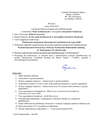Centralna Komisja do Spraw Stopni i Tytułów 00 - 901 Warszawa pl. Defilad 1 (PKiN) Wniosek z dnia 28.05.2013 o przeprowadzenie postępowania habilitacyjnego w dziedzinie Nauk Technicznych w dyscyplinie Inżynieria Chemiczna 1. Imię i Nazwisko: Robert Grzywacz 2. Stopień doktora: dr inż. nauk technicznych w dyscyplinie inżynieria chemiczna 3. Tytuł osiągnięcia naukowego: Właściwości stacjonarne bioreaktorów barbotażowych typu airlift 3. Wskazanie jednostki organizacyjnej do przeprowadzenia postępowanie habilitacyjnego: Wydział Inżynierii Procesowej i Ochrony Środowiska Politechniki Łódzkiej, ul. Wólczańska 213, 90-924 Łódź 4. Wnoszę o głosowanie komisji postępowania habilitacyjnego w trybie tajnym1). 5. Przyjmuję do wiadomości, iż wniosek wraz z autoreferatem zostanie opublikowany na stronie internetowej Centralnej Komisji do Spraw Stopni i Tytułów, zgodnie z obowiązującymi przepisami. Załączniki: 1. Odpis dyplomu doktora, 2. Autoreferat w języku polskim, 3. Wykaz osiągnięć naukowo – badawczych w języku polskim, 4. Autoreferat (Author’s review of his work (self-presentation)) w języku angielskim, 5. Wykaz osiągnięć naukowo – badawczych (List of research achievements) w języku angielskim, 6. Trzy egzemplarze monografii pt.: Właściwości stacjonarne bioreaktorów barbotażowych typu airlift, 7. Trzy egzemplarze książki pt.: Airlift Bioreactor, 8. Oświadczenia habilitanta i współautorów odnośnie udziału we wspólnych publikacjach, 9. Kopie elektroniczne publikacji zawartych w wykazie osiągnięć naukowo-badawczych 10. Dane personalne (CV) i kontaktowe habilitanta, 11. Wersje elektroniczne załączników 1 – 10 na trzech płytach DVD. 1) jeżeli niepotrzebne - skreślić
