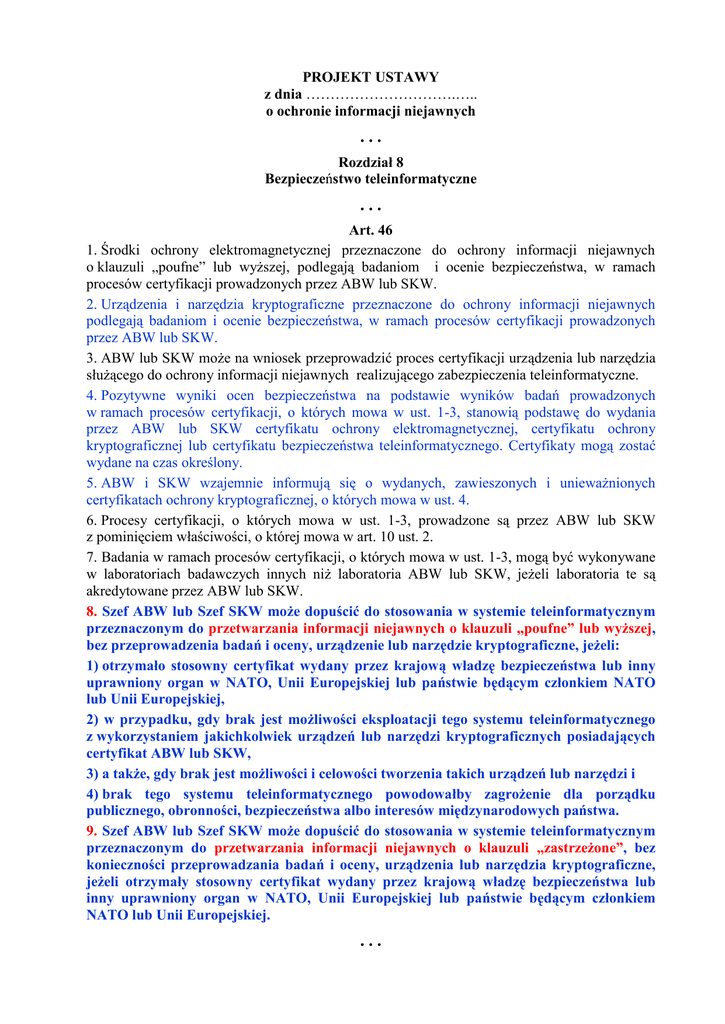PROJEKT USTAWY z dnia ………………………….….. o ochronie informacji niejawnych ... Rozdział 8 Bezpieczeństwo teleinformatyczne ... Art. 46 1. Środki ochrony elektromagnetycznej przeznaczone do ochrony informacji niejawnych o klauzuli „poufne” lub wyższej, podlegają badaniom i ocenie bezpieczeństwa, w ramach procesów certyfikacji prowadzonych przez ABW lub SKW. 2. Urządzenia i narzędzia kryptograficzne przeznaczone do ochrony informacji niejawnych podlegają badaniom i ocenie bezpieczeństwa, w ramach procesów certyfikacji prowadzonych przez ABW lub SKW. 3. ABW lub SKW może na wniosek przeprowadzić proces certyfikacji urządzenia lub narzędzia służącego do ochrony informacji niejawnych realizującego zabezpieczenia teleinformatyczne. 4. Pozytywne wyniki ocen bezpieczeństwa na podstawie wyników badań prowadzonych w ramach procesów certyfikacji, o których mowa w ust. 1-3, stanowią podstawę do wydania przez ABW lub SKW certyfikatu ochrony elektromagnetycznej, certyfikatu ochrony kryptograficznej lub certyfikatu bezpieczeństwa teleinformatycznego. Certyfikaty mogą zostać wydane na czas określony. 5. ABW i SKW wzajemnie informują się o wydanych, zawieszonych i unieważnionych certyfikatach ochrony kryptograficznej, o których mowa w ust. 4. 6. Procesy certyfikacji, o których mowa w ust. 1-3, prowadzone są przez ABW lub SKW z pominięciem właściwości, o której mowa w art. 10 ust. 2. 7. Badania w ramach procesów certyfikacji, o których mowa w ust. 1-3, mogą być wykonywane w laboratoriach badawczych innych niż laboratoria ABW lub SKW, jeżeli laboratoria te są akredytowane przez ABW lub SKW. 8. Szef ABW lub Szef SKW może dopuścić do stosowania w systemie teleinformatycznym przeznaczonym do przetwarzania informacji niejawnych o klauzuli „poufne” lub wyższej, bez przeprowadzenia badań i oceny, urządzenie lub narzędzie kryptograficzne, jeżeli: 1) otrzymało stosowny certyfikat wydany przez krajową władzę bezpieczeństwa lub inny uprawniony organ w NATO, Unii Europejskiej lub państwie będącym członkiem NATO lub Unii Europejskiej, 2) w przypadku, gdy brak jest możliwości eksploatacji tego systemu teleinformatycznego z wykorzystaniem jakichkolwiek urządzeń lub narzędzi kryptograficznych posiadających certyfikat ABW lub SKW, 3) a także, gdy brak jest możliwości i celowości tworzenia takich urządzeń lub narzędzi i 4) brak tego systemu teleinformatycznego powodowałby zagrożenie dla porządku publicznego, obronności, bezpieczeństwa albo interesów międzynarodowych państwa. 9. Szef ABW lub Szef SKW może dopuścić do stosowania w systemie teleinformatycznym przeznaczonym do przetwarzania informacji niejawnych o klauzuli „zastrzeżone”, bez konieczności przeprowadzania badań i oceny, urządzenia lub narzędzia kryptograficzne, jeżeli otrzymały stosowny certyfikat wydany przez krajową władzę bezpieczeństwa lub inny uprawniony organ w NATO, Unii Europejskiej lub państwie będącym członkiem NATO lub Unii Europejskiej. ...