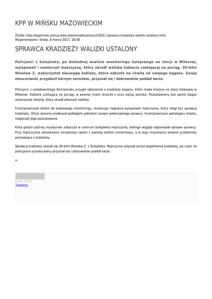 KPP W MIŃSKU MAZOWIECKIM Źródło: http://kppminsk.policja.waw.pl/pmm/aktualnosci/33011,Sprawca-kradziezy-walizki-ustalony.html Wygenerowano: Środa, 8 marca 2017, 16:38 SPRAWCA KRADZIEŻY WALIZKI USTALONY Policjanci z Sulejówka, po dokładnej analizie monitoringu kolejowego na stacji w Miłosnej, wytypowali i namierzyli mężczyznę, który ukradł walizkę kobiecie czekającej na pociąg. 30-letni Wiesław Z. wykorzystał nieuwagę kobiety, która odeszła na chwilę od swojego bagażu. Swoją nieuczciwość przypłacił karnym zarzutem, przyznał się i dobrowolnie poddał karze. Policjanci z sulejóweckiego Komisariatu przyjęli zgłoszenie o kradzieży bagażu, która miała miejsce na stacji kolejowej w Miłosnej. Kobieta czekająca na pociąg, w pewnej chwili straciła z oczu swoją walizkę. Pozostawiony bez opieki bagaż wykorzystał złodziej, który ukradł własność kobiety. Funkcjonariusze dotarli do kolejowego monitoringu. Analizując nagrania wytypowali mężczyznę, który mógł być sprawcą kradzieży. Oficer dyżurny przekazał podległym patrolom rysopis potencjalnego sprawcy. Funkcjonariusze patrolujący miasto, rozpoczęli jego poszukiwania. Kilka godzin później mundurowi zobaczyli w centrum Sulejówka mężczyznę, którego wygląd odpowiadał opisowi sprawcy. Przy mężczyźnie odnaleziono skradziony razem z walizką telefon komórkowy, a w jego mieszkaniu kolejne przedmioty pochodzące z kradzieży. Sprawcą kradzieży okazał się 30-letni Wiesław Z. z Sulejówka. Mężczyzna usłyszał zarzut popełnienia kradzieży, po czym na policyjnym przesłuchaniu przyznał się i dobrowolnie poddał karze. dn Ocena: 0/5 (0) Tweetnij