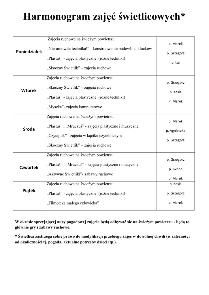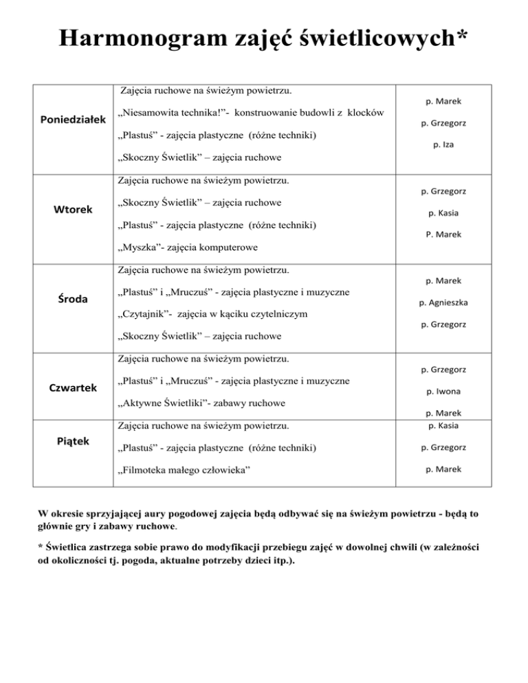 Harmonogram zajęć świetlicowych* Zajęcia ruchowe na świeżym powietrzu. p. Marek Poniedziałek „Niesamowita technika!”- konstruowanie budowli z klocków p. Grzegorz „Plastuś” - zajęcia plastyczne (różne techniki) p. Iza „Skoczny Świetlik” – zajęcia ruchowe Zajęcia ruchowe na świeżym powietrzu. p. Grzegorz Wtorek „Skoczny Świetlik” – zajęcia ruchowe p. Kasia „Plastuś” - zajęcia plastyczne (różne techniki) P. Marek „Myszka”- zajęcia komputerowe Zajęcia ruchowe na świeżym powietrzu. p. Marek Środa „Plastuś” i „Mruczuś” - zajęcia plastyczne i muzyczne p. Agnieszka „Czytajnik”- zajęcia w kąciku czytelniczym p. Grzegorz „Skoczny Świetlik” – zajęcia ruchowe Zajęcia ruchowe na świeżym powietrzu. p. Grzegorz Czwartek „Plastuś” i „Mruczuś” - zajęcia plastyczne i muzyczne p. Iwona „Aktywne Świetliki”- zabawy ruchowe Zajęcia ruchowe na świeżym powietrzu. Piątek „Plastuś” - zajęcia plastyczne (różne techniki) „Filmoteka małego człowieka” p. Marek p. Kasia p. Grzegorz p. Marek W okresie sprzyjającej aury pogodowej zajęcia będą odbywać się na świeżym powietrzu - będą to głównie gry i zabawy ruchowe. * Świetlica zastrzega sobie prawo do modyfikacji przebiegu zajęć w dowolnej chwili (w zależności od okoliczności tj. pogoda, aktualne potrzeby dzieci itp.).