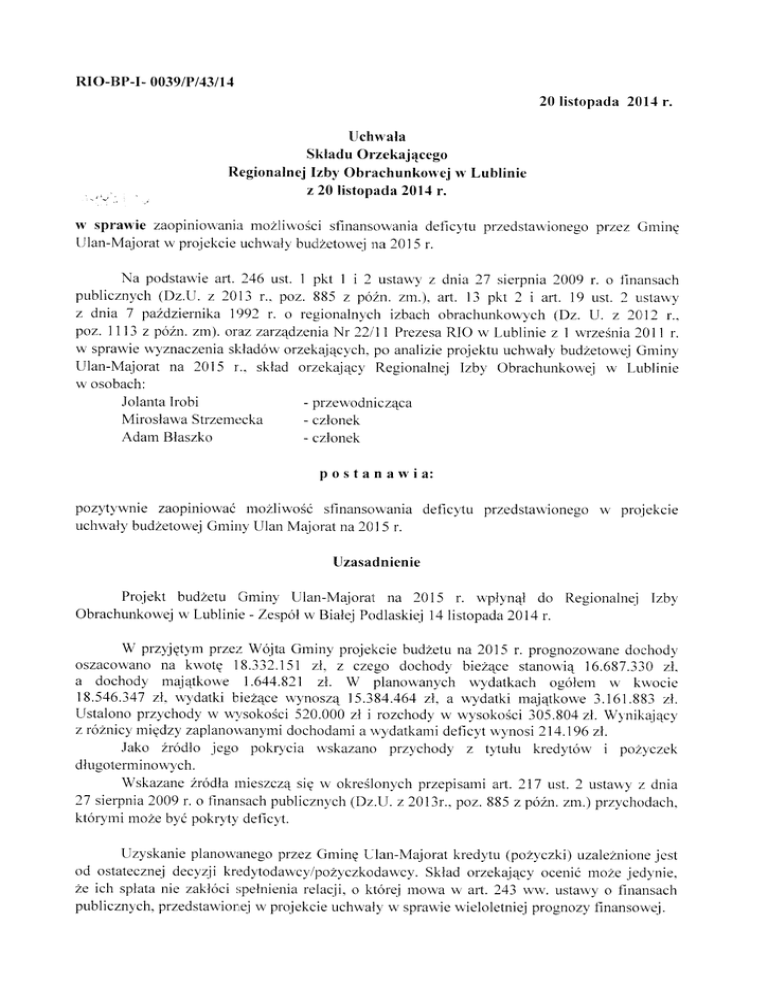 Ulan-Majorat na 2015 I.. sklad orz;ekaj4c1,Regionalnej Izbl'Obrachunkou'e.i w Ltrblinie