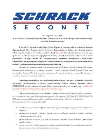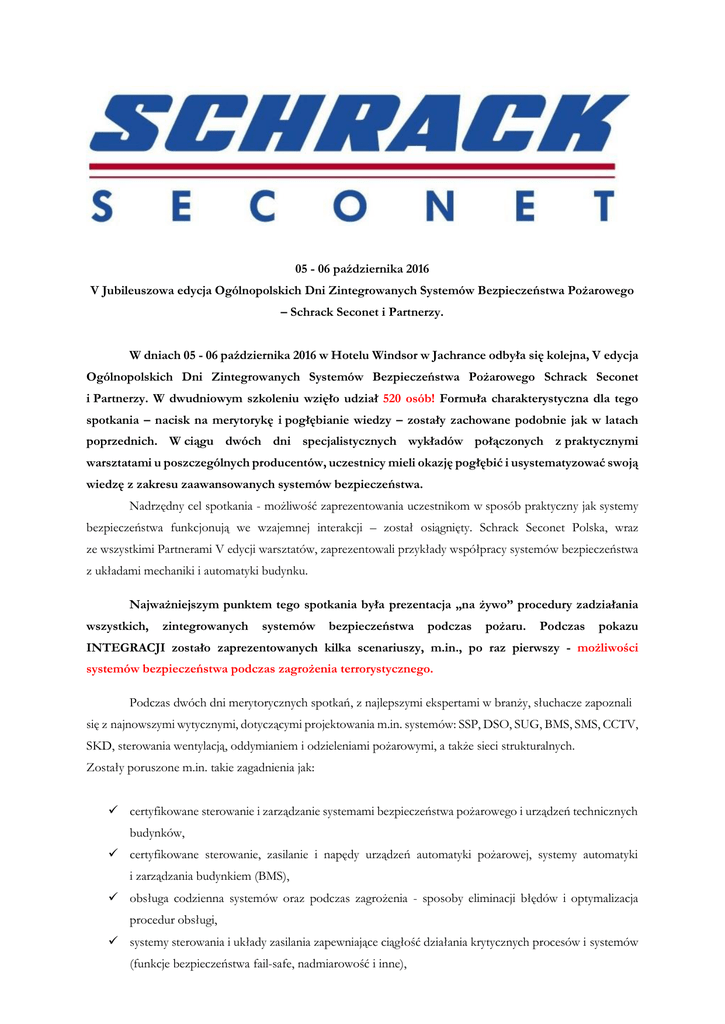 05 - 06 października 2016 V Jubileuszowa edycja Ogólnopolskich Dni Zintegrowanych Systemów Bezpieczeństwa Pożarowego – Schrack Seconet i Partnerzy. W dniach 05 - 06 października 2016 w Hotelu Windsor w Jachrance odbyła się kolejna, V edycja Ogólnopolskich Dni Zintegrowanych Systemów Bezpieczeństwa Pożarowego Schrack Seconet i Partnerzy. W dwudniowym szkoleniu wzięło udział 520 osób! Formuła charakterystyczna dla tego spotkania – nacisk na merytorykę i pogłębianie wiedzy – zostały zachowane podobnie jak w latach poprzednich. W ciągu dwóch dni specjalistycznych wykładów połączonych z praktycznymi warsztatami u poszczególnych producentów, uczestnicy mieli okazję pogłębić i usystematyzować swoją wiedzę z zakresu zaawansowanych systemów bezpieczeństwa. Nadrzędny cel spotkania - możliwość zaprezentowania uczestnikom w sposób praktyczny jak systemy bezpieczeństwa funkcjonują we wzajemnej interakcji – został osiągnięty. Schrack Seconet Polska, wraz ze wszystkimi Partnerami V edycji warsztatów, zaprezentowali przykłady współpracy systemów bezpieczeństwa z układami mechaniki i automatyki budynku. Najważniejszym punktem tego spotkania była prezentacja „na żywo” procedury zadziałania wszystkich, zintegrowanych systemów bezpieczeństwa podczas pożaru. Podczas pokazu INTEGRACJI zostało zaprezentowanych kilka scenariuszy, m.in., po raz pierwszy - możliwości systemów bezpieczeństwa podczas zagrożenia terrorystycznego. Podczas dwóch dni merytorycznych spotkań, z najlepszymi ekspertami w branży, słuchacze zapoznali się z najnowszymi wytycznymi, dotyczącymi projektowania m.in. systemów: SSP, DSO, SUG, BMS, SMS, CCTV, SKD, sterowania wentylacją, oddymianiem i odzieleniami pożarowymi, a także sieci strukturalnych. Zostały poruszone m.in. takie zagadnienia jak: certyfikowane sterowanie i zarządzanie systemami bezpieczeństwa pożarowego i urządzeń technicznych budynków, certyfikowane sterowanie, zasilanie i napędy urządzeń automatyki pożarowej, systemy automatyki i zarządzania budynkiem (BMS), obsługa codzienna systemów oraz podczas zagrożenia - sposoby eliminacji błędów i optymalizacja procedur obsługi, systemy sterowania i układy zasilania zapewniające ciągłość działania krytycznych procesów i systemów (funkcje bezpieczeństwa fail-safe, nadmiarowość i inne), zdalne zarządzanie systemami bezpieczeństwa, rozwiązania specjalne detekcji pożaru (detekcja tlenia, liniowa detekcja dymu i temperatury, detekcja płomienia), zintegrowane systemy SSP i SUG, procedury sterowania i praktyczne zastosowania aerozolowych systemów gaszenia SUG, projektowanie i realizacja dźwiękowych systemów ostrzegawczych, integracja z innymi systemami bezpieczeństwa, podwyższanie bezpieczeństwa pożarowego przy zastosowaniu zaawansowanych rozwiązań telewizji dozorowej. Swoje referaty wygłosili wybitni reprezentanci branży zabezpieczeń m.in.: przedstawiciele instytucji badawczych, najlepszych, specjalistycznych uczelni technicznych oraz niezależni specjaliści, zajmujący się problematyką systemów bezpieczeństwa. Do współorganizacji jedynego w branży zabezpieczeń szkolenia na tak dużą skalę zostali zaproszeni producenci innych systemów: BELIMO Siłowniki S.A. – lider w produkcji napędów klap pożarowych oraz siłowników i zaworów przeznaczonych do instalacji HVAC; Hanwha Techwin Europe, wcześniej Samsung Techwin Europe – część Grupy Samsung, oferująca wydajne i stabilne produkty nadzoru wizyjnego dla takich rynków wertykalnych jak: miasta, banki, transport, handel detaliczny, zaprojektowane w celu zaspokojenia obecnych i przyszłych potrzeb profesjonalnych instalatorów i użytkowników systemów zabezpieczeń elektronicznych; ID Electronics Sp. z o. o.– firma aktywna w kształtowaniu rozwoju branży technicznej ochrony mienia w Polsce, opierająca swoją ofertę sprzętową i rozwiązania systemowe na urządzeniach renomowanych producentów światowych, co w połączeniu z bogatą wiedzą i doświadczeniem pracowników pozwala na osiągnięcie bardzo dobrej relacji uzyskanej funkcjonalności do poniesionych kosztów. NUUXE RADIOTON Sp. z o. o.– dystrybutor Stałych Urządzeń Gaśniczych Aerozolowych, zaawansowanych systemów PSIM, VMS, a także kontroli dostępu. Profil działalności NUUXE obejmuje ponad 20 lat doświadczeń w projektowaniu, realizacji i serwisie szeroko pojętych systemów bezpieczeństwa; TOMMEX Żebrowcy Spólka Jawna – dostawca systemów nagłośnienia estradowego, systemów nagłośnienia obiektów sportowych oraz Dźwiękowych Systemów Ostrzegawczych; WAGO ELWAG Sp. z o. o. - dostawca kompleksowych rozwiązań w zakresie nowoczesnych systemów sterowania w przemyśle i automatyce budynkowej, umożliwiających nadzór nad infrastrukturą techniczną instalacji, integrację różnych systemów zarządzania i bezpieczeństwa obiektu. Zarówno w sesji wykładowej, jak i warsztatowej, udział wzięli przedstawiciele Instytutu Bezpieczeństwa Pożarowego NODEX. Przedstawiciele tego niezależnego ośrodka doradców i ekspertów, skupiającego najbardziej doświadczonych i znanych specjalistów w zakresie wytycznych projektowania i stosowania systemów bezpieczeństwa pożarowego w kraju, poprowadzili niezwykle ciekawe zajęcia teoretyczno-praktyczne. Wsparcie merytoryczne podczas tegorocznej edycji szkolenia zapewniły również: Centrum Naukowo – Badawcze Ochrony Przeciwpożarowej oraz Instytut Techniki Budowlanej. Wsparcie techniczne na etapie przygotowań oraz podczas całego spotkania zapewniła firma LUXMAT – Telecom Sp. z o. o. ze swoim autorskim systemem obsługi gości w oparciu o kody QR. Udział w dwudniowych warsztatach zostanie potwierdzony wspólnym certyfikatem, wystawionym przez Schrack Seconet Polska oraz wszystkich Partnerów szkolenia. Otrzymanie dokumentu z kompletem podpisów wszystkich producentów uzależnione jest od udziału ucz