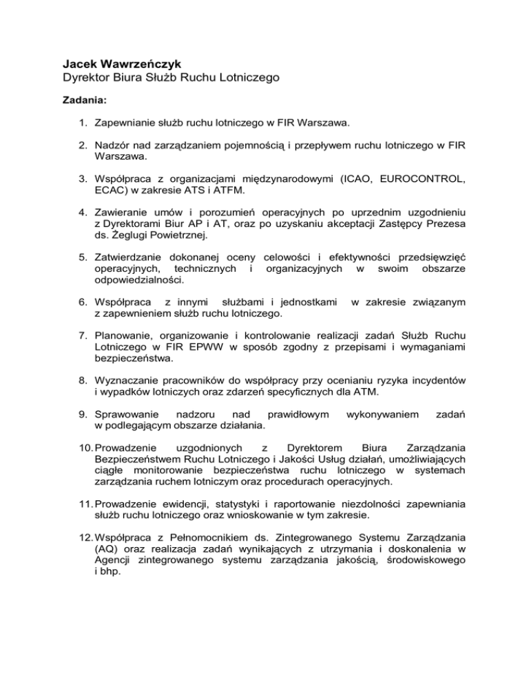 Jacek Wawrze czyk Dyrektor Biura S b Ruchu Lotniczego Zadania: 1. Zapewnianie s b ruchu lotniczego w FIR Warszawa. 2. Nadzór nad zarz dzaniem pojemno ci i przep ywem ruchu lotniczego w FIR Warszawa. 3. Wspó praca z organizacjami mi dzynarodowymi (ICAO, EUROCONTROL, ECAC) w zakresie ATS i ATFM. 4. Zawieranie umów i porozumie operacyjnych po uprzednim uzgodnieniu z Dyrektorami Biur AP i AT, oraz po uzyskaniu akceptacji Zast pcy Prezesa ds. eglugi Powietrznej. 5. Zatwierdzanie dokonanej oceny celowo ci i efektywno ci przedsi wzi operacyjnych, technicznych i organizacyjnych w swoim obszarze odpowiedzialno ci. 6. Wspó praca z innymi s bami i jednostkami z zapewnieniem s b ruchu lotniczego. w zakresie zwi zanym 7. Planowanie, organizowanie i kontrolowanie realizacji zada S b Ruchu Lotniczego w FIR EPWW w sposób zgodny z przepisami i wymaganiami bezpiecze stwa. 8. Wyznaczanie pracowników do wspó pracy przy ocenianiu ryzyka incydentów i wypadków lotniczych oraz zdarze specyficznych dla ATM. 9. Sprawowanie nadzoru nad prawid owym w podlegaj cym obszarze dzia ania. wykonywaniem zada 10. Prowadzenie uzgodnionych z Dyrektorem Biura Zarz dzania Bezpiecze stwem Ruchu Lotniczego i Jako ci Us ug dzia , umo liwiaj cych ci e monitorowanie bezpiecze stwa ruchu lotniczego w systemach zarz dzania ruchem lotniczym oraz procedurach operacyjnych. 11. Prowadzenie ewidencji, statystyki i raportowanie niezdolno ci zapewniania b ruchu lotniczego oraz wnioskowanie w tym zakresie. 12. Wspó praca z Pe nomocnikiem ds. Zintegrowanego Systemu Zarz dzania (AQ) oraz realizacja zada wynikaj cych z utrzymania i doskonalenia w Agencji zintegrowanego systemu zarz dzania jako ci , rodowiskowego i bhp.