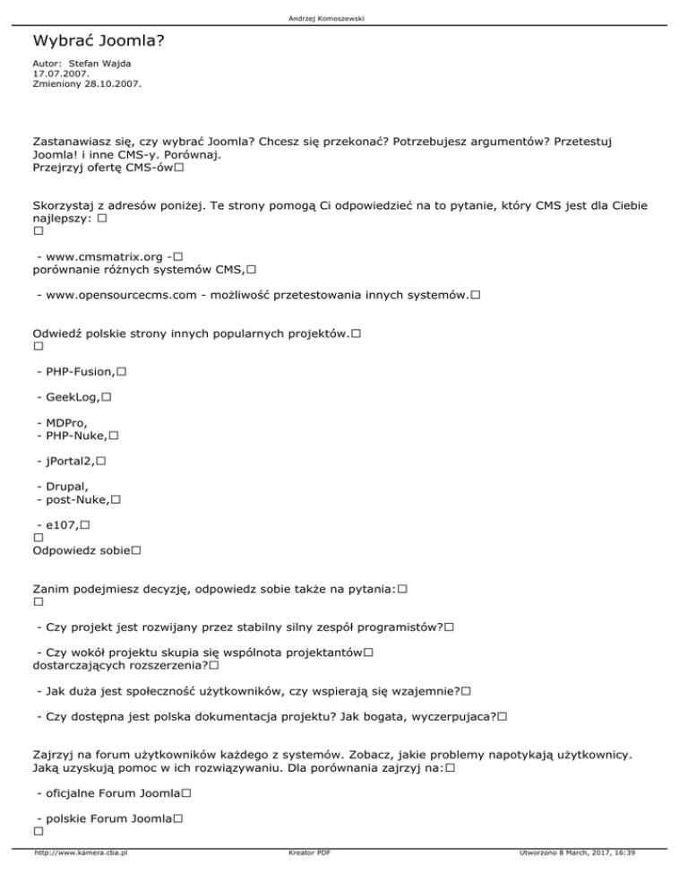 Andrzej Komoszewski Wybrać Joomla? Autor: Stefan Wajda 17.07.2007. Zmieniony 28.10.2007. Zastanawiasz się, czy wybrać Joomla? Chcesz się przekonać? Potrzebujesz argumentów? Przetestuj Joomla! i inne CMS-y. Porównaj. Przejrzyj ofertę CMS-ów Skorzystaj z adresów poniżej. Te strony pomogą Ci odpowiedzieć na to pytanie, który CMS jest dla Ciebie najlepszy: - www.cmsmatrix.org - porównanie różnych systemów CMS, - www.opensourcecms.com - możliwość przetestowania innych systemów. Odwiedź polskie strony innych popularnych projektów. - PHP-Fusion, - GeekLog, - MDPro, - PHP-Nuke, - jPortal2, - Drupal, - post-Nuke, - e107, Odpowiedz sobie Zanim podejmiesz decyzję, odpowiedz sobie także na pytania: - Czy projekt jest rozwijany przez stabilny silny zespół programistów? - Czy wokół projektu skupia się wspólnota projektantów dostarczających rozszerzenia? - Jak duża jest społeczność użytkowników, czy wspierają się wzajemnie? - Czy dostępna jest polska dokumentacja projektu? Jak bogata, wyczerpujaca? Zajrzyj na forum użytkowników każdego z systemów. Zobacz, jakie problemy napotykają użytkownicy. Jaką uzyskują pomoc w ich rozwiązywaniu. Dla porównania zajrzyj na: - oficjalne Forum Joomla - polskie Forum Joomla http://www.kamera.cba.pl Kreator PDF Utworzono 8 March, 2017, 16:39 Andrzej Komoszewski My już wybraliśmy. Wybraliśmy Joomla! Zapraszamy także i Ciebie! http://www.kamera.cba.pl Kreator PDF Utworzono 8 March, 2017, 16:39
