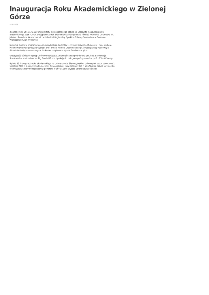 Inauguracja Roku Akademickiego w Zielonej Górze 2016-10-04 3 października 2016 r. w auli Uniwersytetu Zielonogórskiego odbyła się uroczysta inauguracja roku akademickiego 2016 / 2017. Swój pierwszy rok akademicki zainaugurowała również Akademia Gorzowska im. Jakuba z Paradyża. W uroczystości wziął udział Regionalny Dyrektor Ochrony Środowiska w Gorzowie Wielkopolskim, Jan Rydzanicz. Jednym z punktów programu była immatrykulacja studentów – czyli akt przyjęcia studentów I roku studiów. Przemówienie inauguracyjne wygłosił prof. dr hab. Andrzej Drzewińskiego pt. Ile jest prawdy naukowej w filmach fantastyczno-naukowych. Na koniec odśpiewano słynne Gaudeamus Igitur. Uroczystość uświetnił występ Chóru Uniwersytetu Zielonogórskiego pod dyrekcją dr. hab. Bartłomieja Stankowiaka, a także koncert Big Bandu UZ pod dyrekcją dr. hab. Jerzego Szymaniuka, prof. UZ In full swing. Była to 15. inauguracja roku akademickiego na Uniwersytecie Zielonogórskim. Uniwersytet został utworzony 1 września 2001 r. z połączenia Politechniki Zielonogórskiej (powstałej w 1965 r. jako Wyższa Szkoła Inżynierska) oraz Wyższej Szkoły Pedagogicznej (powstałej w 1971 r. jako Wyższa Szkoła Nauczycielska).