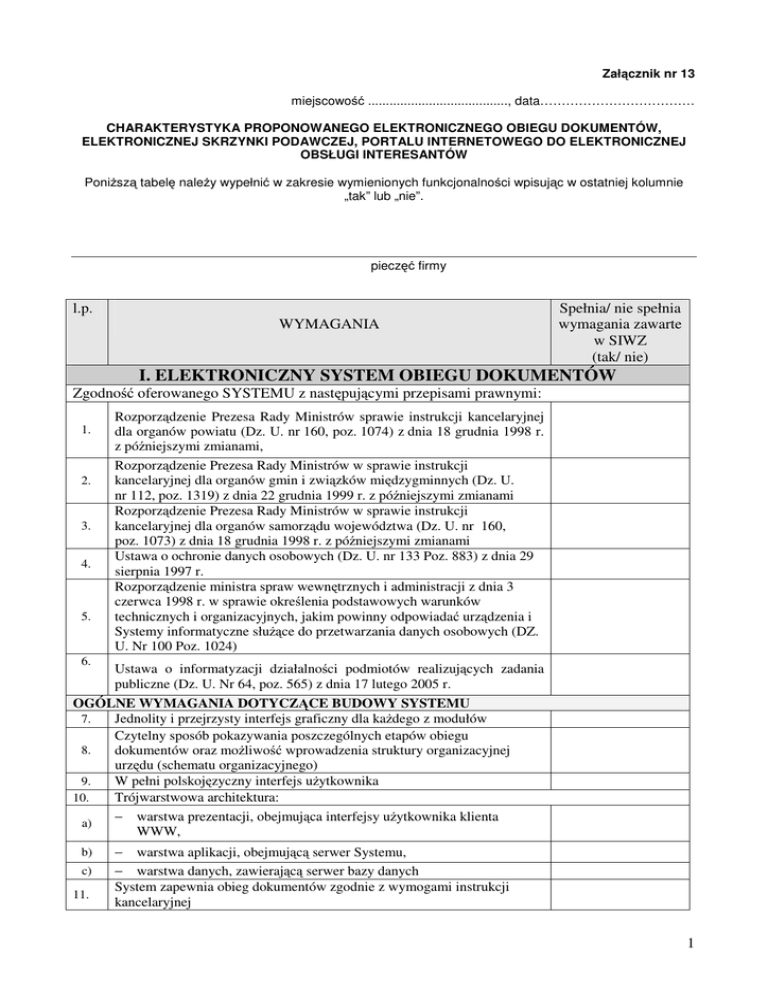 Zał cznik nr 13 miejscowo ......................................., data……………………………… CHARAKTERYSTYKA PROPONOWANEGO ELEKTRONICZNEGO OBIEGU DOKUMENTÓW, ELEKTRONICZNEJ SKRZYNKI PODAWCZEJ, PORTALU INTERNETOWEGO DO ELEKTRONICZNEJ OBSŁUGI INTERESANTÓW Poni sz tabel nale y wypełni w zakresie wymienionych funkcjonalno ci wpisuj c w ostatniej kolumnie „tak” lub „nie”. piecz l.p. WYMAGANIA Zgodno 1. 2. 3. 4. 5. 6. firmy Spełnia/ nie spełnia wymagania zawarte w SIWZ (tak/ nie) I. ELEKTRONICZNY SYSTEM OBIEGU DOKUMENTÓW oferowanego SYSTEMU z nast puj cymi przepisami prawnymi: Rozporz dzenie Prezesa Rady Ministrów sprawie instrukcji kancelaryjnej dla organów powiatu (Dz. U. nr 160, poz. 1074) z dnia 18 grudnia 1998 r. z pó niejszymi zmianami, Rozporz dzenie Prezesa Rady Ministrów w sprawie instrukcji kancelaryjnej dla organów gmin i zwi zków mi dzygminnych (Dz. U. nr 112, poz. 1319) z dnia 22 grudnia 1999 r. z pó niejszymi zmianami Rozporz dzenie Prezesa Rady Ministrów w sprawie instrukcji kancelaryjnej dla organów samorz du województwa (Dz. U. nr 160, poz. 1073) z dnia 18 grudnia 1998 r. z pó niejszymi zmianami Ustawa o ochronie danych osobowych (Dz. U. nr 133 Poz. 883) z dnia 29 sierpnia 1997 r. Rozporz dzenie ministra spraw wewn trznych i administracji z dnia 3 czerwca 1998 r. w sprawie okre lenia podstawowych warunków technicznych i organizacyjnych, jakim powinny odpowiada urz dzenia i Systemy informatyczne słu ce do przetwarzania danych osobowych (DZ. U. Nr 100 Poz. 1024) Ustawa o informatyzacji działalno ci podmiotów realizuj cych zadania publiczne (Dz. U. Nr 64, poz. 565) z dnia 17 lutego 2005 r. OGÓLNE WYMAGANIA DOTYCZ CE BUDOWY SYSTEMU Jednolity i przejrzysty interfejs graficzny dla ka dego z modułów 7. Czytelny sposób pokazywania poszczególnych etapów obiegu 8. dokumentów oraz mo liwo wprowadzenia struktury organizacyjnej urz du (schematu organizacyjnego) W pełni polskoj zyczny interfejs u ytkownika 9. 10. Trójwarstwowa architektura: − warstwa prezentacji, obejmuj ca interfejsy u ytkownika klienta a) WWW, b) c) 11. − warstwa aplikacji, obejmuj c serwer Systemu, − warstwa danych, zawieraj c serwer bazy danych System zapewnia obieg dokumentów zgodnie z wymogami instrukcji kancelaryjnej 1 12. 13. 14. 15. 16. 17. 18. 19. 20. 21. 22. 23. 24. 25. 26. 27. 28. Rozproszona rejestracja wszelkiej korespondencji ka dego typu wpływaj cej do Zamawiaj cego Rejestracja korespondencji wraz z zał cznikami Automatyczne numerowanie korespondencji Sygnowanie rejestrowanej korespondencji kodem kreskowym Tworzenie raportów i zestawie Wielostronicowe skanowanie dokumentów z poziomu aplikacji oraz rejestrowanie ich formy elektronicznej Optyczne rozpoznawanie tekstu w dokumentach przechowywanych w formie graficznej i konwersj tych dokumentów do plików tekstowych (obróbka OCR) Rejestracja tre ci skanowanych dokumentów pod obróbce OCR Rejestracja i nadzorowanie obiegu korespondencji wewn trznej Zamawiaj cego (pomi dzy pracownikami i komórkami organizacyjnymi) Jednolita baza klientów (nadawców i odbiorców korespondencji) Wielopoziomowa dekretacja wpływaj cej korespondencji z mo liwo ci niezale nego kierowania oryginałów dokumentów i Sporz dzania dowolnej ilo ci kopii dokumentów, tworzonych na dowolnym etapie ich obiegu Nadzorowanie ka dej kopii dokumentu Rejestrowanie ka dej czynno ci zwi zanej z poszczególnym dokumentem, np. w postaci historii, mo liwo szybkiego odczytania i drukowania tych informacji Nadawanie polece i terminów realizacji zwi zanych z korespondencj oraz kontrola ich realizacji Mo liwo przydzielania zada samemu sobie oraz innym u ytkownikom zgodnie z przydzielonymi uprawnieniami Nadzorowanie terminu i sposobu realizacji zada 31. Jednolity terminarz organizacji z mo liwo ci wpisywania terminów i rocznic poszczególnym u ytkownikom i grupom pracowników oraz ich powiadamiania wraz z potwierdzeniem Mo liwo tworzenia i przegl dania terminarzy grupowych oraz zarz dzania nimi Mo liwo udzielania zast pstw przez pracowników i pracy w zast pstwie 32. Jednoznaczne przypisanie odpowiedzialno ci za ka dy z dokumentów 33. Ewidencjonowanie i nadzorowanie dokumentów wewn trznych jednostki Zamawiaj cego wraz z ich stanami i wersjami. 29. 30. 34. 35. 36. 37. 38. 39. 40. 41. Mo liwo odtworzenia wersji dokumentu obowi zuj cej w danym dniu, je eli dokument w SYSTEMIE zmienił wersj . Obsługa korespondencji wychodz cej wyposa ona w mo liwo wykorzystania szablonów ułatwiaj cych przygotowanie dokumentów. Tworzenie szablonów powinno by proste i mo liwe do samodzielnego definiowania i modyfikowania przez przeszkolonego pracownika Zamawiaj cego Rejestrowanie i prowadzenie spraw wraz z dokumentami zwi zanymi. Kontrolowanie stanu sprawy (stopnia realizacji) i poszczególnych terminów realizacji wraz z powiadamianiem o opó nieniach. Sprawy s trwale gromadzone w teczkach i podteczkach rzeczowego wykazu akt i udost pniane zgodnie z uprawnieniami. Mo liwo przekazywania prowadzonych spraw innym pracownikom Wyszukiwarka, która w prosty i szybki sposób znajduje odpowiednie dokumenty. 2 42. 43. Przeszukiwanie metryk dokumentów, jak i tre ci dokumentów (plików dokumentów) w formatach przynajmniej MS Word, MS Excel i HTML Interfejs oparty na przegl darce internetowej (pełna - ł cznie z wprowadzaniem danych - obsługa przy u yciu przegl darki) 44. Polskoj zyczna instrukcja obsługi 45. Przechowywanie polskoj zycznych danych. 46. Mo liwo sumarycznej kontroli przez pracowników posiadaj cych odpowiednie uprawnienia dotycz cej ilo ci korespondencji przychodz cej, terminów realizacji i przydzielonych zada poszczególnych u ytkowników oraz ich grup; 47. Kontrola dotycz ca terminów realizacji mo liwa z odpowiednim wyprzedzeniem (stan na dany dzie ) 48. Zapami tywanie profilów pracy poszczególnych u ytkowników w ka dym z modułów i udost pnianie ich po zalogowaniu na dowolnej stacji roboczej 49. Mo liwo tworzenia procedur post powani