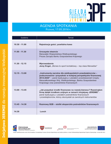 Agenda spotkania Poznań, 17.05.2016 r. Godzina Temat Inicjatywa JEREMIE dla rozwoju innowacyjnej Wielkopolski 10.30 - 11.00 11.00 - 11.30 11.30 - 12.15 Rejestracja gości, powitalna kawa Uroczyste otwarcie Marszałek Województwa Wielkopolskiego Prezes Zarządu Banku Gospodarstwa Krajowego Wprowadzenie Jerzy Engel, „Biznes to sport kontaktowy – top class Menadżer” 12.15 - 13.00 „Instrumenty zwrotne dla wielkopolskich przedsiębiorców – podsumowanie i przyszłość w kolejnej perspektywie finansowej 2014-2020” – panel dyskusyjny z udziałem przedstawicieli Urzędu Marszałkowskiego Woj. Wielkopolskiego, Banku Gospodarstwa Krajowego oraz pośredników finansowych 13.00 - 13.45 „Jak pozyskać środki finansowe na rozwój biznesu? Rozwinąłem firmę dzięki środkom unijnym w ramach inicjatywy JEREMIE” panel dyskusyjny z udziałem pośredników finansowych i przedsiębiorców, którzy skorzystali ze zwrotnych instrumentów 13.45 - 14.30 Rozmowy B2B – stoliki eksperckie pośredników finansowych 14.30 Lunch