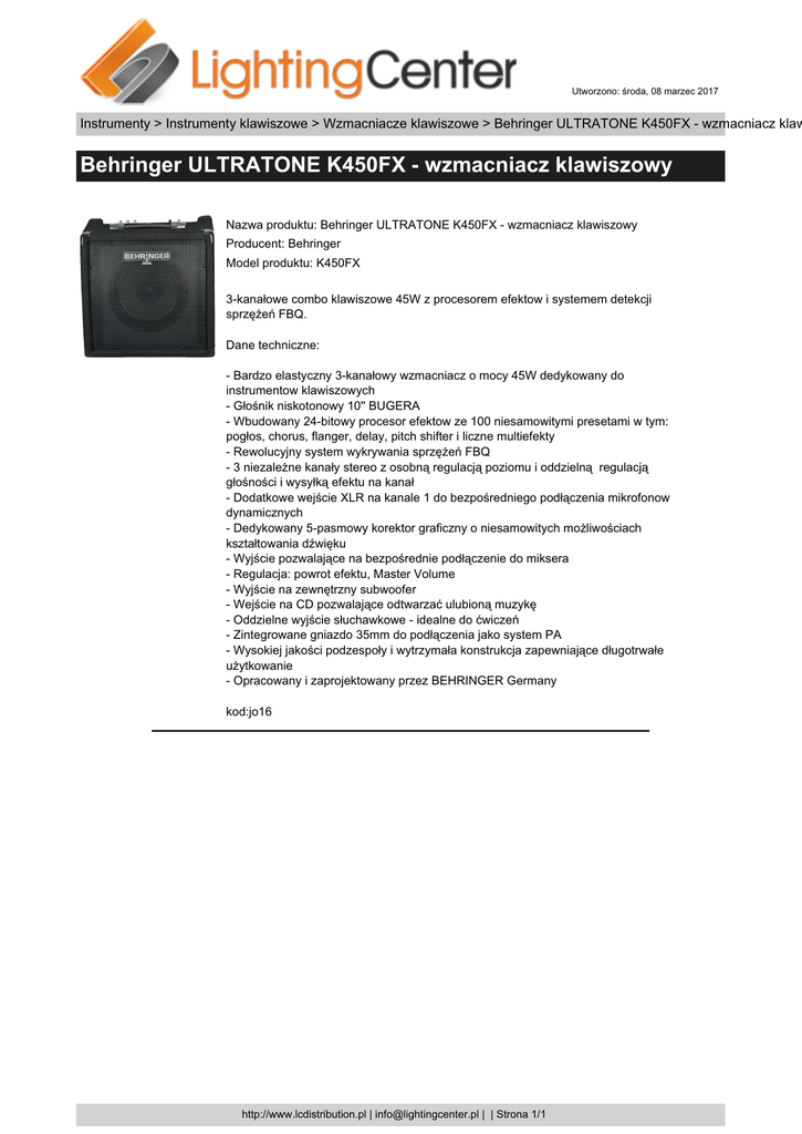 Utworzono: środa, 08 marzec 2017 Instrumenty > Instrumenty klawiszowe > Wzmacniacze klawiszowe > Behringer ULTRATONE K450FX - wzmacniacz klaw Behringer ULTRATONE K450FX - wzmacniacz klawiszowy Nazwa produktu: Behringer ULTRATONE K450FX - wzmacniacz klawiszowy Producent: Behringer Model produktu: K450FX 3-kanałowe combo klawiszowe 45W z procesorem efektow i systemem detekcji sprzężeń FBQ. Dane techniczne: - Bardzo elastyczny 3-kanałowy wzmacniacz o mocy 45W dedykowany do instrumentow klawiszowych - Głośnik niskotonowy 10'' BUGERA - Wbudowany 24-bitowy procesor efektow ze 100 niesamowitymi presetami w tym: pogłos, chorus, flanger, delay, pitch shifter i liczne multiefekty - Rewolucyjny system wykrywania sprzężeń FBQ - 3 niezależne kanały stereo z osobną regulacją poziomu i oddzielną regulacją głośności i wysyłką efektu na kanał - Dodatkowe wejście XLR na kanale 1 do bezpośredniego podłączenia mikrofonow dynamicznych - Dedykowany 5-pasmowy korektor graficzny o niesamowitych możliwościach kształtowania dźwięku - Wyjście pozwalające na bezpośrednie podłączenie do miksera - Regulacja: powrot efektu, Master Volume - Wyjście na zewnętrzny subwoofer - Wejście na CD pozwalające odtwarzać ulubioną muzykę - Oddzielne wyjście słuchawkowe - idealne do ćwiczeń - Zintegrowane gniazdo 35mm do podłączenia jako system PA - Wysokiej jakości podzespoły i wytrzymała konstrukcja zapewniające długotrwałe użytkowanie - Opracowany i zaprojektowany przez BEHRINGER Germany kod:jo16 http://www.lcdistribution.pl | [email protected] | | Strona 1/1