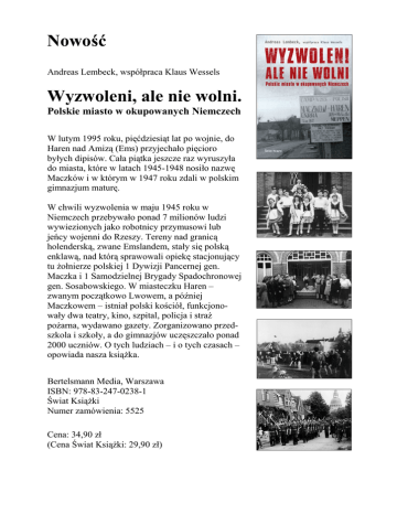 Wyzwoleni, ale nie wolni. Polskie miasto w okupowanych Niemczech do miasta, które w latach 1945Maczków i w którym w 1947 roku zdali w polskim W chwili wyzwolenia w maju 1945 roku w wywiezionych jako robotnicy przymusowi lub Maczka i 1 Samodzielnej Brygady Spadochronowej gen. Sosabowskiego. W miasteczku Haren – Maczkowem – cjono- 2000 uczniów. O tych ludziach – i o tych czasach – Bertelsmann Media, Warszawa ISBN: 978-83-247-0238-1 Numer zamówienia: 5525 Cena: 34,90 )