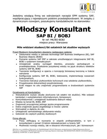 Jesteśmy wiodącą firmą we wdrożeniach narzędzi EPM systemu SAP, współpracującą z największymi polskimi przedsiębiorstwami. W związku z dynamicznym rozwojem, poszukujemy kandydatów/ek na stanowisko: Młodszy Konsultant SAP BI / BOBJ Nr ref: MK/BO-BOBJ miejsce pracy: Warszawa Mile widziani studenci/tki ostatnich lat studiów wyższych Przed Młodszym Konsultantem stawiamy następujące zadania: ● Zdobywanie wiedzy w zakresie technologii SAP Business Intelligence (BI), SAP Business Objects (BOBJ) ● Poznanie systemu SAP ERP w zakresie umożliwiającym integrowanie SAP BI, BOBJ z systemem transakcyjnym ● Umiejętność analizy wymagań klientów, procesów zachodzących w przedsiębiorstwie. Przełożenie pozyskanej wiedzy na język struktury obiektów systemu SAP BI, BOBJ ● Tworzenie konfiguracji w oparciu o koncepcję biznesową tworzoną w trakcie wdrożenia ● Konfigurację systemu SAP BI, BOBJ, testowanie, implementację rozszerzeń funkcjonalnych, ● Tworzenie instrukcji użytkowników końcowych oraz szkolenia użytkowników, ● Przygotowanie dokumentacji powdrożeniowej, ● Kroki mające na celu znajomość programowania w środowiskach systemów SAP Oczekiwania od Kandydatów: Wykształcenie wyższe (studia ukończone lub ostatni rok studiów). Mile widziani kandydaci z wykształceniem informatycznym, biznesowym ● Komunikatywność i umiejętność budowania dobrych relacji ● Wiedza na temat BI, BOBJ, ERP ● Znajomość przynajmniej jednego języka programowania ● Dobra znajomość języka angielskiego w mowie i piśmie ● Wytrwałość w dążeniu do celu ● Umiejętność samodzielnego zdobywania wiedzy ● Gotowość do częstych podróży służbowych ● Firma oferuje: ● Pracę obfitującą w wyzwania w zespole profesjonalistów, w tym z konsultantami z ponad 15-letnim doświadczeniem w branży SAP ● Możliwości rozwoju wiedzy, tak w obszarze informatycznym, jak i biznesowym Abile Sp. z o.o. z siedzibą w Warszawie: ul. Chałubińskiego 8, 00-613 Warszawa, zarejestrowana w Sądzie Rejonowym dla m.st. Warszawy w Warszawie, XIII Wydział Gospodarczy Krajowego Rejestru Sadowego, KRS 00000299639, REGON 141332520 kapitał zakładowy: 50.000 PLN w całości opłacony. ● ● Dostęp do najnowszych osiągnięć w dziedzinie informatyki. Nie-korporacyjne podejście. Elastyczny czas pracy. Zainteresowanych prosimy o przesłanie życiorysu oraz koniecznie listu motywacyjnego uzasadniającego aplikację na to stanowisko. W korespondencji, prosimy o powołanie się na numer referencyjny ogłoszenia rekrutacyjnego. Abile Sp. z o.o. e-mail: [email protected] Prosimy o dopisanie klauzuli: „Wyrażam zgodę na przetwarzanie moich danych osobowych zawartych w mojej ofercie pracy dla potrzeb niezbędnych do realizacji procesu rekrutacyjnego (zgodnie z Ustawą z dn. 29.08.97r. o Ochronie Danych Osobowych Dz. Ust. Nr 133 poz. 883)”. Abile Sp. z o.o. z siedzibą w Warszawie: ul. Chałubińskiego 8, 00-613 Warszawa, zarejestrowana w Sądzie Rejonowym dla m.st. Warszawy w Warszawie, XIII Wydział Gospodarczy Krajowego Rejestru Sadowego, KRS 00000299639, REGON 141332520 kapitał zakładowy: 50.000 PLN w całości opłacony.