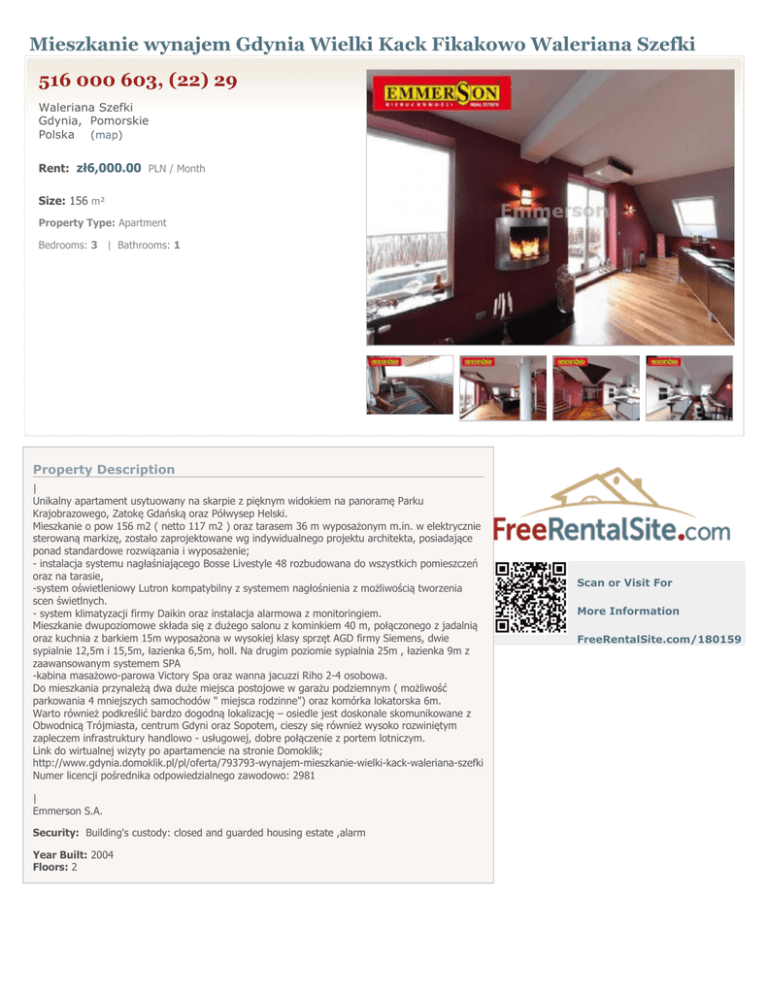 Mieszkanie wynajem Gdynia Wielki Kack Fikakowo Waleriana Szefki 516 000 603, (22) 29 Waleriana Szefki Gdynia, Pomorskie Polska (map) Rent: zł6,000.00 PLN / Month Size: 156 m² Property Type: Apartment Bedrooms: 3 | Bathrooms: 1 Property Description | Unikalny apartament usytuowany na skarpie z pięknym widokiem na panoramę Parku Krajobrazowego, Zatokę Gdańską oraz Półwysep Helski. Mieszkanie o pow 156 m2 ( netto 117 m2 ) oraz tarasem 36 m wyposażonym m.in. w elektrycznie sterowaną markizę, zostało zaprojektowane wg indywidualnego projektu architekta, posiadające ponad standardowe rozwiązania i wyposażenie; - instalacja systemu nagłaśniającego Bosse Livestyle 48 rozbudowana do wszystkich pomieszczeń oraz na tarasie, -system oświetleniowy Lutron kompatybilny z systemem nagłośnienia z możliwością tworzenia scen świetlnych. - system klimatyzacji firmy Daikin oraz instalacja alarmowa z monitoringiem. Mieszkanie dwupoziomowe składa się z dużego salonu z kominkiem 40 m, połączonego z jadalnią oraz kuchnia z barkiem 15m wyposażona w wysokiej klasy sprzęt AGD firmy Siemens, dwie sypialnie 12,5m i 15,5m, łazienka 6,5m, holl. Na drugim poziomie sypialnia 25m , łazienka 9m z zaawansowanym systemem SPA -kabina masażowo-parowa Victory Spa oraz wanna jacuzzi Riho 2-4 osobowa. Do mieszkania przynależą dwa duże miejsca postojowe w garażu podziemnym ( możliwość parkowania 4 mniejszych samochodów " miejsca rodzinne") oraz komórka lokatorska 6m. Warto również podkreślić bardzo dogodną lokalizację – osiedle jest doskonale skomunikowane z Obwodnicą Trójmiasta, centrum Gdyni oraz Sopotem, cieszy się również wysoko rozwiniętym zapleczem infrastruktury handlowo - usługowej, dobre połączenie z portem lotniczym. Link do wirtualnej wizyty po apartamencie na stronie Domoklik; http://www.gdynia.domoklik.pl/pl/oferta/793793-wynajem-mieszkanie-wielki-kack-waleriana-szefki Numer licencji pośrednika odpowiedzialnego zawodowo: 2981 | Emmerson S.A. Security: Building's custody: closed and guarded housing estate ,alarm Year Built: 2004 Floors: 2 Scan or Visit For More Information FreeRentalSite.com/180159