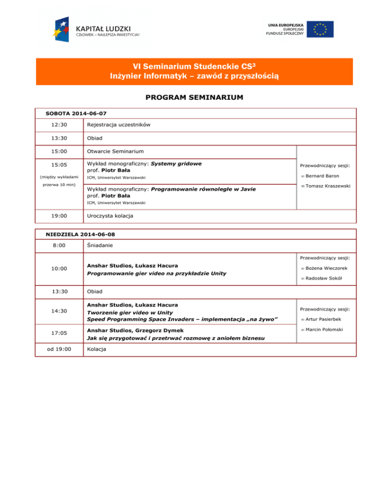 VI Seminarium Studenckie CS3 Inżynier Informatyk – zawód z przyszłością PROGRAM SEMINARIUM SOBOTA 2014-06-07 12:30 Rejestracja uczestników 13:30 Obiad 15:00 Otwarcie Seminarium 15:05 Wykład monograficzny: Systemy gridowe prof. Piotr Bała (między wykładami ICM, Uniwersytet Warszawski przerwa 10 min) Wykład monograficzny: Programowanie równoległe w Javie prof. Piotr Bała Przewodniczący sesji: • Bernard Baron • Tomasz Kraszewski ICM, Uniwersytet Warszawski 19:00 Uroczysta kolacja NIEDZIELA 2014-06-08 8:00 Śniadanie Przewodniczący sesji: 10:00 Anshar Studios, Łukasz Hacura Programowanie gier video na przykładzie Unity 13:30 17:05 Tworzenie gier video w Unity Speed Programming Space Invaders – implementacja „na żywo” Anshar Studios, Grzegorz Dymek Jak się przygotować i przetrwać rozmowę z aniołem biznesu od 19:00 • Radosław Sokół Obiad Anshar Studios, Łukasz Hacura 14:30 • Bożena Wieczorek Kolacja Przewodniczący sesji: • Artur Pasierbek • Marcin Połomski PONIEDZIAŁEK 2014-06-09 8:00 Śniadanie SII, Aleksandra Nowaczyk - specjalista ds. rekrutacji i HR 10:00 Najlepsze miejsce pracy IT w Polsce – kariera w SII 10:30 SII, Łukasz Libront - Team Leader Przewodniczący sesji: • Bożena Wieczorek • Radosław Sokół Case study: hybrydowa aplikacja mobilna w bankowości Przewodniczący sesji: 12:00 SII, Łukasz Libront - Team Leader Mobilne trendy i technologie w 2014 roku 13:30 • Marcin Połomski • Artur Pasierbek Obiad Przewodniczący sesji: 14:30 Warsztaty studenckie Systemy multimedialne 19:00 • Bożena Wieczorek • Tomasz Kraszewski Kolacja WTOREK 2014-06-10 7:30 Śniadanie 8:00 Wyjazd do Krakowa 10:00 Motorola Solutions Kraków Wizyta w krakowskim oddziale firmy 14:00 Obiad (w przerwie wizyty w Motorola Kraków) 18:00 Wyjazd z Krakowa 19:30 Kolacja grillowa ŚRODA 2014-06-11 8:00 Śniadanie Przewodniczący sesji: • Bożena Wieczorek 9:30 Warsztaty studenckie, sesja B • Marcin Połomski • Artur Pasierbek Przewodniczący sesji: 11:00 Warsztaty studenckie, sesja posterowa • Tomasz Kraszewski • Radosław Sokół 12:00 Podsumowanie i zakończenie seminarium 12:30 Wyjazd do Gliwic