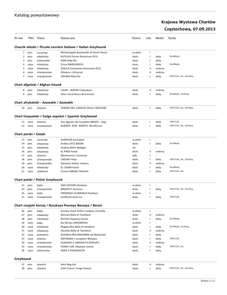 Katalog powystawowy: Krajowa Wystawa Chartów Częstochowa, 07.09.2013 Nr kat. Płeć Klasa Nazwa psa Ocena Lok. Medal Tytuły Charcik włoski / Piccolo Levriero Italiano / Italian Greyhound 1 pies szczeniąt Michelangelo Buonarotti of Devils Doves w.obiec I - 2 pies młodzieży RUTILIUS Forum Romanum (FCI) dosk. I złoty 3 pies weteranów EMIR Niby Nic dosk. I złoty 4 suka młodzieży Sirius MARGHERITA dosk. I złoty 5 suka młodzieży ZUELLA Gorzowska Panorama (FCI) dosk. II srebrny 6 suka championów Olimpia z Ochoczej dosk. II srebrny 7 suka championów SOLANA Niby Nic dosk. I złoty Zw.Młodz., Zw.Młodz., CWC/CAC, Zw., Zw.Rasy, Chart afgański / Afghan Hound 8 pies młodzieży CAHIR - WASIM Czatyrdach dosk. II srebrny 9 pies młodzieży Shou Gerat Bravo Bravissimo dosk. I złoty Zw.Młodz., Zw.Rasy, dosk. I złoty CWC/CAC, Zw., Zw.Rasy, Chart afrykański - Azawakh / Azawakh 10 pies otwarta THRORY DEL CANTICO DELLE CREATURE Chart hiszpański / Galgo espańol / Spanish Greyhound 11 suka otwarta San Agustin del Guadalix BREEZE - Kaja dosk. I złoty CWC/CAC, 12 suka championów BUENOS DIAS BONITA Beneficium dosk. I złoty CWC/CAC, Zw., Zw.Rasy, Chart perski / Saluki 13 pies szczeniąt SHAPOUR Karsziptar w.obiec I - 14 pies młodzieży Arabica (FCI) BASIM dosk. I złoty Zw.Młodz., 15 pies młodzieży Arabica Bellis Bellagio nb - - 16 pies młodzieży EL PASO Farlat dosk. II srebrny 17 pies otwarta Mamnouna's Tamerlan bdb I - 18 pies championów CAESAR Yrtep dosk. I złoty 19 pies championów Dalaman Nahid, Yashars dosk. II srebrny 20 suka młodzieży EL CASAR Farlat dosk. I złoty Zw.Młodz., 21 suka użytkowa Ta'zim FARAZA FADILAH dosk. I złoty CWC/CAC, Zw., - CWC/CAC, Zw., Zw.Rasy, Chart polski / Polish Greyhound 22 pies baby DAR HISTORII Ranbaza w.obiec I 23 pies championów MAURYCY Arcturus dosk. I złoty 24 suka baby DWORSKA ULUBIENICA Ranbaza w.obiec I - 25 suka championów GUDELKA Arcturus dosk. I złoty CWC/CAC, Zw., Zw.Rasy, CWC/CAC, Chart rosyjski borzoj / Russkaya Psovaya Borzaya / Barzoi 26 pies baby Russkiy Azart Yeifire Candoro Chantilly w.obiec I - 27 pies młodzieży Michael Bello di Tatrebest dosk. II srebrny 28 pies młodzieży RUCZAJ Stepowy Goniec dosk. I złoty 29 suka baby Na Wirażu AWIONETKA w.obiec I - 30 suka młodzieży Magdushka Bello di tatrebest dosk. I złoty 31 suka młodzieży Mariella Bello di Tatrebest dosk. II srebrny złoty 32 suka pośrednia RUSAŁKA MICHAJŁOWNA od Matrioszki dosk. I 33 suka otwarta ANTONINA z Jurajskich Biskupic dosk. I złoty 34 suka championów ALMAZKA Z JURAJSKICH BISKUPIC dosk. II srebrny 35 suka championów FUNNY GIRL Stepowy Goniec dosk. I złoty 36 suka weteranów HERA Z POGRANICZA dosk. I złoty Zw.Młodz., Zw.Młodz., Zw.Rasy, CWC/CAC, CWC/CAC, Zw., Greyhound 37 pies otwarta Amir Bog-Hal dosk. II srebrny 38 pies otwarta Estet Classic Tango Dancer dosk. I złoty CWC/CAC, Zw., Zw.Rasy, Strona 1 z 2 Nr kat. Płeć Klasa Nazwa psa Ocena Lok. Medal Tytuły Whippet 39 pies szczeniąt CELTIC TREASURE de Wallrock w.obiec I 40 pies młodzieży Tylko Ty (FCI) PLANETA JOWISZ nb - - 41 pies użytkowa KOCHAM CIĘ Vincit Omnia dosk. I złoty CWC/CAC, 42 pies championów Boxing Helena's JACK'S JOY dosk. I złoty CWC/CAC, Zw., 43 suka baby JUDY BLUE Agita w.obiec I - 44 suka szczeniąt Tappinskis RUBI FOR DOGARIUM w.obiec I 45 suka młodzieży Mila Planeta Ziemia dosk. I złoty 46 suka młodzieży VIVE LA POLOGNE Filisart dosk. II srebrny 47 suka pośrednia Meradith I FEEL SO PRETTY dosk. I złoty CWC/CAC, Zw., Zw.Rasy, 48 suka otwarta Sopisco EVA KARADHRAS dosk. I złoty CWC/CAC, CWC/CAC, Zw., Zw.Młodz., Wilczarz irlandzki / Irish Wolfhound 49 pies otwarta BINGO Shamrock Diaries dosk. I złoty 50 pies otwarta Largo Lamaz FESTINA dosk. II srebrny 51 suka młodzieży NARNIA FESTINA dosk. I złoty 52 suka championów NEUSCHWANSTEIN IW&D EMPRESS FESTINA dosk. II srebrny 53 suka championów Nocturne for Master Octan Sagittarius dosk. III brązowy 54 suka championów OLIMPIA Celtic Alanda dosk. I złoty CWC/CAC, Zw., Zw.Rasy, dosk. I złoty CWC/CAC, Zw., Zw.Rasy, Zw.Młodz., Chart środkowoazjatycki Tazy / Tazy 55 pies otwarta NAZHIR Z EOLSKIEJ GAMY Strona 2 z 2