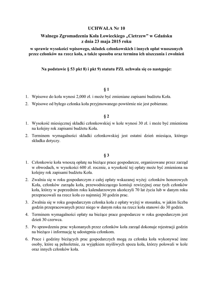 UCHWAŁA Nr 10 Walnego Zgromadzenia Koła Łowieckiego „Cietrzew” w Gdańsku z dnia 23 maja 2015 roku w sprawie wysokości wpisowego, składek członkowskich i innych opłat wnoszonych przez członków na rzecz koła, a także sposobu oraz terminu ich uiszczania i zwolnień Na podstawie § 53 pkt 8) i pkt 9) statutu PZŁ uchwala się co następuje: §1 1. Wpisowe do koła wynosi 2,000 zł. i może być zmieniane zapisami budżetu Koła. 2. Wpisowe od byłego członka koła przyjmowanego powtórnie nie jest pobierane. §2 1. Wysokość miesięcznej składki członkowskiej w kole wynosi 30 zł. i może być zmieniona na kolejny rok zapisami budżetu Koła. 2. Terminem wymagalności składki członkowskiej jest ostatni dzień miesiąca, którego składka dotyczy. §3 1. Członkowie koła wnoszą opłatę na bieżące prace gospodarcze, organizowane przez zarząd w obwodach, w wysokości 600 zł. rocznie, a wysokość tej opłaty może być zmieniona na kolejny rok zapisami budżetu Koła. 2. Zwalnia się w roku gospodarczym z całej opłaty wskazanej wyżej: członków honorowych Koła, członków zarządu koła, przewodniczącego komisji rewizyjnej oraz tych członków koła, którzy w poprzednim roku kalendarzowym ukończyli 70 lat życia lub w danym roku przepracowali na rzecz koła co najmniej 30 godzin prac. 3. Zwalnia się w roku gospodarczym członka koła z opłaty wyżej w stosunku, w jakim liczba godzin przepracowanych przez niego w danym roku na rzecz koła stanowi do 30 godzin. 4. Terminem wymagalności opłaty na bieżące prace gospodarcze w roku gospodarczym jest dzień 30 czerwca. 5. Po sprawdzeniu prac wykonanych przez członków koła zarząd dokonuje rejestracji godzin na bieżąco i informację tę udostępnia członkom. 6. Prace i godziny bieżących prac gospodarczych mogą za członka koła wykonywać inne osoby, które są pełnoletnie, za wyjątkiem myśliwych spoza koła, którzy polowali w kole oraz innych członków koła. §4 1. Członkowie koła wnoszą opłatę na koszty zimowego dokarmiania, organizowane przez zarząd w obwodach, w wysokości 100 zł. rocznie, a wysokość tej opłaty może być zmieniona na kolejny rok zapisami budżetu Koła. 2. Zwalnia się w roku gospodarczym z całej opłaty wskazanej wyżej: członków honorowych Koła, członków zarządu koła, przewodniczącego komisji rewizyjnej oraz tych członków koła, którzy w poprzednim roku kalendarzowym ukończyli 70 lat życia lub w danym roku gospodarczym brali w dokarmianiu minimum 5 godzin. 3. Zwalnia się w roku gospodarczym członka koła z opłaty wyżej w stosunku, w jakim liczba godzin dokarmiania w danym roku stanowi do 5 godzin. 4. Zarząd może zamiennie zlecić członkom w marcu prace inne niż dokarmianie, w ilości do 5 godzin, które zastąpią dokarmianie. 5. Terminem wymagalności opłaty na koszty zimowego dokarmiania w roku gospodarczym jest dzień 31 marca. 6. Po sprawdzeniu wykonania dokarmiania przez członków koła zarząd dokonuje rejestracji godzin na bieżąco i informację tę udostępnia członkom. 7. Zadanie dokarmiania mogą za członka koła wykonywać inne osoby, które są pełnoletnie, za wyjątkiem myśliwych spoza koła, którzy polowali w kole oraz innych członków koła. Sekretarz Zgromadzenia Przewodniczący Zgromadzenia Krzysztof Sulima Włodzimierz Machczyński
