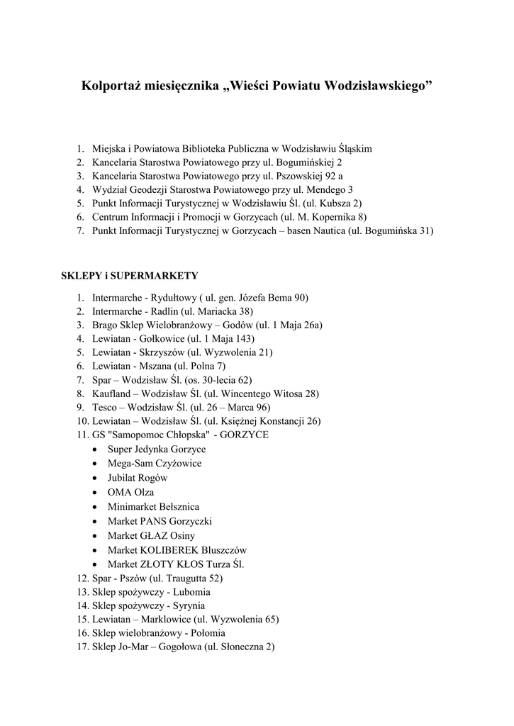 Kolportaż miesięcznika „Wieści Powiatu Wodzisławskiego” 1. 2. 3. 4. 5. 6. 7. Miejska i Powiatowa Biblioteka Publiczna w Wodzisławiu Śląskim Kancelaria Starostwa Powiatowego przy ul. Bogumińskiej 2 Kancelaria Starostwa Powiatowego przy ul. Pszowskiej 92 a Wydział Geodezji Starostwa Powiatowego przy ul. Mendego 3 Punkt Informacji Turystycznej w Wodzisławiu Śl. (ul. Kubsza 2) Centrum Informacji i Promocji w Gorzycach (ul. M. Kopernika 8) Punkt Informacji Turystycznej w Gorzycach – basen Nautica (ul. Bogumińska 31) SKLEPY i SUPERMARKETY 1. Intermarche - Rydułtowy ( ul. gen. Józefa Bema 90) 2. Intermarche - Radlin (ul. Mariacka 38) 3. Brago Sklep Wielobranżowy – Godów (ul. 1 Maja 26a) 4. Lewiatan - Gołkowice (ul. 1 Maja 143) 5. Lewiatan - Skrzyszów (ul. Wyzwolenia 21) 6. Lewiatan - Mszana (ul. Polna 7) 7. Spar – Wodzisław Śl. (os. 30-lecia 62) 8. Kaufland – Wodzisław Śl. (ul. Wincentego Witosa 28) 9. Tesco – Wodzisław Śl. (ul. 26 – Marca 96) 10. Lewiatan – Wodzisław Śl. (ul. Księżnej Konstancji 26) 11. GS "Samopomoc Chłopska" - GORZYCE Super Jedynka Gorzyce Mega-Sam Czyżowice Jubilat Rogów OMA Olza Minimarket Bełsznica Market PANS Gorzyczki Market GŁAZ Osiny Market KOLIBEREK Bluszczów Market ZŁOTY KŁOS Turza Śl. 12. Spar - Pszów (ul. Traugutta 52) 13. Sklep spożywczy - Lubomia 14. Sklep spożywczy - Syrynia 15. Lewiatan – Marklowice (ul. Wyzwolenia 65) 16. Sklep wielobranżowy - Połomia 17. Sklep Jo-Mar – Gogołowa (ul. Słoneczna 2)
