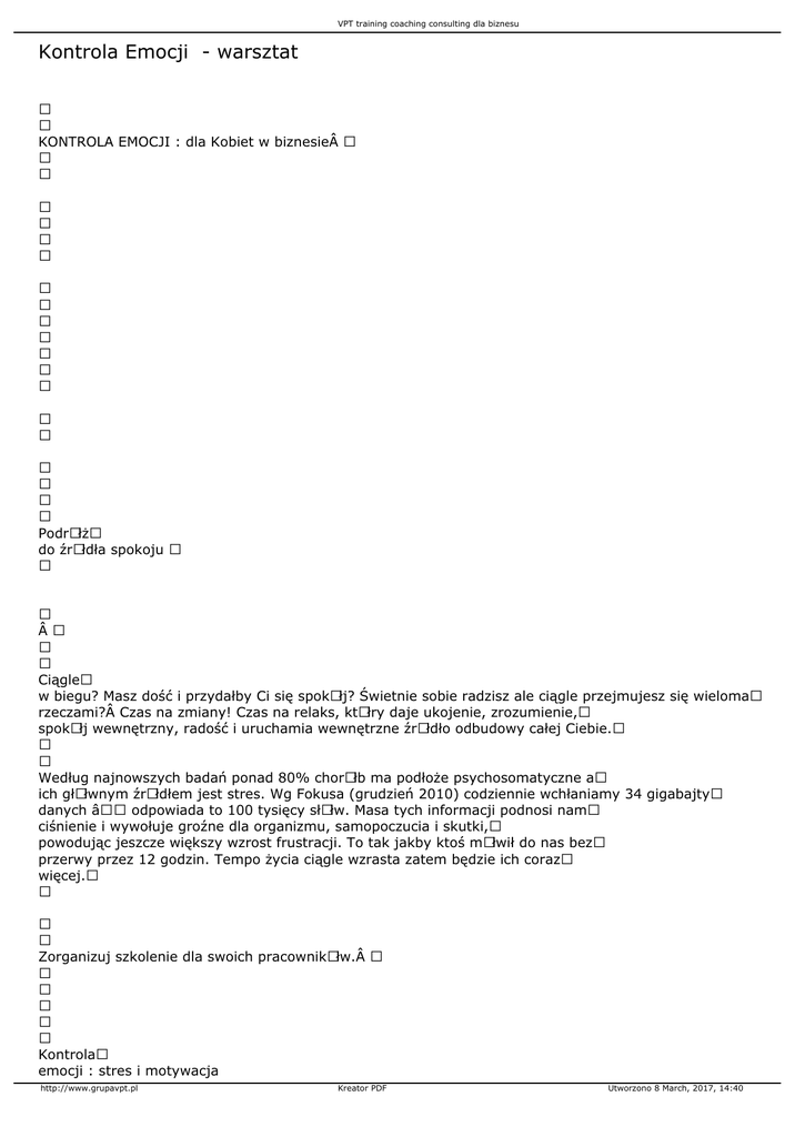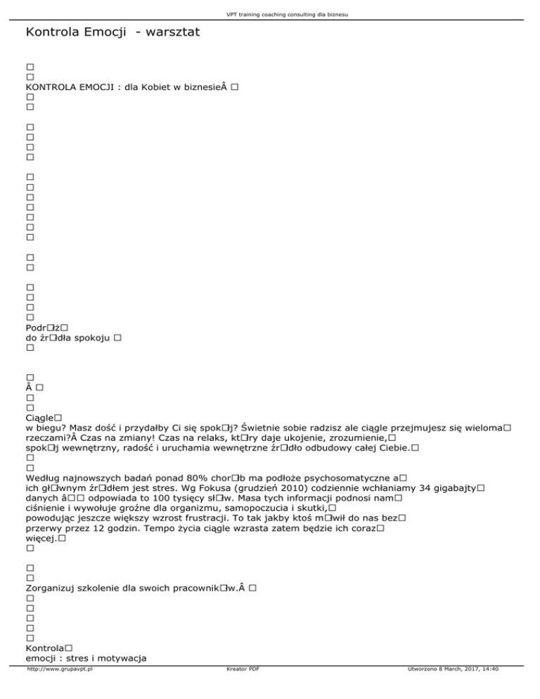 VPT training coaching consulting dla biznesu Kontrola Emocji - warsztat KONTROLA EMOCJI : dla Kobiet w biznesie PodrÃłż do źrÃłdła spokoju  Ciągle w biegu? Masz dość i przydałby Ci się spokÃłj? Świetnie sobie radzisz ale ciągle przejmujesz się wieloma rzeczami? Czas na zmiany! Czas na relaks, ktÃłry daje ukojenie, zrozumienie, spokÃłj wewnętrzny, radość i uruchamia wewnętrzne źrÃłdło odbudowy całej Ciebie. Według najnowszych badań ponad 80% chorÃłb ma podłoże psychosomatyczne a ich głÃłwnym źrÃłdłem jest stres. Wg Fokusa (grudzień 2010) codziennie wchłaniamy 34 gigabajty danych – odpowiada to 100 tysięcy słÃłw. Masa tych informacji podnosi nam ciśnienie i wywołuje groźne dla organizmu, samopoczucia i skutki, powodując jeszcze większy wzrost frustracji. To tak jakby ktoś mÃłwił do nas bez przerwy przez 12 godzin. Tempo życia ciągle wzrasta zatem będzie ich coraz więcej. Zorganizuj szkolenie dla swoich pracownikÃłw. Kontrola emocji : stres i motywacja http://www.grupavpt.pl Kreator PDF Utworzono 8 March, 2017, 14:40 VPT training coaching consulting dla biznesu – techniki relaksacji  Program całodniowy: √  jak umysł przetwarza dane i jak nimi kierować– przełomowe odkrycia √  mowa ciała = lustro emocji; strategie rozpoznawania i redukcji stresu √  inteligencja emocjonalna, a radzenie sobie w sytuacjach stresogennych   u kobiet √  narzędzia radzenia sobie ze stresem stosowane w wystąpieniach publicznych, negocjacjach i rozmowach    z konfliktowymi i toksycznymi ludźmi √  głęboki stan relaksu i motywacji √  wywoływanie i wzmacnianie pozytywnych stanÃłw emocjonalnych ASK √  zarządzanie emocjami - TLT  Co zyskujesz: √  nauczysz się jak szybko zmieniać negatywne sytuacje na pozytywne emocje √  doświadczysz głębokiego relaksu, odprężenia i przypływu silnej energii motywacji http://www.grupavpt.pl Kreator PDF Utworzono 8 March, 2017, 14:40 VPT training coaching consulting dla biznesu √  dowiesz się jak być bardziej świadoma swoich emocji i jak je kontrolować √  poznasz techniki redukcji stresu, relaksacji i odprężenia √  uruchomisz potężną dawkę pozytywnych emocji √  zrobisz pierwszy krok do pozytywnych zmian w życiu i w relacjach z innymi  Co jeszcze: √  materiały do indywidualnego wykorzystania, przerwy kawowowe i wiele wspaniałych kobiet.  Metody: Najskuteczniejsze metody redukcji i kontroli stresu wykorzystywane w biznesie, coachingu, trenowaniu mÃłwcÃłw i sportowcÃłw, gdzie umiejętność wpływania na emocje, decyduje o efekcie i sukcesie. Forma szkolenia ma charakter warsztatowy z elementami coaching i dobrej zabawy, specjalnie wyselekcjonowanych dla kobiet.  Dołącz do nas   Violetta Post http://www.grupavpt.pl Kreator PDF Utworzono 8 March, 2017, 14:40 VPT training coaching consulting dla biznesu Business coach Coach ICC Międzynarodowy certyfikat Coach’a wydany przez International Coaching Community, certyfikowany trener NLP, Master Practitioner NLP in Neurolingwistic Insitut.                                   Â W biznesie od ponad 15 lat. Właścicielka firmy szkoleniowo coachingowej GRUPA VPT. Autorka projektÃłw coachingowych i treningÃłw dla biznesu oraz osÃłb indywidualnych w zakresie perswazji, psychologii zarządzania, HR. Coach wyższej kadry menedżerskiej (blisko 20 właścicieli firm). Coach projektu „Kobieta spełniona w biznesie― TVP2. Członek- założyciel Polskiej Izby Coachingu, Ery Kobiet i vipcoachingu.pl. Uczyła się u międzynarodowych mistrzÃłw rozwoju osobistego jak: Frank Farelly, Suzi Smith, Robert Dilts, Braian Tracy. WspÃłłpracuje jako ekspert coach dla TVN. Prywatnie szczęśliwa mama Olgierda i Oliwii.  Zapraszam serdecznie na podrÃłż do źrÃłdła spokoju Violetta Post ..... bo źrÃłdło energii jest w Tobie http://www.grupavpt.pl Kreator PDF Utworzono 8 March, 2017, 14:40
