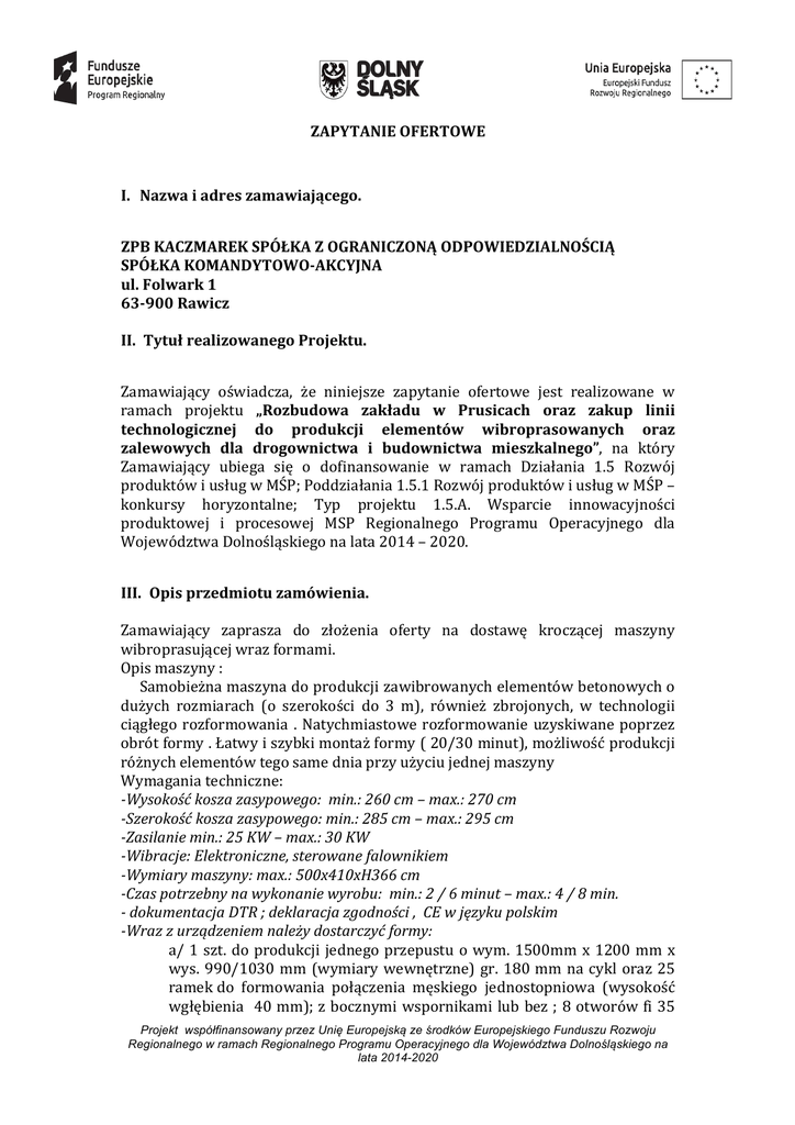 ZAPYTANIEOFERTOWE I. Nazwaiadreszamawiającego. ZPBKACZMAREKSPÓŁKAZOGRANICZONĄODPOWIEDZIALNOŚCIĄ SPÓŁKAKOMANDYTOWO-AKCYJNA ul.Folwark1 63-900Rawicz II. TytułrealizowanegoProjektu. Zamawiający oświadcza, że niniejsze zapytanie ofertowe jest realizowane w ramach projektu „Rozbudowa zakładu w Prusicach oraz zakup linii technologicznej do produkcji elementów wibroprasowanych oraz zalewowych dla drogownictwa i budownictwa mieszkalnego”, na który Zamawiający ubiega się o dofinansowanie w ramach Działania 1.5 Rozwój produktówiusługwMŚP;Poddziałania1.5.1RozwójproduktówiusługwMŚP– konkursy horyzontalne; Typ projektu 1.5.A. Wsparcie innowacyjności produktowej i procesowej MSP Regionalnego Programu Operacyjnego dla WojewództwaDolnośląskiegonalata2014–2020. III. Opisprzedmiotuzamówienia. Zamawiający zaprasza do złożenia oferty na dostawę kroczącej maszyny wibroprasującejwrazformami. Opismaszyny: Samobieżnamaszynadoprodukcjizawibrowanychelementówbetonowycho dużych rozmiarach (o szerokości do 3 m), również zbrojonych, w technologii ciągłego rozformowania . Natychmiastowe rozformowanie uzyskiwane poprzez obrótformy.Łatwyiszybkimontażformy(20/30minut),możliwośćprodukcji różnychelementówtegosamedniaprzyużyciujednejmaszyny Wymaganiatechniczne: -Wysokośćkoszazasypowego:min.:260cm–max.:270cm -Szerokośćkoszazasypowego:min.:285cm–max.:295cm -Zasilaniemin.:25KW–max.:30KW -Wibracje:Elektroniczne,sterowanefalownikiem -Wymiarymaszyny:max.:500x410xH366cm -Czaspotrzebnynawykonaniewyrobu:min.:2/6minut–max.:4/8min. -dokumentacjaDTR;deklaracjazgodności,CEwjęzykupolskim -Wrazzurządzeniemnależydostarczyćformy: a/1szt.doprodukcjijednegoprzepustuowym.1500mmx1200mmx wys. 990/1030 mm (wymiary wewnętrzne) gr. 180 mm na cykl oraz 25 ramekdo formowania połączenia męskiego jednostopniowa (wysokość wgłębienia40mm);zbocznymiwspornikamilubbez;8otworówfi35 Projekt współfinansowany przez Unię Europejską ze środków Europejskiego Funduszu Rozwoju Regionalnego w ramach Regionalnego Programu Operacyjnego dla Województwa Dolnośląskiego na lata 2014-2020 mm;zamknięciadoramekformującychmęskiepołączenie;kpl.osprzętu formy b/1szt.doprodukcjijednegoprzepustuowym.1500mmx1500mmx wys. 990/1030 mm (wymiary wewnętrzne) gr. 180 mm na cykl oraz 25 ramekdo formowania połączenia męskiego jednostopniowa (wysokość wgłębienia40mm);zbocznymiwspornikamilubbez;8otworówfi35 mm;zamknięciadoramekformującychmęskiepołaczenie;kpl.osprzętu formy c/1szt.doprodukcjiczterechrurowym.Ø500mmxwys.1000mmgr. 55 mm na cykl oraz 168 obręczy do formowania połączenia męskiego(połowagrubościścianki25mm); zamknięcia do obręczy doformowaniapołączeniamęskiego;4wkładkiredukcyjne do redukcji wysokościrurdo500mm;kpl.osprzętuformy d/1szt.doprodukcjiośmiukorytekEOGowym.380mmxh190mmx L510mm– gr. 50 mm na cykl ; boki otwierające się pionowo za pomocą cylindrów hydraulicznych ; żebra wykonane za pomocą cylindrów hydraulicznych ; zamki do mocowania blatów stalowych o wym.3100mmx1100mm;kpl.osprzętuformy W przypadku, gdy w opisie przedmiotu zamówienia użyto nazw własnych urządzeń, oprogramowania lub innych rozwiązań technicznych oferent może zaproponować inne urządzenia, oprogramowanie lub rozwiązania techniczne o równoważnych parametrach technicznych, jakościowych i użytkowych. Podobnie oferent może zaproponować w zakresie wymaganych parametrów szczegółowych technicznych inne rozwiązania równoważne funkcjonalnie i jakościowo. IV. Termin, sposób i miejsce realizacji zamówienia oraz termin, miejsce i sposóbskładaniaofertiokreśleniepostępowaniawyborudostawcy. 1. Wykonawcabędziezobowiązanydorealizacjizamówienianajpóźniejdodnia 30.04.2016, do miejsca realizacji Projektu (miejsce dostawy i montażu) – województwodolnośląskie,Wszemirów100,55-110Prusice. 2. Ofertę będąca odpowiedzią na niniejsze zapytanie należy dostarczyć na załączonymformularzu(stanowiącymzał.nr1)dodnia28.01.2016r.dogodziny 1000dobiuraZamawiającegoweWszemirowie100,55-110Prusicelubwysłać zeskanowanąofertę[email protected] 3. Do formularza ofertowego, o którym mowa w pkt. 1 należy dołączyć specyfikacjętechnicznązktórejwyraźniebędziemusiałowynikaćwjakisposób są spełnione warunki techniczne określone w zapytaniu opisane w pkt. III. ZałączniktenmusibyćdokumentempapierowymdołączonymdoFormularza. Projekt współfinansowany przez Unię Europejską ze środków Europejskiego Funduszu Rozwoju Regionalnego w ramach Regionalnego Programu Operacyjnego dla Województwa Dolnośląskiego na lata 2014-2020 4. Nie dopuszcza się składania ofert cząstkowych (na mniej niż wszystkie urządzeniaobjęteniniejszymZapytaniem). V. Rodzajeorazopiskryteriów,którymibędziesiękierowałZamawiającyi ichpunktacja. 1.Kryteria: a/Kryteriaformalne,którychniespełnieniepowodujeodrzucenieoferty: -Formularzofertowyniezostałwypełnionywcałości. - Oferta nie jest zgodna z opisem przedmiotu zamówienia, w szczególności w zakresie oferowanych parametrów technicznych i/lub terminów (oferta musi byćzrealizowananajpóźniejdodnia30.04.2016r.) -Okresoferowanejgwarancjinacałośćbądźczęśćzamówieniajestkrótszyniż1 rok. b/Kryteriapunktowe: Nazwakryterium Opis kryterium i sposobu naliczania Maksymalna punktów ilość punktów 1 Długość gwarancji 2 Terminrealizacji oferty Minimalna gwarancja zgodnie z pkt. 20 a/ kryteriów wynosi 12 miesięcy. Punktowane będą wyłącznie zobowiązania do objęcia urządzenia gwarancją na okres dłuższy niż 12 miesięcy.Sposóbobliczaniapunktów: 𝑂𝑜 𝑋= ×20 𝑂𝑚𝑎𝑥 Oo–okresofertyrozpatrywanej Omax–okresmaksymalnywskazanyw ofertach spełniających kryteria formalne Np. W rozpatrywanej ofercie oferent zaproponował 13 miesięczny okres gwarancji. Maksymalny okres gwarancjizaproponowanywofertach spełniających kryteria formalne wynosi 24 miesiące. W takim przypadku wyliczenie