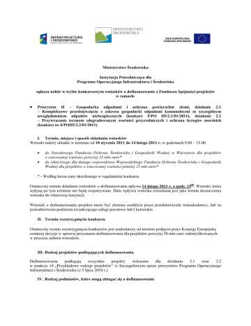 UNIA EUROPEJSKA FUNDUSZ SPÓJNOŚCI Ministerstwo Środowiska Instytucja Pośrednicząca dla Programu Operacyjnego Infrastruktura i Środowisko ogłasza nabór w trybie konkursowym wniosków o dofinansowanie z Funduszu Spójności projektów w ramach: Priorytetu II – Gospodarka odpadami i ochrona powierzchni ziemi, działanie 2.1 – Kompleksowe przedsięwzięcia z zakresu gospodarki odpadami komunalnymi ze szczególnym uwzględnieniem odpadów niebezpiecznych (konkurs 5/PO IiŚ/2.1/01/2011), działanie 2.2 – Przywracanie terenom zdegradowanym wartości przyrodniczych i ochrona brzegów morskich (konkurs nr 6/POIiŚ/2.2/01/2011) I. Termin, miejsce i sposób składania wniosków Wnioski należy składać w terminie od 10 stycznia 2011 do 14 lutego 2011 r. w godzinach 9.00 – 15.00. do Narodowego Funduszu Ochrony Środowiska i Gospodarki Wodnej w Warszawie dla projektów o szacowanej wartości powyżej 25 mln euro* do właściwego dla danego województwa Wojewódzkiego Funduszu Ochrony Środowiska i Gospodarki Wodnej dla projektów o szacowanej wartości poniżej 25 mln euro* * - Według kursu euro określonego w regulaminie konkursu Ostateczny termin składania wniosków o dofinansowanie upływa 14 lutego 2011 r. o godz. 1500. Wnioski, które wpłyną po tym terminie nie będą rozpatrywane. Data wpływu wniosku rozumiana jest jako termin dostarczenia wniosku do właściwej instytucji. Wniosek o dofinansowanie projektu może być złożony osobiście przez przedstawiciela wnioskodawcy, lub za pośrednictwem podmiotu świadczącego usługi pocztowe lub/i kurierskie. II. Termin rozstrzygnięcia konkursu Ostateczny termin rozstrzygnięcia konkursów jest uzależniony od terminu podjęcia przez Komisję Europejską ostatniej decyzji w sprawie przyznania dofinansowania dla projektów powyżej 50 mln euro zidentyfikowanych w procesie naboru wniosków. III. Rodzaj projektów podlegających dofinansowaniu Dofinansowaniu podlegają wszystkie projekty wskazane dla działania 2.1 oraz 2.2 w punkcie 14 „Przykładowe rodzaje projektów” w Szczegółowym opisie priorytetów Programu Operacyjnego Infrastruktura i Środowisko (z 5 lipca 2010 r.) IV. Rodzaj podmiotów, które mogą ubiegać się o dofinansowanie Uprawnionymi do składania wniosków są podmioty wskazane jako beneficjenci dla działania 2.1 oraz 2.2 w punkcie 17a „Typ beneficjentów” w Szczegółowym opisie priorytetów Programu Operacyjnego Infrastruktura i Środowisko (z 5 lipca 2010 r.) V. Kryteria wyboru projektów Kryteria wyboru projektów określone są w Załączniku nr 1 do „Szczegółowego opisu priorytetów PO Infrastruktura i Środowisko” i zostały zatwierdzone przez Komitet Monitorujący PO Infrastruktura i Środowisko w dniu 15 czerwca 2010 r. VI. Kwota środków przeznaczona na dofinansowanie projektów Kwota środków przeznaczona na dofinansowanie projektów w ramach konkursu wynosi dla: Priorytetu II - Gospodarka odpadami i ochrona powierzchni ziemi, działanie 2.1 – Kompleksowe przedsięwzięcia z zakresu gospodarki odpadami komunalnymi ze szczególnym uwzględnieniem odpadów niebezpiecznych – 30 mln euro z Funduszu Spójności (konkurs 5/PO IIiŚ/2.1/01/2011 - istnieje możliwość zwiększenia kwoty w trakcie konkursu), działanie 2.2 – Przywracanie terenom zdegradowanym wartości przyrodniczych i ochrona brzegów morskich - 40 mln euro z Funduszu Spójności (konkurs nr 6/POIiŚ/2.2/01/2011 - istnieje możliwość zwiększenia kwoty w trakcie konkursu) VII. Poziom dofinansowania projektów Poziom współfinansowania projektów w ramach działania 2.1 oraz 2.2 ze środków Funduszu Spójności wynosi maksymalnie 85% wartości wydatków kwalifikowanych projektu. Niemniej jednak poziom dofinansowania właściwy dla danego projektu w ramach działania 2.1 oraz 2.2 zostanie każdorazowo określony zgodnie z Wytycznymi w zakresie wybranych zagadnień związanych z przygotowaniem projektów inwestycyjnych, w tym projektów generujących dochód VIII. Maksymalna kwota dofinansowania projektu Szczegółowy opis priorytetów Programu Operacyjnego Infrastruktura i Środowisko (z 5 lipca 2010 r.) nie przewiduje maksymalnej kwoty dofinansowania projektu. Niemniej jednak, każdorazowo kwota dofinansowania dla projektu musi być obliczona zgodnie z Wytycznymi w zakresie wybranych zagadnień związanych z przygotowaniem projektów inwestycyjnych, w tym projektów generujących dochód IX. Wzór wniosku o dofinansowanie projektu Wzór wniosku o dofinansowanie jest umieszczony tutaj. X. Wzór umowy o dofinansowanie Wzór umowy o dofinansowanie. Poszczególne elementy umowy będą każdorazowo doprecyzowywane na etapie negocjacji jej zapisów z beneficjentem. XI. Informacja o środkach odwoławczych Informacje o dostępnych środkach odwoławczych przysługujących wnioskodawcy w ramach systemu realizacji Programu Operacyjnego Infrastruktura i Środowisko znajdują się w Regulaminie konkursu. XII. Lista wymaganych załączników Spis wymaganych załączników znajduje się w Regulaminie konkursu. Wnioski o dofinansowanie projektów muszą być sporządzone z uwzględnieniem następujących dokumentów: Regulamin konkursu (konkurs nr 5/POIiŚ/2.1/01/2011), (konkurs nr 6/POIiŚ/2.2/01/2011) wraz z regulaminem zespołu ds. oceny projektu Wzór wniosku o dofinansowanie Instrukcja wypełnienia wniosku Szczegółowy opis priorytetów Programu Operacyjnego Infrastruktura i Środowisko (z dnia 5 lipca 2011 r.) Harmonogram realizacji konkursu Wzory list sprawdzających do wniosku o dofinansowanie: II osi priorytetowej - Gospodarka odpadami i ochrona powierzchni ziemi, działanie 2.1. Kompleksowe przedsięwzięcia z zakresu gospodarki odpadami komunalnymi ze szczególnym uwzględnieniem odpadów niebezpiecznych. 1. 2. 3. II oś 2.1.- Lista sprawdzająca do oceny formalnej. II oś 2.1.- Lista sprawdzająca do oceny merytorycznej I stopnia. II oś 2.1.- Lista sprawdzająca do oceny merytorycznej II stopnia. a. Załącznik n