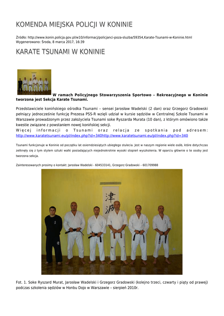 KOMENDA MIEJSKA POLICJI W KONINIE Źródło: http://www.konin.policja.gov.pl/w10/informacj/policjanci-poza-sluzba/59354,Karate-Tsunami-w-Koninie.html Wygenerowano: Środa, 8 marca 2017, 16:39 KARATE TSUNAMI W KONINIE W ramach Policyjnego Stowarzyszenia Sportowo – Rekreacyjnego w Koninie tworzona jest Sekcja Karate Tsunami. Przedstawiciele konińskiego ośrodka Tsunami – sensei Jarosław Wadelski (2 dan) oraz Grzegorz Gradowski pełniący jednocześnie funkcję Prezesa PSS-R wzięli udział w kursie sędziów w Centralnej Szkole Tsunami w Warszawie prowadzonym przez założyciela Tsunami soke Ryszarda Murata (10 dan), z którym omówiono także kwestie związane z powstaniem nowej konińskiej sekcji. Więcej informacji o Tsunami oraz relacja ze spotkania pod adresem: http://www.karatetsunami.eu/pl/index.php?id=340http://www.karatetsunami.eu/pl/index.php?id=340 Tsunami funkcjonuje w Koninie od początku lat osiemdziesiątych ubiegłego stulecia. Jest w naszym regionie wiele osób, które dotychczas zetknęły się z tym stylem sztuki walki posiadających niejednokrotnie wysoki stopień wyszkolenia. W oparciu głównie o te osoby jest tworzona sekcja. Zainteresowanych prosimy o kontakt: Jarosław Wadelski - 604533141, Grzegorz Gradowski – 601709988 Fot. 1. Soke Ryszard Murat, Jarosław Wadelski i Grzegorz Gradowski (kolejno trzeci, czwarty i piąty od prawej) podczas szkolenia sędziów w Honbu Dojo w Warszawie – sierpień 2010r. Fot. 2,3,4. Jarosław Wadelski (czerwony) i Grzegorz Gradowski (niebieski) w trakcie jednej z konkurencji – Full Contact Kumite Autor: Grzegorz Gradowski Ocena: 0/5 (0) Tweetnij