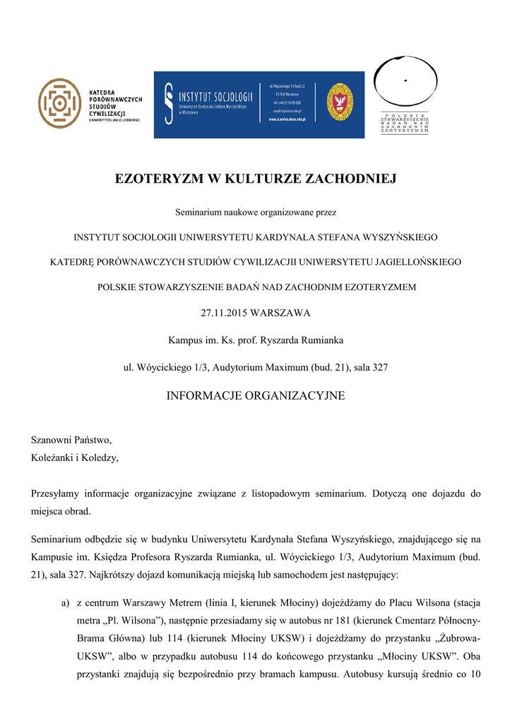 EZOTERYZM W KULTURZE ZACHODNIEJ Seminarium naukowe organizowane przez INSTYTUT SOCJOLOGII UNIWERSYTETU KARDYNAŁA STEFANA WYSZYŃSKIEGO KATEDRĘ PORÓWNAWCZYCH STUDIÓW CYWILIZACJII UNIWERSYTETU JAGIELLOŃSKIEGO POLSKIE STOWARZYSZENIE BADAŃ NAD ZACHODNIM EZOTERYZMEM 27.11.2015 WARSZAWA Kampus im. Ks. prof. Ryszarda Rumianka ul. Wóycickiego 1/3, Audytorium Maximum (bud. 21), sala 327 INFORMACJE ORGANIZACYJNE Szanowni Państwo, Koleżanki i Koledzy, Przesyłamy informacje organizacyjne związane z listopadowym seminarium. Dotyczą one dojazdu do miejsca obrad. Seminarium odbędzie się w budynku Uniwersytetu Kardynała Stefana Wyszyńskiego, znajdującego się na Kampusie im. Księdza Profesora Ryszarda Rumianka, ul. Wóycickiego 1/3, Audytorium Maximum (bud. 21), sala 327. Najkrótszy dojazd komunikacją miejską lub samochodem jest następujący: a) z centrum Warszawy Metrem (linia I, kierunek Młociny) dojeżdżamy do Placu Wilsona (stacja metra „Pl. Wilsona”), następnie przesiadamy się w autobus nr 181 (kierunek Cmentarz PółnocnyBrama Główna) lub 114 (kierunek Młociny UKSW) i dojeżdżamy do przystanku „ŻubrowaUKSW”, albo w przypadku autobusu 114 do końcowego przystanku „Młociny UKSW”. Oba przystanki znajdują się bezpośrednio przy bramach kampusu. Autobusy kursują średnio co 10 minut, a przejazd zajmuje około 25 minut. Uwaga! Jadąc autobusem 181 nie wysiadamy na wcześniejszym przystanku „UKSW”, który jest przy Kampusie na ulicy Dewajtis, b) z centrum Warszawy Metrem (linia I, kierunek Młociny) dojeżdżamy do stacji końcowej „Młociny”, następnie przesiadamy się w autobus nr 114 (kierunek Młociny - UKSW) i dojeżdżamy do przystanku „Żubrowa-UKSW” lub „Młociny UKSW” (przystanek końcowy). Autobus kursuje średnio co 10 minut, a przejazd zajmuje około 10 minut. Rozkład jazdy autobusów z poszczególnych przystanków znajdą Państwo na stronie: http://www.ztm.waw.pl/, c) dojazd samochodem. Kampus znajduje się przy trasie wylotowej z Warszawy w kierunku Gdańska (E7/S7). Z Centrum Warszawy jedziemy Wisłostradą (E7) w kierunku północnym. Na drugich światłach za restauracją McDonald’s, na skrzyżowaniu z ulicą Wóycickiego skręcamy w lewo i po około 100 metrach ponownie skręcamy w lewo w bramę Kampusu (widoczny jest przez nią budynek Auditorium Maksimum). Zapraszamy!