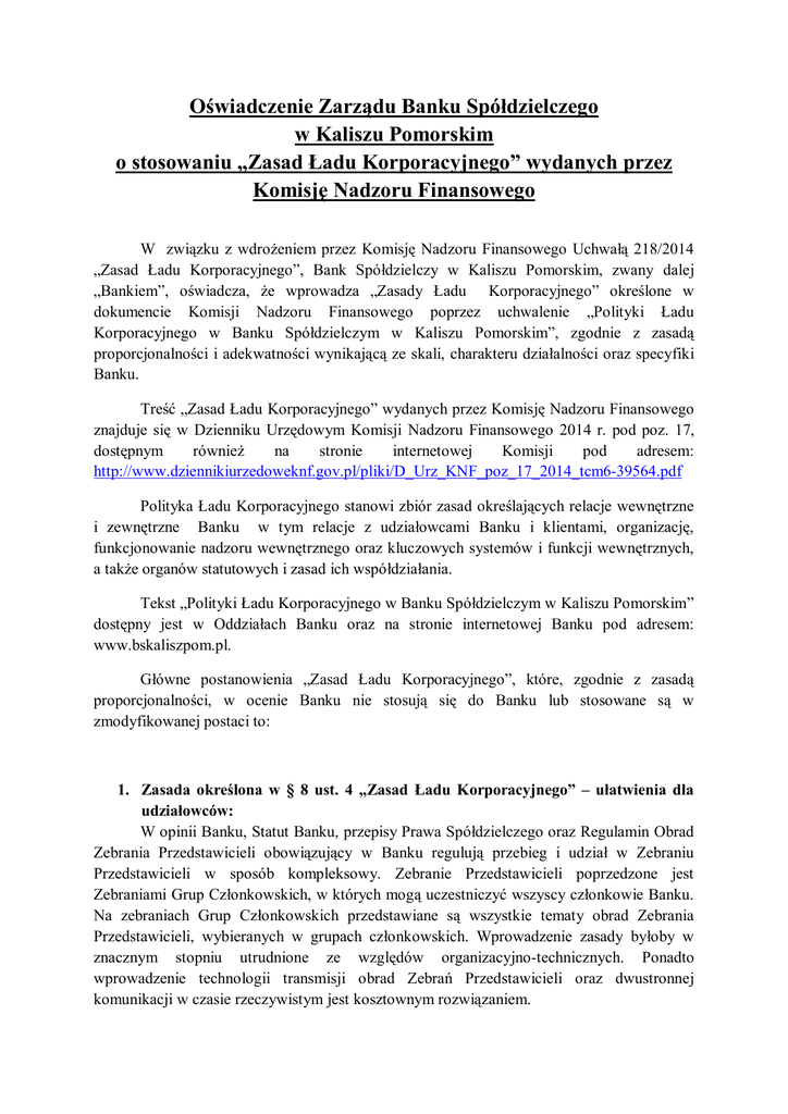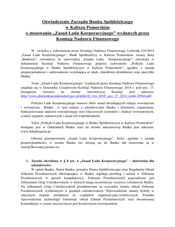 Oświadczenie Zarządu Banku Spółdzielczego w Kaliszu Pomorskim o stosowaniu „Zasad Ładu Korporacyjnego” wydanych przez Komisję Nadzoru Finansowego W związku z wdrożeniem przez Komisję Nadzoru Finansowego Uchwałą 218/2014 „Zasad Ładu Korporacyjnego”, Bank Spółdzielczy w Kaliszu Pomorskim, zwany dalej „Bankiem”, oświadcza, że wprowadza „Zasady Ładu Korporacyjnego” określone w dokumencie Komisji Nadzoru Finansowego poprzez uchwalenie „Polityki Ładu Korporacyjnego w Banku Spółdzielczym w Kaliszu Pomorskim”, zgodnie z zasadą proporcjonalności i adekwatności wynikającą ze skali, charakteru działalności oraz specyfiki Banku. Treść „Zasad Ładu Korporacyjnego” wydanych przez Komisję Nadzoru Finansowego znajduje się w Dzienniku Urzędowym Komisji Nadzoru Finansowego 2014 r. pod poz. 17, dostępnym również na stronie internetowej Komisji pod adresem: http://www.dziennikiurzedoweknf.gov.pl/pliki/D_Urz_KNF_poz_17_2014_tcm6-39564.pdf Polityka Ładu Korporacyjnego stanowi zbiór zasad określających relacje wewnętrzne i zewnętrzne Banku w tym relacje z udziałowcami Banku i klientami, organizację, funkcjonowanie nadzoru wewnętrznego oraz kluczowych systemów i funkcji wewnętrznych, a także organów statutowych i zasad ich współdziałania. Tekst „Polityki Ładu Korporacyjnego w Banku Spółdzielczym w Kaliszu Pomorskim” dostępny jest w Oddziałach Banku oraz na stronie internetowej Banku pod adresem: www.bskaliszpom.pl. Główne postanowienia „Zasad Ładu Korporacyjnego”, które, zgodnie z zasadą proporcjonalności, w ocenie Banku nie stosują się do Banku lub stosowane są w zmodyfikowanej postaci to: 1. Zasada określona w § 8 ust. 4 „Zasad Ładu Korporacyjnego” – ułatwienia dla udziałowców: W opinii Banku, Statut Banku, przepisy Prawa Spółdzielczego oraz Regulamin Obrad Zebrania Przedstawicieli obowiązujący w Banku regulują przebieg i udział w Zebraniu Przedstawicieli w sposób kompleksowy. Zebranie Przedstawicieli poprzedzone jest Zebraniami Grup Członkowskich, w których mogą uczestniczyć wszyscy członkowie Banku. Na zebraniach Grup Członkowskich przedstawiane są wszystkie tematy obrad Zebrania Przedstawicieli, wybieranych w grupach członkowskich. Wprowadzenie zasady byłoby w znacznym stopniu utrudnione ze względów organizacyjno-technicznych. Ponadto wprowadzenie technologii transmisji obrad Zebrań Przedstawicieli oraz dwustronnej komunikacji w czasie rzeczywistym jest kosztownym rozwiązaniem. 2. Zasady określone w § 11 „Zasad Ładu Korporacyjnego” – transakcje z podmiotami powiązanymi. Bank nie posiada podmiotów powiązanych w rozumieniu Ustawy z dnia 29 sierpnia 1997 r. Prawo bankowe, w związku z czym nie wprowadził zapisów dotyczących § 11 „Zasad Ładu Korporacyjnego” do obowiązującej w Banku Polityki. 3. Zasady określone w § 12 ust. 1 i 2 „Zasad Ładu Korporacyjnego” – dokapitalizowanie i dofinansowanie Banku przez udziałowców. W ocenie Banku zasady te nie dotyczą Banku, m.in. ze względu na fakt, iż aktualnie obowiązujące przepisy prawa nie dopuszczają możliwości zaliczenia funduszu udziałowego do funduszy własnych Banku tzw. CET I, co oznacza, iż nie ma możliwości skutecznego dokapitalizowania. W przypadku Banku, który posiada dużą liczbę udziałowców będących osobami fizycznymi, nałożenie na nich dodatkowego obowiązku udzielenia wsparcia finansowego jest niewykonalne. W związku z powyższym Bank postanowił nie stosować zasad określonych w tych przepisach. 4. Zasady określone w § 13 oraz w § 19 „Zasad Ładu Korporacyjnego” – kompetencje członków organów Banku. Bank posiada stosowne regulacje określające kompetencje członków Zarządu i członków Rady Nadzorczej. Bank uznaje, iż realizuje obowiązki określone w tych zasadach poprzez stosowanie powszechnie obowiązujących przepisów prawa, wytycznych, rekomendacji i zaleceń, określonych przez Europejski Urząd Nadzoru Bankowego oraz Komisję Nadzoru Finansowego, regulujących ten obszer, z zachowaniem zasady proporcjonalności. W związku z powyższym Bank przyjął w § 13 ust. 5 oraz w § 19 ust. 5 Polityki jednolitą zasadę, iż: „Bank realizuje powyższe zasady poprzez stosowanie przepisów prawa powszechnie obowiązującego oraz wytycznych, rekomendacji i zaleceń, określonych przez Europejski Urząd Nadzoru Bankowego oraz Komisję Nadzoru Finansowego, regulujących ten obszar, z zachowaniem zasady proporcjonalności”. 5. Zasady określone w § 22 ust. 1 i 2 „Zasad Ładu Korporacyjnego” – niezależność członków organów Banku. Zgodnie z Ustawą z dnia 16 września 1982 r. Prawo spółdzielcze, do organów spółdzielni mają prawo być wybierani jej członkowie. W związku z powyższym, Bank uznaje, iż zasady określone w przytoczonych przepisach, dot. niezależności członków organu nadzorującego, nie znajdują zastosowania do banku funkcjonującego w formie spółdzielni, jakim jest Bank. W związku z powyższym Bank przyjął w § 22 ust. 1 „Polityki Ładu Korporacyjnego w Banku Spółdzielczym w Kaliszu Pomorskim” zasadę, iż: „Do składu Rady Nadzorczej wybierani są udziałowcy Banku, zgodnie z Prawem spółdzielczym.” 6. Zasady określone w „Zasadach Ładu Korporacyjnego” dot. komitetu audytu oraz komórki audytu. Zgodnie z art. 86 ust. 2 pkt 4) Ustawy z dnia 7 maja 2009 r. o biegłych rewidentach i ich samorządzie, podmiotach uprawnionych do badania sprawozdań finansowych oraz o nadzorze publicznym, banki spółdzielcze nie mają obowiązku powoływania komitetu audytu, w związku z czym postanowienia Zasad w tym zakresie nie stosują się do Banku. W związku z faktem, iż Bank, zgodnie z art. 10 Prawa bankowego powierzył wykonywanie audytu bankowi zrzeszającemu – SGB-Bank S.A. w Poznaniu, w Banku nie ma wyodrębnionej komórki audytu wewnętrznego, a co za tym idzie osoby nią kierującą. W związku z powyższ
