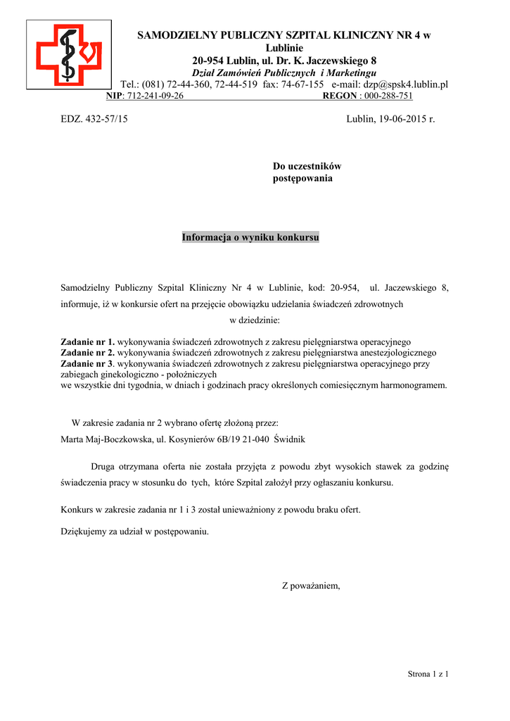 SAMODZIELNY PUBLICZNY SZPITAL KLINICZNY NR 4 w Lublinie 20-954 Lublin, ul. Dr. K. Jaczewskiego 8 Dział Zamówień Publicznych i Marketingu Tel.: (081) 72-44-360, 72-44-519 fax: 74-67-155 e-mail: [email protected] NIP: 712-241-09-26 REGON : 000-288-751 EDZ. 432-57/15 Lublin, 19-06-2015 r. Do uczestników postępowania Informacja o wyniku konkursu Samodzielny Publiczny Szpital Kliniczny Nr 4 w Lublinie, kod: 20-954, ul. Jaczewskiego 8, informuje, iż w konkursie ofert na przejęcie obowiązku udzielania świadczeń zdrowotnych w dziedzinie: Zadanie nr 1. wykonywania świadczeń zdrowotnych z zakresu pielęgniarstwa operacyjnego Zadanie nr 2. wykonywania świadczeń zdrowotnych z zakresu pielęgniarstwa anestezjologicznego Zadanie nr 3. wykonywania świadczeń zdrowotnych z zakresu pielęgniarstwa operacyjnego przy zabiegach ginekologiczno - położniczych we wszystkie dni tygodnia, w dniach i godzinach pracy określonych comiesięcznym harmonogramem. W zakresie zadania nr 2 wybrano ofertę złożoną przez: Marta Maj-Boczkowska, ul. Kosynierów 6B/19 21-040 Świdnik Druga otrzymana oferta nie została przyjęta z powodu zbyt wysokich stawek za godzinę świadczenia pracy w stosunku do tych, które Szpital założył przy ogłaszaniu konkursu. Konkurs w zakresie zadania nr 1 i 3 został unieważniony z powodu braku ofert. Dziękujemy za udział w postępowaniu. Z poważaniem, Strona 1 z 1