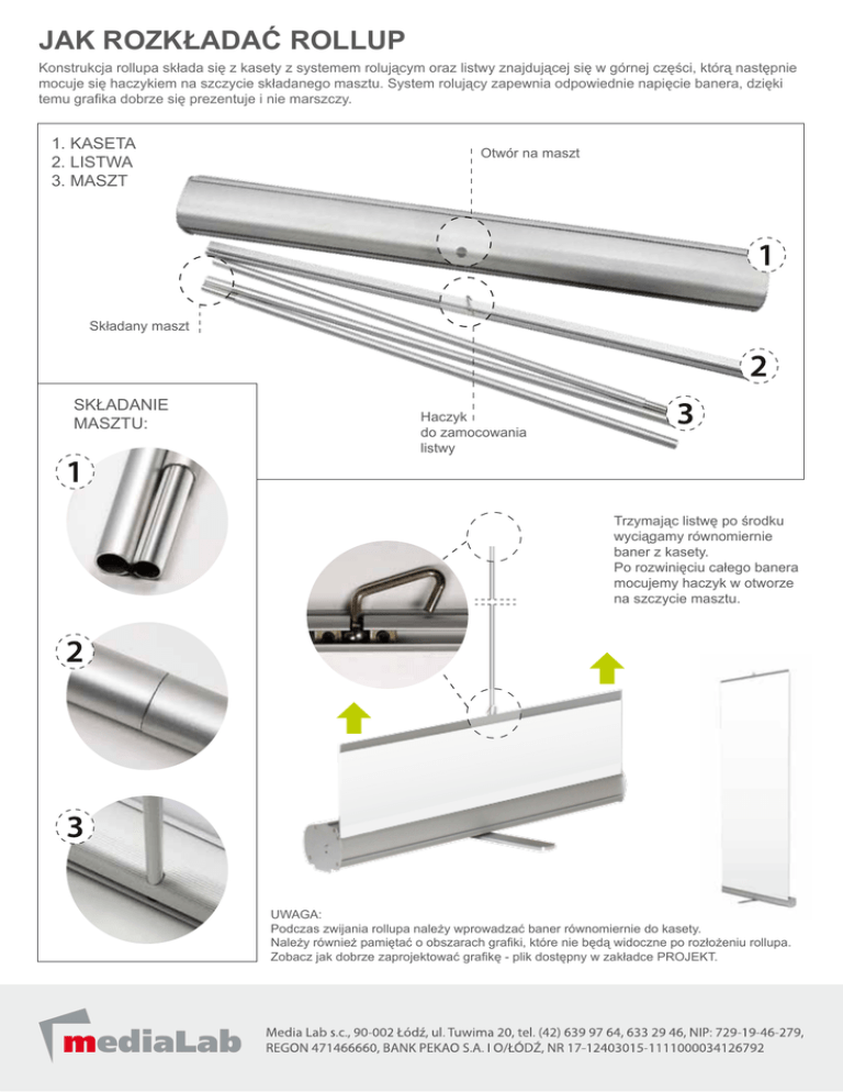 JAK ROZKŁADAĆ ROLLUP Konstrukcja rollupa składa się z kasety z systemem rolującym oraz listwy znajdującej się w górnej części, którą następnie mocuje się haczykiem na szczycie składanego masztu. System rolujący zapewnia odpowiednie napięcie banera, dzięki temu grafika dobrze się prezentuje i nie marszczy. 1. KASETA 2. LISTWA 3. MASZT Otwór na maszt Składany maszt SKŁADANIE MASZTU: Haczyk do zamocowania listwy Trzymając listwę po środku wyciągamy równomiernie baner z kasety. Po rozwinięciu całego banera mocujemy haczyk w otworze na szczycie masztu. UWAGA: Podczas zwijania rollupa należy wprowadzać baner równomiernie do kasety. Należy również pamiętać o obszarach grafiki, które nie będą widoczne po rozłożeniu rollupa. Zobacz jak dobrze zaprojektować grafikę - plik dostępny w zakładce PROJEKT.