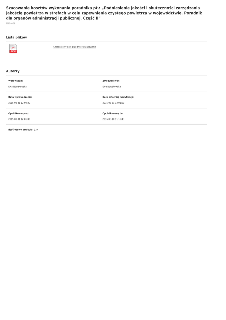 Szacowanie kosztów wykonania poradnika pt.: „Podniesienie jakości i skuteczności zarządzania jakością powietrza w strefach w celu zapewnienia czystego powietrza w województwie. Poradnik dla organów administracji publicznej. Część II” 2015-08-31 Lista plików Szczegółowy opis przedmiotu szacowania Autorzy Wprowadził: Zmodyfikował: Ewa Nowakowska Ewa Nowakowska Data wprowadzenia: Data ostatniej modyfikacji: 2015-08-31 12:00:29 2015-08-31 12:01:50 Opublikowany od: Opublikowany do: 2015-08-31 12:01:00 2016-08-10 11:16:43 Ilość odsłon artykułu: 337