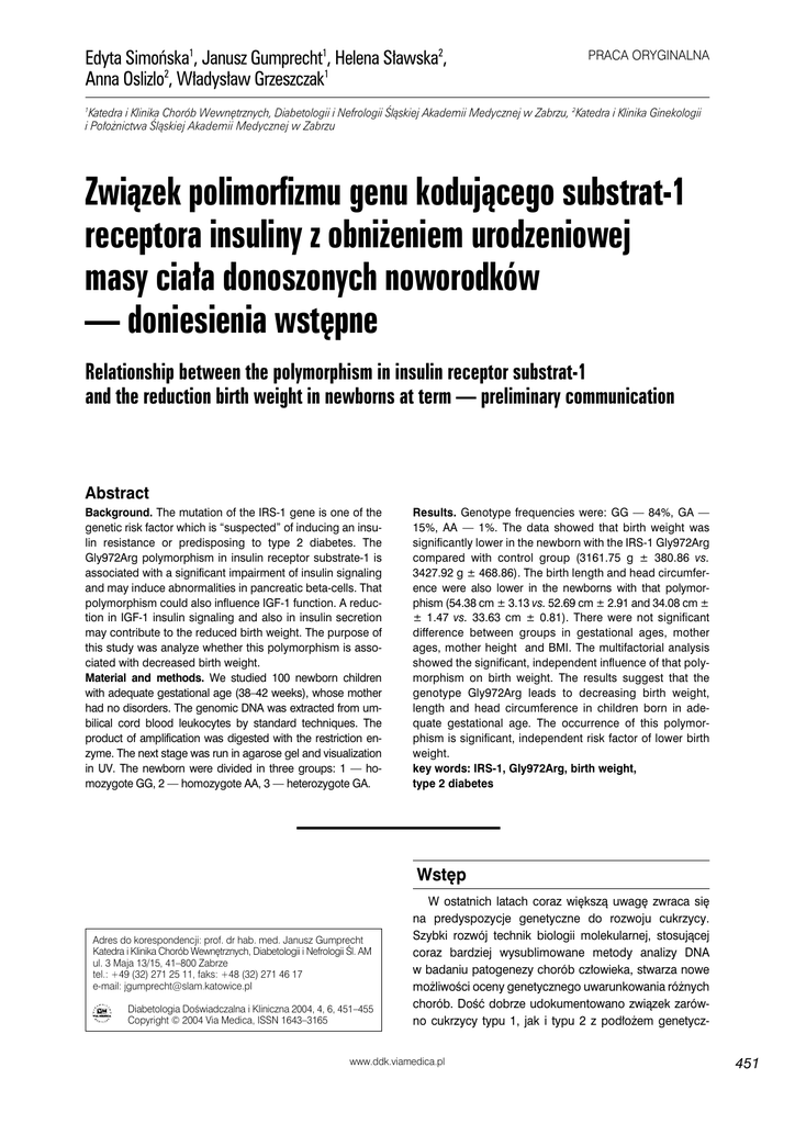 Edyta Simońska1, Janusz Gumprecht1, Helena Sławska2, Anna Oslizlo2, Władysław Grzeszczak1 PRACA ORYGINALNA 1 Katedra i Klinika Chorób Wewnętrznych, Diabetologii i Nefrologii Śląskiej Akademii Medycznej w Zabrzu, 2Katedra i Klinika Ginekologii i Położnictwa Śląskiej Akademii Medycznej w Zabrzu Związek polimorfizmu genu kodującego substrat-1 receptora insuliny z obniżeniem urodzeniowej masy ciała donoszonych noworodków — doniesienia wstępne Relationship between the polymorphism in insulin receptor substrat-1 and the reduction birth weight in newborns at term — preliminary communication Abstract Background. The mutation of the IRS-1 gene is one of the genetic risk factor which is “suspected” of inducing an insulin resistance or predisposing to type 2 diabetes. The Gly972Arg polymorphism in insulin receptor substrate-1 is associated with a significant impairment of insulin signaling and may induce abnormalities in pancreatic beta-cells. That polymorphism could also influence IGF-1 function. A reduction in IGF-1 insulin signaling and also in insulin secretion may contribute to the reduced birth weight. The purpose of this study was analyze whether this polymorphism is associated with decreased birth weight. Material and methods. We studied 100 newborn children with adequate gestational age (38–42 weeks), whose mother had no disorders. The genomic DNA was extracted from umbilical cord blood leukocytes by standard techniques. The product of amplification was digested with the restriction enzyme. The next stage was run in agarose gel and visualization in UV. The newborn were divided in three groups: 1 — homozygote GG, 2 — homozygote AA, 3 — heterozygote GA. Results. Genotype frequencies were: GG — 84%, GA — 15%, AA — 1%. The data showed that birth weight was significantly lower in the newborn with the IRS-1 Gly972Arg compared with control group (3161.75 g ± 380.86 vs. 3427.92 g ± 468.86). The birth length and head circumference were also lower in the newborns with that polymorphism (54.38 cm ± 3.13 vs. 52.69 cm ± 2.91 and 34.08 cm ± ± 1.47 vs. 33.63 cm ± 0.81). There were not significant difference between groups in gestational ages, mother ages, mother height and BMI. The multifactorial analysis showed the significant, independent influence of that polymorphism on birth weight. The results suggest that the genotype Gly972Arg leads to decreasing birth weight, length and head circumference in children born in adequate gestational age. The occurrence of this polymorphism is significant, independent risk factor of lower birth weight. key words: IRS-1, Gly972Arg, birth weight, type 2 diabetes Wstęp Adres do korespondencji: prof. dr hab. med. Janusz Gumprecht Katedra i Klinika Chorób Wewnętrznych, Diabetologii i Nefrologii Śl. AM ul. 3 Maja 13/15, 41–800 Zabrze tel.: +49 (32) 271 25 11, faks: +48 (32) 271 46 17 e-mail: [email protected] Diabetologia Doświadczalna i Kliniczna 2004, 4, 6, 451–455 Copyright © 2004 Via Medica, ISSN 1643–3165 W ostatnich latach coraz większą uwagę zwraca się na predyspozycje genetyczne do rozwoju cukrzycy. Szybki rozwój technik biologii molekularnej, stosującej coraz bardziej wysublimowane metody analizy DNA w badaniu patogenezy chorób człowieka, stwarza nowe możliwości oceny genetycznego uwarunkowania różnych chorób. Dość dobrze udokumentowano związek zarówno cukrzycy typu 1, jak i typu 2 z podłożem genetycz- www.ddk.viamedica.pl 451 Diabetologia Doświadczalna i Kliniczna rok 2004, tom 4, nr 6 nym. Wciąż poszukuje się „genów-kandydatów” oraz przeprowadza się analizę odcinków DNA zawierających badane geny w celu poszukiwania podłoża genetycznego samej choroby oraz towarzyszących jej powikłań naczyniowych o typie mikro- i makroangiopatii. Badania te mają na celu m.in. określenie przyczyny insulinooporności, a także patogenezy niedoboru insuliny wynikającej z zaburzeń czynności komórki b wysp trzustki. Czynniki te, oprócz wpływu na upośledzenie wydzielania insuliny lub/i rozwój insulinooporności, mogą również zmieniać wewnątrzmaciczny wzrost płodu oraz tolerancję glukozy w dorosłym życiu człowieka [1]. Jednym z takich czynników jest gen glukokinazy. Stwierdzono bowiem, iż mutacje w jego obrębie powodują redukcję urodzeniowej masy ciała i wpływają na wydzielanie insuliny u płodu, a ostatecznie prowadzą do rozwoju cukrzycy typu MODY 2 [2]. Zmniejszenie urodzeniowej masy ciała, które powodują niekorzystne warunki wewnątrzmaciczne lub specyficzna podatność genetyczna, wiąże się z występowaniem insulinooporności i ryzykiem rozwoju cukrzycy typu 2 [3, 4]. Innym czynnikiem genetycznym mogącym powodować insulinooporność lub przyczyniać się do rozwoju cukrzycy typu 2 jest mutacja genu dla substratu-1 receptora insuliny (IRS-1, insulin receptor substrate 1). Opisuje się ponad 10 polimorfizmów genu dla IRS-1, a wśród nich najbardziej powszechny glyÆ972Æarg. Zmiana ta jest wynikiem zastąpienia guaniny przez adeninę w łańcuchu DNA (GGGÆAGG). Polimorfizm ten występuje u osób z cechami insulinooporności związanymi lub niezwiązanymi z cukrzycą typu 2 oraz powoduje nieprawidłowości w obrębie wysp trzustkowych, takie jak: zmiana wydzielania insuliny, mniejsza zawartość insuliny w ziarnistościach oraz występowanie większej liczby niedojrzałych ziarnistości wydzielniczych [5]. Powyższy polimorfizm badano u chorych na cukrzycę typu 2, a także w populacji osób zdrowych należących do różnych grup etnicznych. W przypadku jego obecności stwierdzono większą zachorowalność na cukrzycę typu 2 niż u osób z grupy kontrolnej [6–10]. Substrat-1 receptora insuliny jest również substratem dla receptora insulinopodobnego czynnika wzrostu (IGF-1, insulin-like growth factor), polimorfizm Gly972Arg powoduje nieprawidłowe działanie IGF-1 oraz zmniejszenie natężenia sygnału insuliny i obniżenie jej sekrecji. W rezult
