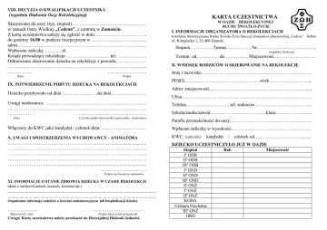 VIII. DECYZJA O KWALIFIKACJI UCZESTNIKA (wypełnia Diakonia Oazy Rekolekcyjnej) KARTA UCZESTNICTWA Skierowano do oazy (typ, stopień)………………………………………… w ramach Oazy Wielkiej „Cedron”, z centralą w Zamościu. Z kartą uczestnictwa należy się zgłosić w dniu…………………….……… do godziny 16.00 w punkcie recepcyjnym w ……………………….…….. adres..………………………………………………………………………. Wpłacono zaliczkę…………zł. Ksiądz prowadzący rekolekcje: ……………………… tel.: ……………… Odmówiono skierowanie dziecka na rekolekcje z powodu:………………. ……………………………………………………………………………... .…………… ……………………. Data Podpis IX. POTWIERDZENIE POBYTU DZIECKA NA REKOLEKCJACH Dziecko przebywało od dnia ……………..……do dnia………………….. Uwagi moderatora: ……………………………………………………….. ……………………………………………………………………………... …………… …………………………………….. Data Czytelny podpis kierownika wypoczynku - moderatora W OAZIE REKOLEKCYJNEJ RUCHU ŚWIATŁO-ŻYCIE I. INFORMACJE ORGANIZATORA O REKOLEKCJACH Katolickie Stowarzyszenie Ruchu Światło-Życie Diecezji Zamojsko-Lubaczowskiej „Cedron”. Adres: ul. Kolegiacka 1, 22-400 Zamość Stopień……………Turnus……………..Nr………………………………... (wypełnia Diakonia) Termin: od……..…..…do……….....…Miejscowość………………….…… II. WNIOSEK RODZICÓW O SKIEROWANIE NA REKOLEKCJE Imię i nazwisko…………………………………………………………….. PESEL…………………………………………wiek…………………….... Adres: miejscowość……………………………………………………….... Ulica………………………………………………………………………… Telefon………………………..tel. rodziców……………………………..... Szkoła/studia/zawód………………………………klasa……………….….. Parafia przynależności do oazy………………………………………….…. Włączony do KWC jako kandydat / członek dnia: ……………………….. Wpłacam zaliczkę w wysokości………………………………………….… X. UWAGI I SPOSTRZERZENIA WYCHOWAWCY - ANIMATORA KWC: (zakreślić) ………………………….……….………………………............................. ……………………………………………………..…………………....…. ………………………………………………………..……………………. ……………………………………………………….………………….…. ……………………....................................................................................... ………………………… DZIECKO UCZESTNICZYŁO JUŻ W OAZIE Podpis wychowawcy-animatora XI. INFORMACJE O STANIE ZDROWIA DZIECKA W CZASIE REKOLEKCJI (dane o zachorowaniach, urazach, leczeniu itp.) ................................................................................................................................ ................................................................................................................................ Organizator informuje rodziców o leczeniu ambulatoryjnym lub hospitalizacji dziecka ………………. Miejscowość, data …………….……………… Podpis lekarza lub pielęgniarki Uwaga! Kartę uczestnictwa należy przekazać do Diecezjalnej Diakonii Jedności. kandydat Stopień Iº ODB IIº ODB IIIº ODB Iº OND IIº OND IIIº OND 0º ONŻ Iº ONŻ IIº ONŻ KODA Triduum Paschalne IIIº ONŻ ORD / członek od…………………………......... Rok Miejscowość III. INFORMACJA RODZICÓW O STANIE ZDROWIA DZIECKA (dotyczy nieletnich uczestników) Wyrażam zgodę, aby moje dziecko uczestniczyło w Oazie Rekolekcyjnej i zlecam opiekę wychowawcom wyznaczonym przez Diecezjalną Diakonię Ruchu ŚwiatłoŻycie. Oświadczam, że znany mi jest cel i program rekolekcji a stan zdrowia dziecka pozwala uczestniczyć w rekolekcjach. Wyrażam również zgodę na przetwarzanie danych osobowych zawartych w karcie uczestnika w zakresie niezbędnym dla bezpieczeństwa i ochrony zdrowia dziecka. Uwagi o zdrowiu dziecka: (np. na co dziecko jest uczulone, jak znosi jazdę samochodem, czy przyjmuje stale leki i w jakich dawkach, czy nosi aparat ortodontyczny lub okulary) …………………………………………………………………………....... …………………………………………………………………………....... ……………… Data ………………… ……..……….. Podpis matki, ojca lub opiekuna IV. INFORMACJA O SZCZEPIENIACH (lub przedstawienie książeczki zdrowia z aktualnym wpisem szczepień) Szczepienia ochronne (podać rok): tężec …………….. błonica…………….. dur……………… inne……………………… …………………………… Data …………………………… Podpis lekarza, matki, ojca lub opiekuna V. INFORMACJA WYCHOWAWCY KLASY O DZIECKU (w przypadku braku możliwości uzyskania opinii wychowawcy klasy – wypełnia rodzic lub opiekun) …………………………………………………………………………………… …………………………………………………………….................................... ……………. …………………………… Data Podpis wychowawcy lub rodzica - opiekuna VI. SKIEROWANIE MODERATORA (kapłana za wspólnotę oazową, do której należy zgłaszający się) odpowiedzialnego Potwierdzam zgłoszenie i proszę o przyjęcie na wskazany stopień rekolekcji oazowych. Uwagi