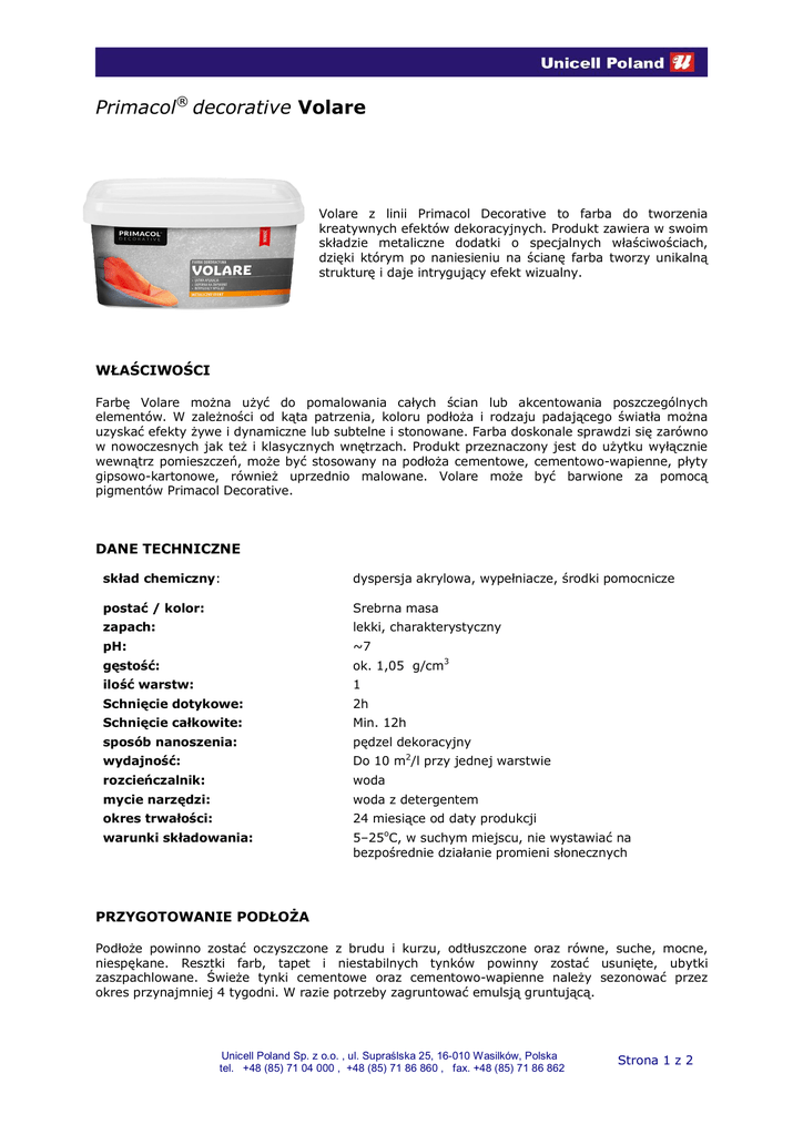 Primacol® decorative Volare Volare z linii Primacol Decorative to farba do tworzenia kreatywnych efektów dekoracyjnych. Produkt zawiera w swoim składzie metaliczne dodatki o specjalnych właściwościach, dzięki którym po naniesieniu na ścianę farba tworzy unikalną strukturę i daje intrygujący efekt wizualny. WŁAŚCIWOŚCI Farbę Volare można użyć do pomalowania całych ścian lub akcentowania poszczególnych elementów. W zależności od kąta patrzenia, koloru podłoża i rodzaju padającego światła można uzyskać efekty żywe i dynamiczne lub subtelne i stonowane. Farba doskonale sprawdzi się zarówno w nowoczesnych jak też i klasycznych wnętrzach. Produkt przeznaczony jest do użytku wyłącznie wewnątrz pomieszczeń, może być stosowany na podłoża cementowe, cementowo-wapienne, płyty gipsowo-kartonowe, również uprzednio malowane. Volare może być barwione za pomocą pigmentów Primacol Decorative. DANE TECHNICZNE skład chemiczny: dyspersja akrylowa, wypełniacze, środki pomocnicze postać / kolor: Srebrna masa zapach: lekki, charakterystyczny pH: ~7 gęstość: ok. 1,05 g/cm3 ilość warstw: 1 Schnięcie dotykowe: 2h Schnięcie całkowite: Min. 12h sposób nanoszenia: pędzel dekoracyjny wydajność: Do 10 m2/l przy jednej warstwie rozcieńczalnik: woda mycie narzędzi: woda z detergentem okres trwałości: 24 miesiące od daty produkcji warunki składowania: 5–25oC, w suchym miejscu, nie wystawiać na bezpośrednie działanie promieni słonecznych PRZYGOTOWANIE PODŁOŻA Podłoże powinno zostać oczyszczone z brudu i kurzu, odtłuszczone oraz równe, suche, mocne, niespękane. Resztki farb, tapet i niestabilnych tynków powinny zostać usunięte, ubytki zaszpachlowane. Świeże tynki cementowe oraz cementowo-wapienne należy sezonować przez okres przynajmniej 4 tygodni. W razie potrzeby zagruntować emulsją gruntującą. Unicell Poland Sp. z o.o. , ul. Supraślska 25, 16-010 Wasilków, Polska tel. +48 (85) 71 04 000 , +48 (85) 71 86 860 , fax. +48 (85) 71 86 862 Strona 1 z 2 MALOWANIE/STOSOWANIE Sposób użycia: 1. Podłoże należy pomalować Farbą Decobase zabarwioną na żądany kolor za pomocą Kolorantów Primacol Decorative i pozostawić do wyschnięcia na 3-6 h. 2. Volare delikatnie wymieszać. NIE MIESZAĆ MECHANICZNIE - może to spowodować uszkodzenie farby. 3. Farbę należy nakładać pędzlem dekoracyjnym ruchami krzyżowymi, delikatnie, aby nie uszkodzić zawartych drobin. 4. Po upływie ok. 10 - 15min. przetrzeć powierzchnię plastikową pacą rozgniatając zawarte w niej drobiny. Prac należy wykonywać obszarami po ok. 2 m2. Po zakończeniu prac pomieszczenie wietrzyć do utraty zapachu. Składowanie: przechowywać w szczelnie zamkniętym, oryginalnym opakowaniu, w temp. 5-30oC. Nie zamrażać. Po otwarciu zaleca się zużyć produkt w ciągu 2 dni. Uwaga! Przed przystąpieniem do właściwego malowania zaleca się zawsze przeprowadzenie próby na testowej powierzchni, w celu zapoznania się z techniką nanoszenia i uzyskiwanym efektem wizualnym. Po zakończeniu prac wietrzyć pomieszczenie, aż do zaniku zapachu. BEZPIECZEŃSTWO STOSOWANIA Produkt niepalny. Nie klasyfikowany jako niebezpieczny. W trakcie prac malarskich i po ich zakończeniu pomieszczenie wietrzyć do zaniku zapachu. Produkt przechowywać w miejscu niedostępnym dla dzieci. Szczegółowe informacje zawarte w karcie charakterystyki produktu. INFORMACJE PRAWNE Wszystkie informacje i dane zawarte tutaj są podane w dobrej wierze i w zgodzie z posiadaną przez nasze laboratoria wiedzą. Muszą jednak być przyjęte jako oznaczenia bez gwarancji, jeżeli produkt znajduje się poza naszą kontrolą. Informacja techniczna nie jest świadectwem jakości produktu ani też ofertą. Producent nie odpowiada za niewłaściwe użycie informacji zawartych na tej karcie, ani też za konsekwencje z tego wynikające. W przypadku wątpliwości zawsze należy przeprowadzić próbę. Producent zastrzega sobie prawo do zmiany powyższych danych bez powiadamiania klienta. Zapraszamy na nasze strony internetowe: www.unicell.pl, www.dekorujemydom.pl. Wydanie Autor: Kamila Jurowczyk Data: 27. 01. 2015r. Unicell Poland Sp. z o.o. , ul. Supraślska 25, 16-010 Wasilków, Polska tel. +48 (85) 71 04 000 , +48 (85) 71 86 860 , fax. +48 (85) 71 86 862 Strona 2 z 2