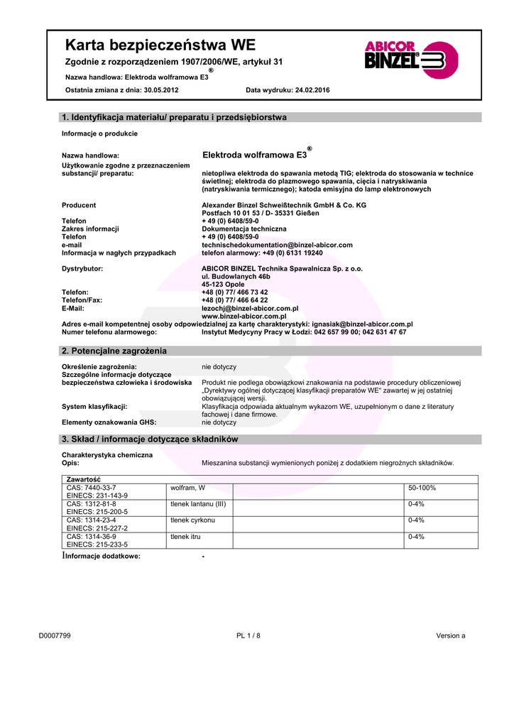 Karta bezpieczeństwa WE Zgodnie z rozporządzeniem 1907/2006/WE, artykuł 31 ® Nazwa handlowa: Elektroda wolframowa E3 Ostatnia zmiana z dnia: 30.05.2012 Data wydruku: 24.02.2016 1. Identyfikacja materiału/ preparatu i przedsiębiorstwa Informacje o produkcie Nazwa handlowa: Użytkowanie zgodne z przeznaczeniem substancji/ preparatu: Producent Telefon Zakres informacji Telefon e-mail Informacja w nagłych przypadkach Elektroda wolframowa E3 ® nietopliwa elektroda do spawania metodą TIG; elektroda do stosowania w technice świetlnej; elektroda do plazmowego spawania, cięcia i natryskiwania (natryskiwania termicznego); katoda emisyjna do lamp elektronowych Alexander Binzel Schweißtechnik GmbH & Co. KG Postfach 10 01 53 / D- 35331 Gießen + 49 (0) 6408/59-0 Dokumentacja techniczna + 49 (0) 6408/59-0 [email protected] telefon alarmowy: +49 (0) 6131 19240 Dystrybutor: ABICOR BINZEL Technika Spawalnicza Sp. z o.o. ul. Budowlanych 46b 45-123 Opole Telefon: +48 (0) 77/ 466 73 42 Telefon/Fax: +48 (0) 77/ 466 64 22 E-Mail: [email protected] www.binzel-abicor.com.pl Adres e-mail kompetentnej osoby odpowiedzialnej za kartę charakterystyki: [email protected] Numer telefonu alarmowego: Instytut Medycyny Pracy w Łodzi: 042 657 99 00; 042 631 47 67 2. Potencjalne zagrożenia Określenie zagrożenia: Szczególne informacje dotyczące bezpieczeństwa człowieka i środowiska System klasyfikacji: Elementy oznakowania GHS: nie dotyczy Produkt nie podlega obowiązkowi znakowania na podstawie procedury obliczeniowej „Dyrektywy ogólnej dotyczącej klasyfikacji preparatów WE“ zawartej w jej ostatniej obowiązującej wersji. Klasyfikacja odpowiada aktualnym wykazom WE, uzupełnionym o dane z literatury fachowej i dane firmowe. nie dotyczy 3. Skład / informacje dotyczące składników Charakterystyka chemiczna Opis: Zawartość CAS: 7440-33-7 EINECS: 231-143-9 CAS: 1312-81-8 EINECS: 215-200-5 CAS: 1314-23-4 EINECS: 215-227-2 CAS: 1314-36-9 EINECS: 215-233-5 IInformacje dodatkowe: D0007799 Mieszanina substancji wymienionych poniżej z dodatkiem niegroźnych składników. wolfram, W 50-100% tlenek lantanu (III) 0-4% tlenek cyrkonu 0-4% tlenek itru 0-4% - PL 1 / 8 Version a Karta bezpieczeństwa WE Zgodnie z rozporządzeniem 1907/2006/WE, artykuł 31 ® Nazwa handlowa: Elektroda wolframowa E3 Ostatnia zmiana z dnia: 30.05.2012 Data wydruku: 24.02.2016 4. Środki pierwszej pomocy Informacje ogólne Wdychanie: Kontakt ze skórą: Kontakt z oczami: Połknięcie: Informacje dla lekarza Leczenie Stosowanie szczególnych środków nie jest konieczne. Niezwłocznie usunąć części odzieży zanieczyszczone przez produkt. Zapewnić dopływ świeżego powietrza, w razie dolegliwości zgłosić się do lekarza. W razie nieregularnego oddechu lub bezdechu zastosować sztuczne oddychanie. Produkt nie podrażnia skóry. Przez kilka minut przepłukiwać oczy pod bieżącą wodą, przy otwartych powiekach i skonsultować się z lekarzem. Wypłukać usta, po czym obficie popić wodą. Połknięcie bądź zwymiotowanie grozi przedostaniem się do płuc. Konieczna obserwacja czy nie wystąpi zapalenie płuc bądź obrzęk płuc. 5. Postępowanie w przypadku pożaru Informacje ogólne: Metal w formie zwartej jest niepalny. Odpowiednie środki gaśnicze: Woda, proszek ABC, proszek gaśniczy klasy D, rozpylony strumień wody. Środki nie nadające się do gaszenia ze względów bezpieczeństwa Szczególne zagrożenie ze strony substancji, produktów spalania lub wydzielających się gazów: Główne produkty spalania: trójtlenek wolframu WO3 (CAS:1314-35-8) Specjalne wyposażenie ochronne: Stosować sprzęt ochrony układu oddechowego, niezależny od powietrza otoczenia. Dodatkowe informacje: Zagrożone pojemniki chłodzić rozpylonym strumieniem wody. Pozostałości po pożarze i zanieczyszczoną wodę gaśniczą usunąć zgodnie z obowiązującymi przepisami. 6. Postępowanie w razie przypadkowego uwolnienia do środowiska Osobiste środki ostrożności Zapobieganie skażeniu środowiska: Sposoby oczyszczania/ uprzątania: IInformacje dodatkowe D0007799 Stosować wyposażenie ochronne. Nie dopuszczać osób bez wyposażenia ochronnego. Zadbać o dostateczną wentylację. Trzymać z dala od źródeł zapłonu. W razie występowania oparów / pyłu /aerozolu stosować środki ochrony dróg oddechowych. Zakładać indywidualną odzież ochronną. Nie dopuścić do przedostania się zanieczyszczeń do kanalizacji lub wód naturalnych. W miarę możliwości zapobiegać uwolnieniu do środowiska naturalnego. Odpady, filtry pyłowe i pojemniki usuwać w bezpieczny sposób, zgodnie z obowiązującymi przepisami krajowymi. Zanieczyszczone chłodziwo i popłuczyny zatrzymać i usunąć. Zanieczyszczony materiał usuwać w ramach odpadów zgodnie z punktem 13. W odpowiednich pojemnikach odprowadzić do utylizacji. Wchłonięty materiał usunąć zgodnie z przepisami. Informacje dotyczące usuwania odpadów patrz w rozdziale 13. PL 2 / 8 Version a Karta bezpieczeństwa WE Zgodnie z rozporządzeniem 1907/2006/WE, artykuł 31 ® Nazwa handlowa: Elektroda wolframowa E3 Ostatnia zmiana z dnia: 30.05.2012 Data wydruku: 24.02.2016 7. Stosowanie i magazynowanie Stosowanie Wskazówki do bezpiecznego stosowania: Informacje dla ochrony przed pożarem i wybuchem: Unikać łączenia się pyłów podczas obróbki stosując odpowiednie wyciągi bądź ochronę dróg oddechowych z filtrem cząsteczkowym P2 lub P3, zalecany P3, barwa rozpoznawcza: biała. Zapobiegać gromadzeniu się pyłu. Patrz rozdział 15 Magazynowanie: Wymagania w stosunku do pomieszczeń magazynowych i pojemników: Wskazówki do przechowywania z innymi materiałami: Inne informacje dotyczące warunków przechowywania: Patrz rozdział 15 Zalecana temperatura przechowywania: Określone zastosowanie: +5°C / +30 °C Niniejszy produkt jako nietopliwa elektroda przeznaczony jest do spawania metodą TIG. Powstające w tym procesie pyły i opary należy odciągać stosując odpo