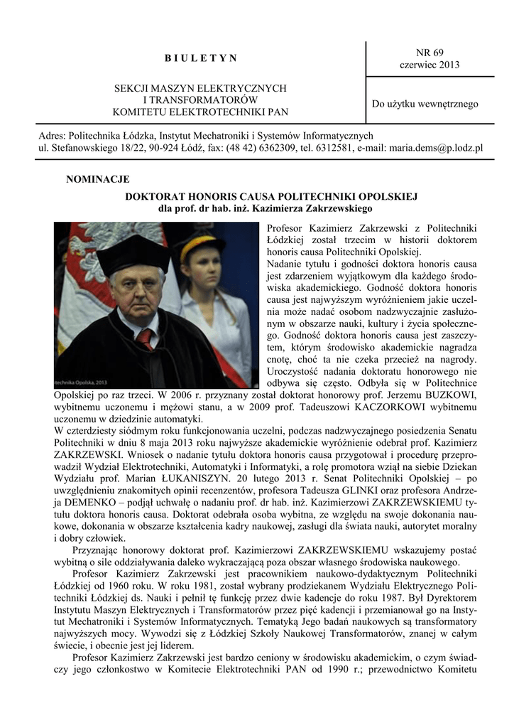 BIULETYN SEKCJI MASZYN ELEKTRYCZNYCH I TRANSFORMATORÓW KOMITETU ELEKTROTECHNIKI PAN NR 69 czerwiec 2013 Do użytku wewnętrznego Adres: Politechnika Łódzka, Instytut Mechatroniki i Systemów Informatycznych ul. Stefanowskiego 18/22, 90-924 Łódź, fax: (48 42) 6362309, tel. 6312581, e-mail: [email protected] NOMINACJE DOKTORAT HONORIS CAUSA POLITECHNIKI OPOLSKIEJ dla prof. dr hab. inż. Kazimierza Zakrzewskiego Profesor Kazimierz Zakrzewski z Politechniki Łódzkiej został trzecim w historii doktorem honoris causa Politechniki Opolskiej. Nadanie tytułu i godności doktora honoris causa jest zdarzeniem wyjątkowym dla każdego środowiska akademickiego. Godność doktora honoris causa jest najwyższym wyróżnieniem jakie uczelnia może nadać osobom nadzwyczajnie zasłużonym w obszarze nauki, kultury i życia społecznego. Godność doktora honoris causa jest zaszczytem, którym środowisko akademickie nagradza cnotę, choć ta nie czeka przecież na nagrody. Uroczystość nadania doktoratu honorowego nie odbywa się często. Odbyła się w Politechnice Opolskiej po raz trzeci. W 2006 r. przyznany został doktorat honorowy prof. Jerzemu BUZKOWI, wybitnemu uczonemu i mężowi stanu, a w 2009 prof. Tadeuszowi KACZORKOWI wybitnemu uczonemu w dziedzinie automatyki. W czterdziesty siódmym roku funkcjonowania uczelni, podczas nadzwyczajnego posiedzenia Senatu Politechniki w dniu 8 maja 2013 roku najwyższe akademickie wyróżnienie odebrał prof. Kazimierz ZAKRZEWSKI. Wniosek o nadanie tytułu doktora honoris causa przygotował i procedurę przeprowadził Wydział Elektrotechniki, Automatyki i Informatyki, a rolę promotora wziął na siebie Dziekan Wydziału prof. Marian ŁUKANISZYN. 20 lutego 2013 r. Senat Politechniki Opolskiej – po uwzględnieniu znakomitych opinii recenzentów, profesora Tadeusza GLINKI oraz profesora Andrzeja DEMENKO – podjął uchwałę o nadaniu prof. dr hab. inż. Kazimierzowi ZAKRZEWSKIEMU tytułu doktora honoris causa. Doktorat odebrała osoba wybitna, ze względu na swoje dokonania naukowe, dokonania w obszarze kształcenia kadry naukowej, zasługi dla świata nauki, autorytet moralny i dobry człowiek. Przyznając honorowy doktorat prof. Kazimierzowi ZAKRZEWSKIEMU wskazujemy postać wybitną o sile oddziaływania daleko wykraczającą poza obszar własnego środowiska naukowego. Profesor Kazimierz Zakrzewski jest pracownikiem naukowo-dydaktycznym Politechniki Łódzkiej od 1960 roku. W roku 1981, został wybrany prodziekanem Wydziału Elektrycznego Politechniki Łódzkiej ds. Nauki i pełnił tę funkcję przez dwie kadencje do roku 1987. Był Dyrektorem Instytutu Maszyn Elektrycznych i Transformatorów przez pięć kadencji i przemianował go na Instytut Mechatroniki i Systemów Informatycznych. Tematyką Jego badań naukowych są transformatory najwyższych mocy. Wywodzi się z Łódzkiej Szkoły Naukowej Transformatorów, znanej w całym świecie, i obecnie jest jej liderem. Profesor Kazimierz Zakrzewski jest bardzo ceniony w środowisku akademickim, o czym świadczy jego członkostwo w Komitecie Elektrotechniki PAN od 1990 r.; przewodnictwo Komitetu Elektrotechniki od 2003 r. do 2012 r. (obecnie Honorowy Przewodniczący Komitetu Elektrotechniki); przewodnictwo Sekcji Maszyn Elektrycznych i Transformatorów Komitetu Elektrotechniki PAN od 1997 r.; członkostwo w Centralnej Komisji do spraw Stopni i Tytułów przez cztery kadencje w latach 200-2012 ( Z-ca Przewodniczącego Sekcji Nauk Technicznych przez dwie kadencje) ; przewodnictwo Rady Naukowej Instytutu Elektrotechniki w Warszawie od 1999 r. (czwarta kadencja); członkostwo Zarządu Głównego Polskiego Towarzystwa Elektrotechniki Teoretycznej i Stosowanej (19981992 i 1996-2005); członkostwo Honorowe Polskiego Towarzystwa Elektrotechniki Teoretycznej i Stosowanej od 1996 r.. Profesor jest członkiem Rady Redakcyjnej czasopisma z listy filadelfijskiej COMPEL i członkiem Rady Redakcyjnej “Archives of Electrical Engineering”, członkiem Komitetów Naukowych stałych Konferencji Międzynarodowych i recenzentem tych konferencji oraz członkiem Łódzkiego Towarzystwa Naukowego od 1992 r. Liczne i trwałe więzi Profesora Kazimierza Zakrzewskiego z Politechniką Opolską, a szczególności z Wydziałem Elektrotechniki, Automatyki i Informatyki mają miejsce od ponad trzydziestu lat i trwają do dziś. Profesor wspierał różne inicjatywy naukowe Wydziału oraz służy radą przy opiniowaniu wniosków dotyczących rozwoju Wydziału. W osobie Profesora Politechnika Opolska pozyskała wspaniałego ambasadora, który nie szczędził sił na rzecz Jej rozwoju i pozycji na krajowej mapie naukowej. Uchwała Senatu o nadaniu Profesorowi Kazimierzowi Zakrzewskiemu zaszczytnego tytułu doktora honoris causa Politechniki Opolskiej podjęta na wniosek Rady Wydziału Elektrotechniki, Automatyki i Informatyki poparta opiniami Recenzentów, jest wyrazem uznania dla Jego dorobku naukowego, istotnych zasług dla Politechniki Opolskiej oraz bardzo aktywnej działalności na rzecz rozwoju polskiego i międzynarodowego środowiska naukowego w zakresie elektrotechniki, a szczególnie maszyn elektrycznych. Tytuł przyznano na uroczystym posiedzeniu Senatu PO, z zachowaniem obowiązujących procedur (które przedstawił Prorektor ds Nauki PO - Prof. Janusz Pospolita), na wniosek Prof. Mariana Łukaniszyna - dziekana Wydziału Elektrotechniki, Automatyki i Informatyki. Uroczystość zgromadziła liczne grono naukowców i przyjaciół Prof. Zakrzewskiego z wielu polskich ośrodków naukowych. Gości przybyłych na uroczystość powitał Prof. Krzysztof Malik - Prorektor ds. Współpracy i Rozwoju Politechniki Opolskiej. Rektor Politechniki Opolskiej - Prof. Marek Tukiendorf - w okolicznościowym wystąpieniu zwrócił uwagę iż: "Nadanie tytułu DHC stanowi symboliczny dowód akademickości uczelni oraz jej misji w kreowaniu wzorców, wskazywaniu cnót i osób godnych naśladowania. [...] Wybór osoby, która zostaje u