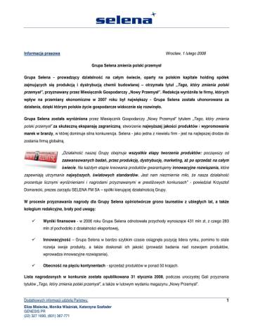 Informacja prasowa Wrocław, 1 lutego 2008 Grupa Selena zmienia polski przemysł Grupa Selena - prowadzący działalność na całym świecie, oparty na polskim kapitale holding spółek zajmujących się produkcją i dystrybucją chemii budowlanej – otrzymała tytuł „Tego, który zmienia polski przemysł”, przyznawany przez Miesięcznik Gospodarczy „Nowy Przemysł”. Redakcja wyróżniła te firmy, których wpływ na przemiany ekonomiczne w 2007 roku był największy - Grupa Selena została uhonorowana za działania, dzięki którym polskie życie gospodarcze widocznie się rozwinęło. Grupa Selena została wyróżniona przez Miesięcznik Gospodarczy „Nowy Przemysł” tytułem „Tego, który zmienia polski przemysł” za skuteczną ekspansję zagraniczną, stworzenie najwyższej jakości produktów i wypromowanie marek w branży, w której dominuje silna konkurencja. Selena - jako jedna z niewielu firm - jest na najlepszej drodze do zostania firmą globalną. „Działalność naszej Grupy obejmuje wszystkie etapy tworzenia produktów: począwszy od zaawansowanych badań, przez produkcję, dystrybucję, marketing, aż po sprzedaż na całym świecie. Na każdym etapie kreowania produktów gwarantujemy innowacyjne rozwiązania, które zapewniają utrzymanie najwyższych, światowych standardów. Jest nam niezmiernie miło, że nasza działalność procentuje licznymi wyróżnieniami i nagrodami przyznawanymi w prestiżowych konkursach” - powiedział Krzysztof Domarecki, prezes zarządu SELENA FM SA – spółki kierującej działalnością Grupy. W procesie przyznawania nagrody dla Grupy Selena opiniotwórcze grono laureatów z ubiegłych lat, a także kolegium redakcyjne, brały pod uwagę: Wyniki finansowe - w 2006 roku Grupa Selena odnotowała przychody wynoszące 431 mln zł, z czego 283 mln zł pochodziło z działalności eksportowej, Innowacyjność – Grupa Selena w bardzo szybkim czasie osiągnęła pozycję lidera rynku, pomimo to stale rozwija swoje produkty, a także doskonali ich jakość (prowadzi badania nad rozwojem produktów, wprowadza innowacyjne rozwiązania), Obecność na pięciu kontynentach - sprzedaż produktów w ponad 50 krajach. Lista nagrodzonych w konkursie została opublikowana 31 stycznia 2008, podczas uroczystej Gali przyznania tytułów „Tego, który zmienia polski przemysł”, a także w lutowym wydaniu magazynu „Nowy Przemysł”. Dodatkowych informacji udzielą Państwu: Eliza Misiecka, Monika Wlaźniak, Katarzyna Szafader GENESIS PR (22) 327 1690, (601) 367-771 1 Selena jest laureatem wielu prestiżowych nagród, co podkreśla najwyższe standardy funkcjonowania spółki i jakość produktów sprzedawanych na rynkach ponad 50 krajów świata. Tylko w 2007 roku otrzymała: prestiżową nagrodę „Gazela Biznesu” - wyróżnienie przyznawane dynamicznie rozwijającym się spółkom krajowym, które notują stabilny wzrost przychodów, a dla swoich klientów są wiarygodnym i rzetelnym partnerem biznesowym, tytuł Europrodukt dla Uniwersalnej Emulsji Gruntującej Tytan Grunt w ogólnopolskim konkursie pod patronatem Ministerstwa Gospodarki i Polskiej Agencji Rozwoju Przedsiębiorczości, nagrodę Budowlanej Marki Roku 2006 - przyznaną na Targach Budma 2007, a ponadto do portfolio nagród przyznawanych przez międzynarodowe kapituły spółka dołączyła otrzymany na targach w Construct Expo Ambient 2007 w Rumunii medal za doskonały produkt oraz medale dla pian poliuretanowych Tytan Lexy i Tytan 65 zdobyte podczas targów ITF w Bułgarii. Informacje dodatkowe: Grupa Selena to prowadzący działalność na całym świecie, oparty na polskim kapitale holding spółek zajmujących się produkcją i dystrybucją chemii budowlanej. W skład Grupy wchodzi 25 spółek, w tym 17 podmiotów zagranicznych oraz 9 nowoczesnych zakładów produkcyjnych (4 zakłady w Polsce, po jednym we Włoszech, w Brazylii, Korei, Chinach oraz USA). Grupa Selena jest - pod względem wielkości - czwartym na świecie producentem piany poliuretanowej używanej do montażu okien i drzwi. Grupa Selena systematycznie zwiększa sprzedaż eksportową, która w 2006 roku stanowiła 65,5% przychodów. Realizuje zamówienia na rynkach 50 państw, w tym przez własne spółki handlowe zlokalizowane w 15 krajach (Polska, Rosja, Czechy, Finlandia, Kazachstan, Ukraina, Bułgaria, Rumunia, Węgry, Niemcy, Włochy, Brazylia, USA, Korea Płd. i Chiny). Ponadto, Grupa Selena planuje umacnianie pozycji w regionach: Azji Południowo-Wschodniej (Chiny), Bliskiego Wschodu (Turcja i Egipt oraz petrokraje Półwyspu Arabskiego), Ameryki Południowej (Argentyna), Ameryki Północnej (Kanada)oraz dalszą ekspansję na nowe rynki zagraniczne. Grupa Selena oferuje szeroką gamę produktów przeznaczonych zarówno dla profesjonalnych wykonawców, jak i użytkowników indywidualnych - główne marki to TYTAN oraz ARTELIT. Pozycja rynkowa Kluczowym elementem strategii Grupy Selena jest jakość. Pojęcie "przewaga dzięki produktowi" oznacza, że w każdej kategorii produktów Grupa Selena dąży do tego, aby jej wyroby miały najwyższą pozycję jakościową. Taka strategia zapewnia wysoki poziom zaufania klientów do produktów i procentuje w przyznawanych spółce licznych wyróżnieniach. Pozycja Grupy Selena w Polsce: 1. Lider w kategorii pian: 37% udziału w rynku (w ujęciu wartościowym oraz ilościowym). 2. 2 miejsce w kategorii uszczelniaczy: 19% udziału w rynku. Dodatkowych informacji udzielą Państwu: Eliza Misiecka, Monika Wlaźniak, Katarzyna Szafader GENESIS PR (22) 327 1690, (601) 367-771 2 Działalność Grupy Selena obejmuje wszystkie etapy tworzenia produktów: począwszy od zaawansowanych badań, przez produkcję, dystrybucję, marketing, aż po sprzedaż na całym świecie. Na każdym etapie kreowania produktów Selena gwarantuje innowacyjne rozwiązania, które zapewniają utrzymanie najwyższych, światowych standardów, potwierdzonych licznymi nagrodami i m