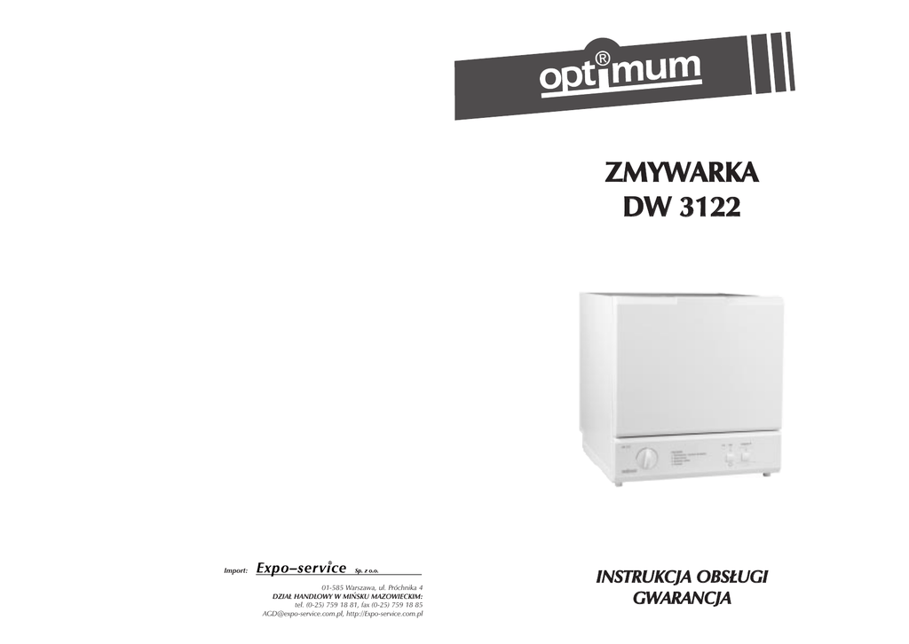 ZMYWARKA DW 3122 Import: 01-585 Warszawa, ul. Próchnika 4 DZIA¸ HANDLOWY W MI¡SKU MAZOWIECKIM: tel. (0-25) 759 18 81, fax (0-25) 759 18 85 [email protected], http://Expo-service.com.pl INSTRUKCJA OBS¸UGI GWARANCJA 61. 62. 63. 64. 65. 66. 67. 68. 69. 70. 71. 72. 73. 74. 75. 76. 77. 78. 79. 80. 81. 82. 83. 84. 85. 86. 87. SOPOT 81-808 SERWIS G.D. ul. 23-go Marca 5, tel. (058) 551-30-11 SUWA¸KI 16-400 ELEKTRODOM-SERWIS, ul. KoÊciuszki 128 tel. (087) 565-37-70 STARGARD SZCZECI¡SKI 73-110 AGD-SERWIS, ul. Kramarska 2/2b tel. (091) 577-26-76 SZCZECIN 70-202 ELEKTRO-DOM, ul. Wyszyƒskiego 27 tel. (091) 488-19-44 SZCZECIN 70-357 AMPOL PHU, ul. Pocztowa 37a tel. (091) 484-31-93 SZCZECINEK 78-400, ZU Elektromechaniki, ul.Szczeciƒska 24 D/6 tel.(094) 374-36-63, 0605 288 141 ÂWIDNIK 21- 040 PREDOM SERWIS, ul. Rac∏awicka 34/44 (0-82) 564-30-80 TARNÓW 33-100 Z.U.N.S.S. AGD, ul. OÊ. 25-lecia PRL blok 1 tel. (014) 621-25-90 TORU¡ 87-100 Z.U.H. AGD, ul. ¸ysakowskiego 29/35 tel. (056) 648-01-73 WEJHEROWO 84-200 B&J HURTOWNIA , ul. Obroƒców Helu 3 tel.( 058) 672-25-90 WIELU¡ 98-300 Z.U. ELDOM-SERWIS, ul. Baranowskiego 5 tel. (043) 843-34-15 WA¸BRZYCH 58-310 Z.U.H. ELDOM, ul. G∏ówna 9 tel. (074) 841-55-08 W¸OC¸AWEK 87-800 Naprawa Sprz´tu AGD, ul. Cyganka 24 tel. (054) 234-10-12 WROC¸AW 50-418 P.U.H. ARD, ul. Traugutta 60 tel. (071) 372-59-49, 341-82-50 WARSZAWA 01-175 JURMAR, ul. M∏ynarska 34 tel. (022) 632-19-52 WARSZAWA 02-517 GRZEÂ, ul. Rakowiecka 2b tel./fax (022) 849-49-74 WARSZAWA Mokotów PHU AGD, ul. ˚u∏awskiego 2 tel. (022) 848-02-93 WARSZAWA 00-157 PUH AGD, ul. Anielewicza 8 (022) 638-24-69 WARSZAWA Bemowo PHU AGD, ul. Unijewska 6 tel. (022) 638-24-69 WARSZAWA 03-203 ABC BAZYL, ul. Bazyliaƒska 6 tel. (022)11-11-14, 614-11-00 WARSZAWA 03-729 RADIONAPRAWA DAC SERVICE, ul. Targowa 63 (022) 619-84-66 ZABRZE 41-800 Z.U.N.S. AGD, ul. Wallisa 14 tel. (032) 275-35-11 ZABRZE 41-800 Servis AGD, ul. Âl´czka 8 (032) 276-86-553 ZAKOPANE 34-500 Z.N.S. AGD ul. Szkolna 8a (018) 206-39-93 ZAMOÂå 22-400 Z.N.S. AGD ELDOM, ul. Spadek 33 tel. (084) 639-32-10 ZGIERZ 95-100 SERWIS AGD, ul. ¸´czycka 55 tel. (042) 716-21-75 ˚ORY 44-240 FHU“EL-TECH“S.C., ul. Rybnicka 113, tel. (032) 435-07-6385 SERWIS CENTRALNY EXPO-SERVICE SP. Z O.O., ul. GROBELNEGO 4 05-300 MI¡SK MAZOWIECKI TEL. 0-25 758 88 19, FAX 0-25 758 36 16 Import: 6 01-585 Warszawa, ul. Próchnika 4 DZIA¸ HANDLOWY W MI¡SKU MAZOWIECKIM: tel. (0-25) 759 18 81, fax (0-25) 759 18 85 [email protected], http://Expo-service.com.pl ZMYWARKA DW 3122 INSTRUKCJA OBS¸UGI WA˚NE ZASADY BEZPIECZE¡STWA: Korzystajàc z urzàdzeƒ elektrycznych zawsze przestrzegaj podstawowych zasad bezpieczeƒstwa, ∏àcznie z ni˝ej podanymi: 1. Przed uruchomieniem urzàdzenia dok∏adnie zapoznaj si´ z instrukcjà obs∏ugi. 2. Sprawdê czy napi´cie w sieci odpowiada parametrom podanym na tabliczce znamionowej. 3. Urzàdzenie, przewód elektryczny, wtyczka nie mogà byç zanu˝ane w jakimkolwiek p∏ynie. 3. Podczas pracy urzàdzenia zwróç uwag´ na znajdujàce si´ w pobli˝u dzieci. Urzàdzenie powinno byç przechowywane w miejscu niedost´pnym dla dzieci. 4. Nie pozwól aby przewód elektryczny zwisa∏ poni˝ej powierzchni, na której ustawiona jest zmywarka, musi on byç niedost´pny dla dzieci. 5. Je˝eli zmywarka ustawiana jest na stole itp. ustawiaj jà jak najdalej od brzegów. 6. Wyjmij wtyczk´ z gniazdka Êciennego, gdy nie u˝ywasz urzàdzenia oraz podczas jego czyszczenia. 7. Zakr´caj dop∏yw wody gdy nie u˝ywasz zmywarki. 8. JeÊli przewód elektryczny, wtyczka lub samo urzàdzenie ulegnie uszkodzeniu lub w wypadku wystàpienia dymienia lub iskrzenia podczas pracy urzàdzenia natychmiast wyjmij wtyczk´ z gniazdka Êciennego i oddaj urzàdzenie do naprawy do autoryzowanego punktu serwisowego. 9. U˝ywaj urzàdzenie wy∏àcznie w pomieszczeniach zadaszonych. 10. Przewód elektryczny nie mo˝e dotykaç nagrzanych powierzchni, albowiem mo˝e to spowodowaç jego uszkodzenie. 11. Nie ustawiaj urzàdzenia w pobli˝u êróde∏ ciep∏a, palników gazowych lub elektrycznych, piekarników itp. 12. U˝ywaj urzàdzenia tylko do tego celu, do którego jest ono przeznaczone. 13. Urzàdzenie mo˝e byç obs∏ugiwane wy∏àcznie przez osoby doros∏e. Dzieciom nie wolno mani pulowaç przy urzàdzeniu. 14. Detergenty u˝ywane do zmywania sà silnie alka- liczne, dlatego te˝ mogà byç bardzo niebezpieczne w przypadku ich spo˝ycia. Unikaj ich kontaktu ze skórà lub oczami. 15. Pod∏àczenie elektryczne i hydrauliczne zmywarki powinno byç dokonane przez osob´ do tego upowa˝nionà. W przypadku samodzielnego pod∏àczania zmywarki nale˝y najpierw zapoznaç si´ z obowiàzujàcymi przepisami. 16. W przypadku napraw nale˝y u˝ywaç wy∏àcznie cz´Êci oryginalnych. 17. Uwa˝aj na wydobywajàcà si´ po otwarciu drzwiczek goràcà par´ po zakoƒczonym procesie zmywania. Urzàdzenie przeznaczone do u˝ytku domowego WPROWADZENIE AbyÊcie Paƒstwo mieli pe∏ne zadowolenie z Waszej nowej zmywarki do naczyƒ, prosimy Was o dok∏adne przeczytanie instrukcji obs∏ugi zanim zaczniecie jà u˝ywaç. Zalecamy równie˝ zachowanie niniejszej instrukcji w razie potrzeby przypomnienia funkcji zmywarki w przysz∏oÊci. POD¸ÑCZENIE Woda Zasilanie – Wà˝ gumowy doprowadzajàcy wod´ jest zaopatrzony z jednego koƒca w specjalnà nakr´tk´. – Dla uzyskania najlepszych rezultatów zaleca si´ pod∏àczanie zmywarki do zimnej lub ciep∏ej wody o ciÊnieniu minimum 2 barów. Przed pod∏àczeniem pozwól, aby sp∏ynà∏ pierwszy strumieƒ wody z ew. zanieczyszczeniami z rur kanalizacyjnych. – W´˝a doprowadzajàcego wod´ nie nale˝y zginaç. Odp∏yw – Wà˝ odprowadzajàcy jest w´˝em spiralnym o otwartym wylocie. Wà˝ ten nale˝y po∏àczyç z rurà kanalizacyjnà lub oprzeç o umywalk´. Wylot w´˝a musi byç tak umiejscowiony aby strumieƒ wody 7 wyp∏ywajàcy z urzàdzenia móg∏ wyp∏ywaç bez zak∏óceƒ. – Wylot