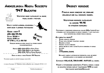 Andrzejkowa Nocka Szczepu 147 Błękitni Drodzy rodzice Podczas nocki odbędzie się zebranie organizacyjne dla rodziców zuchów. Wszystkie zuchy zapraszamy na nockę pełną czarów i przygód. Wszystkich rodziców zapraszamy na godzinę 19.15 do stołówki szkolnej Wraz z zaprzyjażnioną czarownicą odkryjecie tajemnice przyszłości Gdzie i kiedy? 29-30.11.13 Kos z 15 t: zł Start: 19.00 pt Koniec: 9.00 sob SP 218 ul. Kajki 80/82 Wszelkie informacje można znaleźć na stronie szczepu www.szczepblekitni.tk Kontak: 605-444-279 dh. Marta Plewa 501-738-840 dh. Ania Kucińska 880-818-701 dh. Marcin Świderski Zgoda na udział w nocce Szczepu 147 Błękitni Przypominamy o konieczności uregulowania składek (60zł/semestr) oraz wypełnienia kart przynależności do gromady zuchowej - karty oraz lista wpłat dostępne będą również podczas zebrania. Co zabrać na nockę?         Śpiwór, karimatę, poduszkę Myjoły czyli przybory toaletowe i ręcznik Bieliznę na zmianę Pidżamę i bajki na dobranoc Ciepłe ubranie na dwór i kapcie/klapki do chodzenia po szkole Latarkę Kubek WYPEŁNIONĄ ŻGODĘ Nie należy zabierać wartościowych przedmiotów, kadra nie bierze odpowiedzialności za ich zgubienie lub zniszczenie! Wyrażam zgodę na udział mojego syna/córki …………………………………… w nocce Szczepu 147 Błękitni, która odbędzie się w dniach 29/30.11.13 ……………………. Podpis …………………………. Telefon kontaktowy Zapewniamy KOLACJĘ, ŚNIADANIE i NAPOJE dla zuchów. Prosimy o potwierdzenie uczestnictwa Państwa dziecka w nocce do czwartku poprzez kontakt telefoniczny/SMS do kadry Lub mailowo: [email protected]