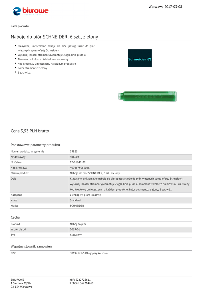 Warszawa 2017-03-08 Karta produktu: Naboje do piór SCHNEIDER, 6 szt., zielony Klasyczne, uniwersalne naboje do piór (pasują także do piór wiecznych spoza oferty Schneider) Wysokiej jakości atrament gwarantuje ciągłą linię pisania Atrament w kolorze niebieskim - usuwalny Kod kreskowy umieszczony na każdym produkcie Kolor atramentu: zielony 6 szt. w j.s. Cena 3,53 PLN brutto Podstawowe parametry produktu Numer produktu w systemie 23921 Nr dostawcy SR6604 Nr Celcen 17-01641-29 Kod kreskowy 4004675066046 Nazwa produktu Naboje do piór SCHNEIDER, 6 szt., zielony Opis Klasyczne, uniwersalne naboje do piór (pasują także do piór wiecznych spoza oferty Schneider); wysokiej jakości atrament gwarantuje ciągłą linię pisania; atrament w kolorze niebieskim - usuwalny; kod kreskowy umieszczony na każdym produkcie; kolor atramentu: zielony; 6 szt. w j.s. Kategoria Cienkopisy, pióra kulkowe Klasa Standard Marka SCHNEIDER Cecha Produkt Nabój do piór W ofercie od 2015-01 Typ Klasyczny Wspólny słownik zamówień CPV 30192121-5 Długopisy kulkowe EBIUROWE 1 Sierpnia 39/26 02-134 Warszawa NIP: 5222725611 REGON: 362214769 Warszawa 2017-03-08 Karta katalogowa produktu cd. Naboje do piór SCHNEIDER, 6 szt., zielony Certyfikaty Nowy produkt w ofercie Standard Hit Standard Kolor Kolor Zielony Serdecznie zapraszamy do współpracy EBIUROWE zespół. EBIUROWE 1 Sierpnia 39/26 02-134 Warszawa NIP: 5222725611 REGON: 362214769