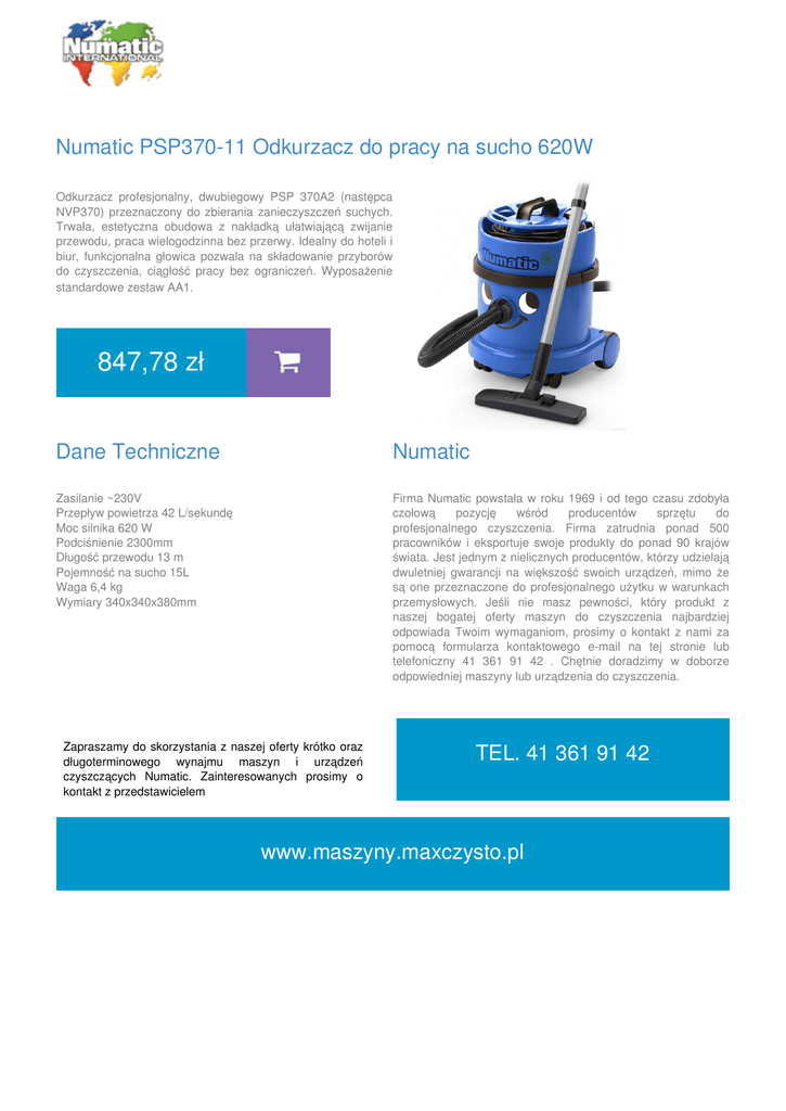 Numatic PSP370-11 Odkurzacz do pracy na sucho 620W Odkurzacz profesjonalny, dwubiegowy PSP 370A2 (następca NVP370) przeznaczony do zbierania zanieczyszczeń suchych. Trwała, estetyczna obudowa z nakładką ułatwiającą zwijanie przewodu, praca wielogodzinna bez przerwy. Idealny do hoteli i biur, funkcjonalna głowica pozwala na składowanie przyborów do czyszczenia, ciągłość pracy bez ograniczeń. Wyposażenie standardowe zestaw AA1. 847,78 zł Dane Techniczne Numatic Zasilanie ~230V Przepływ powietrza 42 L/sekundę Moc silnika 620 W Podciśnienie 2300mm Długość przewodu 13 m Pojemność na sucho 15L Waga 6,4 kg Wymiary 340x340x380mm Firma Numatic powstała w roku 1969 i od tego czasu zdobyła czołową pozycję wśród producentów sprzętu do profesjonalnego czyszczenia. Firma zatrudnia ponad 500 pracowników i eksportuje swoje produkty do ponad 90 krajów świata. Jest jednym z nielicznych producentów, którzy udzielają dwuletniej gwarancji na większość swoich urządzeń, mimo że są one przeznaczone do profesjonalnego użytku w warunkach przemysłowych. Jeśli nie masz pewności, który produkt z naszej bogatej oferty maszyn do czyszczenia najbardziej odpowiada Twoim wymaganiom, prosimy o kontakt z nami za pomocą formularza kontaktowego e-mail na tej stronie lub telefoniczny 41 361 91 42 . Chętnie doradzimy w doborze odpowiedniej maszyny lub urządzenia do czyszczenia. Zapraszamy do skorzystania z naszej oferty krótko oraz długoterminowego wynajmu maszyn i urządzeń czyszczących Numatic. Zainteresowanych prosimy o kontakt z przedstawicielem TEL. 41 361 91 42 www.maszyny.maxczysto.pl 1/1 Powered by TCPDF (www.tcpdf.org)