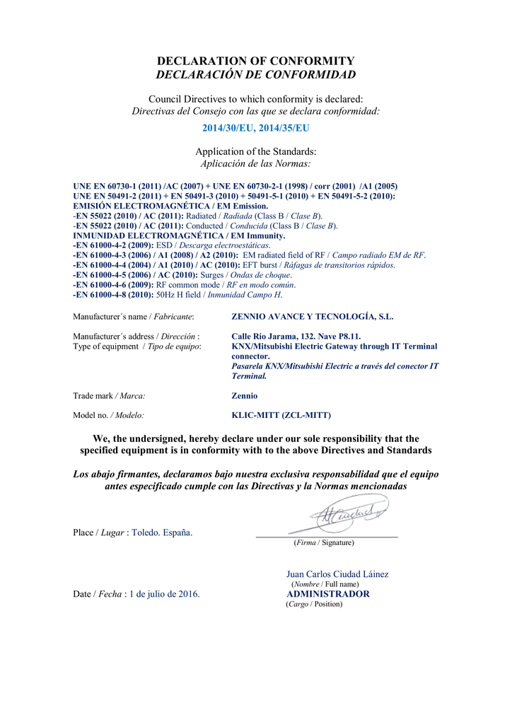 DECLARATION OF CONFORMITY DECLARACIÓN DE CONFORMIDAD Council Directives to which conformity is declared: Directivas del Consejo con las que se declara conformidad: 2014/30/EU, 2014/35/EU Application of the Standards: Aplicación de las Normas: UNE EN 60730-1 (2011) /AC (2007) + UNE EN 60730-2-1 (1998) / corr (2001) /A1 (2005) UNE EN 50491-2 (2011) + EN 50491-3 (2010) + 50491-5-1 (2010) + EN 50491-5-2 (2010): EMISIÓN ELECTROMAGNÉTICA / EM Emission. -EN 55022 (2010) / AC (2011): Radiated / Radiada (Class B / Clase B). -EN 55022 (2010) / AC (2011): Conducted / Conducida (Class B / Clase B). INMUNIDAD ELECTROMAGNÉTICA / EM Immunity. -EN 61000-4-2 (2009): ESD / Descarga electroestáticas. -EN 61000-4-3 (2006) / A1 (2008) / A2 (2010): EM radiated field of RF / Campo radiado EM de RF. -EN 61000-4-4 (2004) / A1 (2010) / AC (2010): EFT burst / Ráfagas de transitorios rápidos. -EN 61000-4-5 (2006) / AC (2010): Surges / Ondas de choque. -EN 61000-4-6 (2009): RF common mode / RF en modo común. -EN 61000-4-8 (2010): 50Hz H field / Inmunidad Campo H. Manufacturer´s name / Fabricante: ZENNIO AVANCE Y TECNOLOGÍA, S.L. Manufacturer´s address / Dirección : Type of equipment / Tipo de equipo: Calle Río Jarama, 132. Nave P8.11. KNX/Mitsubishi Electric Gateway through IT Terminal connector. Pasarela KNX/Mitsubishi Electric a través del conector IT Terminal. Trade mark / Marca: Zennio Model no. / Modelo: KLIC-MITT (ZCL-MITT) We, the undersigned, hereby declare under our sole responsibility that the specified equipment is in conformity with to the above Directives and Standards Los abajo firmantes, declaramos bajo nuestra exclusiva responsabilidad que el equipo antes especificado cumple con las Directivas y la Normas mencionadas Place / Lugar : Toledo. España. ______________________________ (Firma / Signature) Juan Carlos Ciudad Láinez (Nombre / Full name) Date / Fecha : 1 de julio de 2016. ADMINISTRADOR (Cargo / Position)
