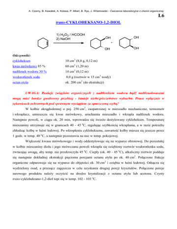A. Czarny, B. Kawałek, A. Kolasa, P. Milart, B. Rys, J. Wilamowski - Ćwiczenia laboratoryjne z chemii organicznej. I.6 trans-CYKLOHEKSANO-1,2-DIOL 1) H2O2 / HCOOH 2) NaOH OH OH + OH OH Odczynniki: cykloheksen 10 cm3 (8,0 g, 0,12 m) kwas mrówkowy 85 % 60 cm3 (1,20 m) nadtlenek wodoru 30 % 14 cm3 (0,12 m) wodorotlenek sodu 8,0 g (roztwór w 15 cm3 wody) octan etylu ok. 200 cm3 (do ekstrakcji) UWAGA: Reakcje związków organicznych z nadtlenkiem wodoru bądź nadtlenokwasami mogą mieć bardzo gwałtowny przebieg - istnieje niebezpieczeństwo wybuchu. Praca wyłącznie w rękawicach ochronnych pod sprawnym wyciągiem za opuszczoną szybą! W kolbie okrągłodennej o poj. 250 cm3, zaopatrzonej w mieszadło mechaniczne, termometr i wkraplacz, umieszcza się kwas mrówkowy, uruchamia mieszadło i wkrapla nadtlenek wodoru. Następnie powoli, w ciągu ok. 20 min, wprowadza się świeżo destylowany cykloheksen. Temperaturę mieszaniny utrzymuje się w granicach 40 - 45 oC, regulując szybkością wkraplania, a w razie potrzeby chłodząc kolbę w łaźni lodowej. Po wkropleniu cykloheksenu, zawartość kolby miesza się jeszcze przez 1 godz. w temp. 40 oC, a następnie pozostawia na noc w temp. pokojowej. Większość kwasu mrówkowego i wody oddestylowuje się na wyparce obrotowej. Do pozostałej w kolbie mieszaniny diolu i jego mrówczanu powoli wkrapla się oziębiony roztwór wodorotlenku sodu, zwracając uwagę, aby temp. nie przekroczyła 45 oC. Ciepły (ok. 40 - 45 oC), alkaliczny roztwór poddaje się następnie dokładnej ekstrakcji pięcioma porcjami octanu etylu po ok. 40 cm3. Połączone frakcje organiczne odparowuje się na wyparce do objętości ok. 30 cm3 i oziębia w łaźni lodowej. Odsącza się wydzielony osad, a przesącz zagęszcza w celu uzyskania drugiej porcji kryształów. Połączone porcje surowego produktu należy oczyścić na drodze krystalizacji z octanu etylu lub acetonu. Czysty trans-cykloheksano-1,2-diol topi się w temp. 102 - 103 oC.