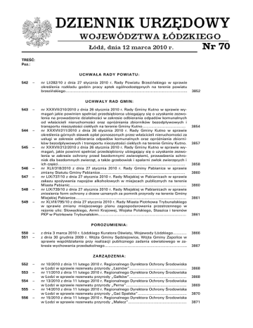 DZIENNIK URZĘDOWY WOJEWÓDZTWA ŁÓDZKIEGO Nr 70 Łódź, dnia 12 marca 2010 r. TREŅĆ: Poz.: UCHWAŁA RADY POWIATU : 542 – nr LI/282/10 z dnia 27 stycznia 2010 r. Rady Powiatu Brzezińskiego w sprawie określenia rozkładu godzin pracy aptek ogólnodostępnych na terenie powiatu brzezińskiego…………………………………………………………………………………... 3852 UCHWAŁY RAD GMIN: 543 – 544 – 545 – 546 – 547 – 548 – 549 – nr XXXVII/210/2010 z dnia 26 stycznia 2010 r. Rady Gminy Kutno w sprawie wymagań jakie powinien spełniać przedsiębiorca ubiegający się o uzyskanie zezwolenia na prowadzenie działalności w zakresie odbierania odpadów komunalnych od właścicieli nieruchomości oraz opróżniania zbiorników bezodpływowych i transportu nieczystości ciekłych na terenie Gminy Kutno……………………………. nr XXXVII/211/2010 z dnia 26 stycznia 2010 r. Rady Gminy Kutno w sprawie określenia górnych stawek opłat ponoszonych przez właścicieli nieruchomości za usługi w zakresie odbierania odpadów komunalnych oraz opróżniania zbiorników bezodpływowych i transportu nieczystości ciekłych na terenie Gminy Kutno. nr XXXVII/212/2010 z dnia 26 stycznia 2010 r. Rady Gminy Kutno w sprawie wymagań, jakie powinni spełniać przedsiębiorcy ubiegający się o uzyskanie zezwolenia w zakresie ochrony przed bezdomnymi zwierzętami, prowadzenia schronisk dla bezdomnych zwierząt, a także grzebowisk i spalarni zwłok zwierzęcych i ich części………………………………………………………………………………………. nr XLII/318/2010 z dnia 27 stycznia 2010 r. Rady Gminy Pabianice w sprawie zmiany Statutu Gminy Pabianice…………………………………………………………. nr LIX/737/10 z dnia 27 stycznia 2010 r. Rady Miejskiej w Pabianicach w sprawie zakazu spożywania napojów alkoholowych w miejscach publicznych na terenie Miasta Pabianic……………………………………………………………………………….. nr LIX/739/10 z dnia 27 stycznia 2010 r. Rady Miejskiej w Pabianicach w sprawie zniesienia form ochrony z drzew uznanych za pomnik przyrody na terenie Gminy Miejskiej Pabianice…………………………………………………………………………… nr XLVIII/795/10 z dnia 27 stycznia 2010 r. Rady Miasta Piotrkowa Trybunalskiego w sprawie zmiany miejscowego planu zagospodarowania przestrzennego w rejonie ulic: Słowackiego, Armii Krajowej, Wojska Polskiego, Staszica i terenów PKP w Piotrkowie Trybunalskim…………………………………………………………… 3854 3857 3858 3860 3860 3861 3861 POROZUMIENIA: 550 551 – – z dnia 3 marca 2010 r. Łódzkiego Kuratora Oświaty, Wojewody Łódzkiego…….…. z dnia 30 grudnia 2009 r. Wójta Gminy Sędziejowice, Wójta Gminy Zapolice w sprawie współdziałania przy realizacji publicznego zadania oświatowego w zakresie wychowania przedszkolnego……………………………………………………….. 3866 3867 ZARZĄDZENIA: 552 – 553 – 554 – 555 – 556 – nr 10/2010 z dnia 11 lutego 2010 r. Regionalnego Dyrektora Ochrony Środowiska w Łodzi w sprawie rezerwatu przyrody „Łaznów”……………………………………… nr 11/2010 z dnia 11 lutego 2010 r. Regionalnego Dyrektora Ochrony Środowiska w Łodzi w sprawie rezerwatu przyrody „Gałków”……………………………………… nr 13/2010 z dnia 11 lutego 2010 r. Regionalnego Dyrektora Ochrony Środowiska w Łodzi w sprawie rezerwatu przyrody „Perna”………………………………………... nr 14/2010 z dnia 11 lutego 2010 r. Regionalnego Dyrektora Ochrony Środowiska w Łodzi w sprawie rezerwatu przyrody „Gać Spalska”………………………………... nr 15/2010 z dnia 11 lutego 2010 r. Regionalnego Dyrektora Ochrony Środowiska w Łodzi w sprawie rezerwatu przyrody „Małecz”………………………………………. 3868 3868 3869 3870 3871 Dziennik Urzędowy Województwa Łódzkiego Nr 70 – 3852 – Poz. 542 OBWIESZCZENIE: 557 542 – z dnia 1 marca 2010 r. Komisarza Wyborczego w Łodzi w sprawie zmian w składzie Rady Miejskiej w Łodzi…………………………………………………………………. 3871 542 UCHWAŁA NR LI/282/10 RADY POWIATU BRZEZIŃSKIEGO z dnia 27 stycznia 2010 r. w sprawie okreņlenia rozkładu godzin pracy aptek ogólnodostĉpnych na terenie powiatu brzezińskiego Na podstawie art. 4 ust. 1 pkt 2 i art. 12 pkt 11 ustawy z dnia 5 czerwca 1998 r. o samorządzie powiatowym (Dz. U. z 2001 r. Nr 142, poz. 1592, z 2002 r. Nr 23, poz. 220, Nr 62, poz. 558, Nr 113, poz. 984, Nr 153, poz. 1271, Nr 200, poz. 1688, Nr 214, poz. 1806, z 2003 r. Nr 162, poz. 1568, z 2004 r. Nr 102, poz. 1055, Nr 167, poz. 1759, z 2007 r. Nr 173, poz. 1218, z 2008 r. Nr 180, poz. 1111 i Nr 223, poz. 145 oraz z 2009 r. Nr 92, poz. 753) oraz art. 94 ust. 2 ustawy z dnia 6 września 2001 r. Prawo farmaceutyczne (Dz. U. z 2008 r. Nr 45, poz. 271, Nr 227, poz. 1505, Nr 234, poz. 1570, z 2009 r. Nr 18, poz. 97, Nr 31, poz. 206, Nr 92, poz. 753, Nr 95, poz. 788, Nr 98, poz. 817) Rada Powiatu w Brzezi- nach uchwala, co następuje: § 1. Określa się rozkład godzin pracy aptek ogólnodostępnych na terenie powiatu brzezińskiego jak w załączniku do niniejszej uchwały. § 2. Wykonanie uchwały powierza się Zarządowi Powiatu w Brzezinach. § 3. Uchwała wchodzi w życie po upływie 14 dni od dnia ogłoszenia w Dzienniku Urzędowym Województwa Łódzkiego. Przewodniczący Rady Powiatu w Brzezinach: Marian Krasiński Dziennik Urzędowy Województwa Łódzkiego Nr 70 – 3853 – Poz. 542 Załącznik do Uchwały nr LI/282/10 Rady Powiatu Brzezińskiego z dnia 27 stycznia 2010 r. 542 Rozkład godzin pracy aptek ogólnodostĉpnych z terenu Powiatu Brzezińskiego w 2010 r. Lp. 1. 2. 3. 4. 5. 6. 7. 8. 9. 10. 11. 12. 13. 14. Apteka (adres, telefon) „Magiczna”, u