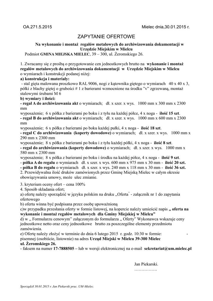 OA.271.5.2015 Mielec dnia,30.01.2015 r. ZAPYTANIE OFERTOWE Na wykonanie i montaż regałów metalowych do archiwizowania dokumentacji w Urzędzie Miejskim w Mielcu Podmiot GMINA MIEJSKA MIELEC, 39 – 300, ul. Żeromskiego 26. 1. Zwracamy się z prośbą o przygotowanie cen jednostkowych brutto na wykonanie i montaż regałów metalowych do archiwizowania dokumentacji w Urzędzie Miejskim w Mielcu o wymiarach i konstrukcji podanej niżej: a) konstrukcja i materiały: - stal gięta malowana proszkowo RAL 9006, nogi z kątownika giętego o wymiarach 40 x 40 x 3, półki z blachy giętej o grubości # 1 z barierami wzmocnione na środku ”v” zgrzewaną, montaż stalowymi śrubami M 6 b) wymiary i ilości: - regał A do archiwizowania akt o wymiarach; dł. x szer. x wys. 1000 mm x 300 mm x 2300 mm wyposażenie; 6 x półka z barierami po boku i z tyłu na każdej półce, 4 x noga - ilość 15 szt. - regał B do archiwizowania akt o wymiarach; dł. x szer. x wys. 1000 mm x 600 mm x 2300 mm wyposażenie; 6 x półka z barierami po boku każdej pułki, 4 x noga - ilość 18 szt. - regał C do archiwizowania (koperty dowodowe) o wymiarach; dł. x szer. x wys. 1000 mm x 290 mm x 2300 mm wyposażenie; 8 x półka z barierami po boku i z tyłu każdej półki, 4 x noga - ilość 8 szt. - regał do archiwizowania (koperty dowodowe) o wymiarach; dł. x szer. x wys. 1000 mm x 580 mm x 2300 mm wyposażenie; 8 x półka z barierami po boku i środku na każdej półce, 4 x noga - ilość 9 szt. - półka A do regału o wymiarach dł. x szer. x wys. 600 mm x 975 mm x 30 mm - ilość 20 szt. - półka B do regału o wymiarach dł. x szer. x wys. 240 mm x 118 mm x 30 mm - ilość 36 szt. 2. Przewidywalna ilość druków zamówionych przez Gminę Miejską Mielec w całym okresie obowiązywania umowy, może ulec zmianie. 3. kryterium oceny ofert – cena 100% 4. Sposób składania ofert; a) ofertę należy sporządzić w języku polskim na druku ,,Oferta” - załącznik nr 1 do zapytania ofertowego b) oferta winna być podpisana przez osobę upoważnioną c)w przypadku przesłania oferty w formie listowej, na kopercie należy umieścić napis ,, oferta na wykonanie i montaż regałów metalowych dla Gminy Miejskiej w Mielcu” d) w ,, Formularzu cenowym” załączonym do formularza ,, Oferty” Wykonawca wskazuje ceny jednostkowe netto oraz ceny jednostkowe brutto za poszczególne elementy przedmiotu zamówienia. e) Ofertę należy złożyć w terminie do dnia 6 lutego 2015 r. godz. 10:30 w formie: pisemnej (osobiście, listownie) na adres Urząd Miejski w Mielcu 39-300 Mielec ul. Żeromskiego 26. - faksem na numer 17-7888505 – lub w wersji elektronicznej na e-mail [email protected] Jan Piekarski. ……………. Sporządził 30.01.2015 r. Jan Piekarski prac. UM-Mielec. (oznaczenie oferenta) Załącznik nr 1 - ,, Oferta” …………………….., dnia……….20….r. OFERTA Odpowiadając na skierowane do nas zapytanie ofertowe dotyczące zamówienia publicznego, którego wartość nie przekracza wyrażonej w złotych równowartości kwoty 14.000 euro, dotyczącego: wykonania, dostawy i montażu na miejscu regałów metalowych do archiwizowania dokumentacji składamy ofertę następującej treści: 1.Oferujemy wykonanie zamówienia na regały metalowe do archiwizowania dokumentacji o wymiarach i charakterystyce podanych poniżej - stal gięta malowana proszkowo RAL 9006, nogi z kątownika giętego o wymiarach 40 x 40 x 3, półki z blachy giętej o grubości # 1 z barierami wzmocnione na środku ”v” zgrzewaną, montaż stalowymi śrubami M 6 Nazwa przedmiotu Regał A Regał B Regał C Regał D Półka A Półka B Skład przedmiotu Wymiary przedmiotu w mm 6 x półka z barierami po boku 1000 x 300 x 2300 i z tyłu pułki 4 x noga 40x40 6 x półka z barierami po boku 4 x noga 40x40 1000 x 600 x 2050 8 x półka z barierami po boku i z tyłu pułki 1000 x 290 x 2050 4 x noga 40x40 8 x półka z barierami po boku i na środku półki 1000 x 580 x 2050 4 x noga 40x40 Ilość 15 szt. 18 szt. 8 szt. 9 szt. półka z blachy giętej o grubości # 1 600 x 975 x 30 20 szt. półka z blachy giętej o grubości # 1 240 x 118 x 30 36 szt. RAZEM Cena netto za jeden regał Cena brutto za jeden regał 2. Oferujemy wykonanie zamówienia za cenę netto………………zł (suma wszystkich cen jednostkowych poszczególnych rodzajów usług drukarskich wymienionych w zapytaniu ofertowym) (słownie złotych:………………………………………………………………………………..) obowiązujący podatek VAT…………% cena brutto za wykonanie zamówienia…………………………..zł (słownie złotych:………………………………………………………………………………..) 3. Oświadczamy, że w cenie oferty zostały uwzględnione wszystkie koszty związane z realizacją zamówienia (w szczególności podatek, koszty transportu, załadunku, rozładunku, ubezpieczenia podczas transportu, montażu oraz inne należności płatne przez Wykonawcę) 4. Przyjmujemy do realizacji warunki postawione przez Zamawiającego w zapytaniu ofertowym oraz wzorze umowy. ......................................... (podpis osoby upoważnionej) Wzór Umowy Nr OA.272 .2015 zawarta dnia ……………….. 2015 r. w Mielcu pomiędzy Gminą Miejską Mielec w imieniu której działa Pan ……………………………………. – Prezydent Miasta Mielca zwaną dalej „Zamawiającym” a Firmą ……………………………………. z siedzibą w ……………………………………… w imieniu, którego działa ………………………….. zwanym dalej „Wykonawcą” §1 1.Przedmiotem umowy jest wykonanie i montaż regałów metalowych do archiwizacji dokumentacji w Urzędzie Miejskim w Mielcu. 2.Umowa zostanie wykonana zgodnie z jej treścią i za ceny jednostkowe brutto podane w ofercie Wykonawcy z dnia ……………… r, która stanowi załącznik do umowy §2 