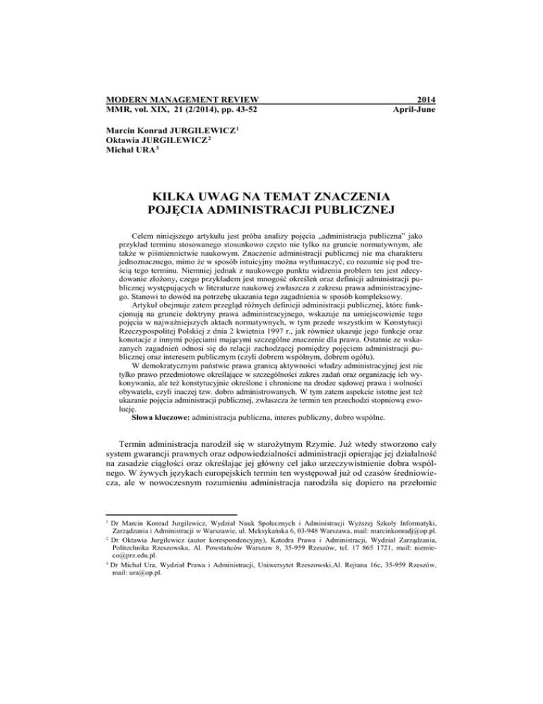 MODERN MANAGEMENT REVIEW MMR, vol. XIX, 21 (2/2014), pp. 43-52 2014 April-June Marcin Konrad JURGILEWICZ 1 Oktawia JURGILEWICZ 2 Michał URA 3 KILKA UWAG NA TEMAT ZNACZENIA POJĘCIA ADMINISTRACJI PUBLICZNEJ Celem niniejszego artykułu jest próba analizy pojęcia „administracja publiczna” jako przykład terminu stosowanego stosunkowo często nie tylko na gruncie normatywnym, ale także w piśmiennictwie naukowym. Znaczenie administracji publicznej nie ma charakteru jednoznacznego, mimo że w sposób intuicyjny można wytłumaczyć, co rozumie się pod treścią tego terminu. Niemniej jednak z naukowego punktu widzenia problem ten jest zdecydowanie złożony, czego przykładem jest mnogość określeń oraz definicji administracji publicznej występujących w literaturze naukowej zwłaszcza z zakresu prawa administracyjnego. Stanowi to dowód na potrzebę ukazania tego zagadnienia w sposób kompleksowy. Artykuł obejmuje zatem przegląd różnych definicji administracji publicznej, które funkcjonują na gruncie doktryny prawa administracyjnego, wskazuje na umiejscowienie tego pojęcia w najważniejszych aktach normatywnych, w tym przede wszystkim w Konstytucji Rzeczypospolitej Polskiej z dnia 2 kwietnia 1997 r., jak również ukazuje jego funkcje oraz konotacje z innymi pojęciami mającymi szczególne znaczenie dla prawa. Ostatnie ze wskazanych zagadnień odnosi się do relacji zachodzącej pomiędzy pojęciem administracji publicznej oraz interesem publicznym (czyli dobrem wspólnym, dobrem ogółu). W demokratycznym państwie prawa granicą aktywności władzy administracyjnej jest nie tylko prawo przedmiotowe określające w szczególności zakres zadań oraz organizację ich wykonywania, ale też konstytucyjnie określone i chronione na drodze sądowej prawa i wolności obywatela, czyli inaczej tzw. dobro administrowanych. W tym zatem aspekcie istotne jest też ukazanie pojęcia administracji publicznej, zwłaszcza że termin ten przechodzi stopniową ewolucję. Słowa kluczowe: administracja publiczna, interes publiczny, dobro wspólne. Termin administracja narodził się w starożytnym Rzymie. Już wtedy stworzono cały system gwarancji prawnych oraz odpowiedzialności administracji opierając jej działalność na zasadzie ciągłości oraz określając jej główny cel jako urzeczywistnienie dobra wspólnego. W żywych językach europejskich termin ten występował już od czasów średniowiecza, ale w nowoczesnym rozumieniu administracja narodziła się dopiero na przełomie Dr Marcin Konrad Jurgilewicz, Wydział Nauk Społecznych i Administracji Wyższej Szkoły Informatyki, Zarządzania i Administracji w Warszawie, ul. Meksykańska 6, 03-948 Warszawa, mail: [email protected]. 2 Dr Oktawia Jurgilewicz (autor korespondencyjny), Katedra Prawa i Administracji, Wydział Zarządzania, Politechnika Rzeszowska, Al. Powstańców Warszaw 8, 35-959 Rzeszów, tel. 17 865 1721, mail: [email protected]. 3 Dr Michał Ura, Wydział Prawa i Administracji, Uniwersytet Rzeszowski,Al. Rejtana 16c, 35-959 Rzeszów, mail: [email protected]. 1 44 M.K. Jurgilewicz, O. Jurgilewicz, M. Ura XVIII i XIX w. wraz z przekształceniem się państwa policyjnego w konstytucyjne, a administracji terytorialnej – w państwową 4. Z etymologicznego punktu widzenia słowo administracja oznacza służenie, co jest szczególnie charakterystyczne dla czynności podporządkowanym rozkazom, ponieważ ministrare znaczy kierować, wykonywać, natomiast przedrostek ad podkreśla oraz wzmacnia w wyrazie administrare moment celowości działania 5. Współcześnie termin ten ma charakter niejednorodny, czy też nawet nieokreślony 6, przy czym pojęcie to używane jest w wielu różnych znaczeniach, jako pewnego rodzaju działanie lub pewna wyodrębniona organizacja o cechach szczególnych. Mimo, że niejednokrotnie podnoszony jest argument, że administracji nie można zdefiniować, tylko ją opisać, to na gruncie teorii prawa administracyjnego podejmowane są próby zdefiniowania tego pojęcia 7. Pojawiające się trudności w wyczerpującym przedstawieniu definicji administracji publicznej wynikają przede wszystkim z rozległości zadań, jakie sama administracja ma do realizacji 8 . Doniosłym tego przykładem jest stwierdzenie E. Knosali, które brzmi, że „człowiek z administracją ma kontakt od momentu urodzenia aż do chwili śmierci”. Autor ten przykładowo wymienia kontakty człowieka z administracją taką jak: szpital (np. podczas narodzin, leczenia chorób), szkoła (np. w trakcie realizacji obowiązku szkolnego), Urząd Stanu Cywilnego (np. gdy sporządzany jest akt małżeństwa, zgłaszany fakt narodzin dziecka), czy też administracja cmentarna (np. w przypadku pochówku zmarłego) 9. Niewątpliwie zatem obszar znaczeniowy pojęcia administracji jest wysoce obszerny, stąd w literaturze jest mowa, że „na próżno byłoby szukać zamkniętej definicji administracji, a to z tego względu, że dość zgodnie podnosi się, iż nie można zdefiniować czegoś, co obejmuje swym zakresem różne jakościowo zjawiska, rodząc konieczność ograniczenia pola, które chcemy definiować” 10. Dlatego też ograniczenie zakresu badawczego administracji następuje przy jednym z charakterystycznych podziałów na administrację prywatną oraz administrację publiczną. Przedmiotem zainteresowania prawa administracyjnego nie jest administracja prywatna (odnosząca się tylko do pewnej dziedziny bądź zarządzania pewną dziedziną życia prywatnego), ale administracja publiczna. Ta ostatnia, jak zauważa J. Zimmermann, „jest sprawowana przez państwo (lub przez wyodrębnione podmioty działające z upoważnienia państwa) i realizuje dobro wspólne, czyli interes publiczny po to, aby przynieść jakąś korzyść ogółowi (wspólnocie, państwu) albo też dba o interes indywidualny reprezentując interesy całego społeczeństwa lub wspólnoty, lub ze względu na wyznawane powszechnie M. Żukowski, Wyb