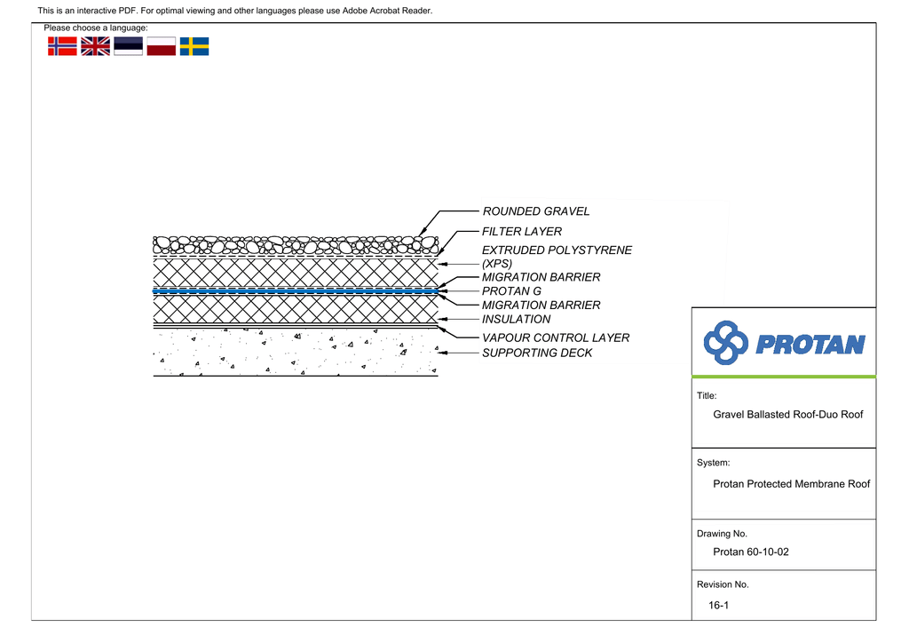 This is an interactive PDF. For optimal viewing and other languages please use Adobe Acrobat Reader. Please choose a language: KRUUS SINGEL ROUNDED GRAVEL FILTERKANGAS FILT FILTER LAYER EXTRUDED POLYSTYRENE EXTRUDERAD EKSTRUDERT POLYSTYREN CELLPLAST XPS (XPS) POLISTYREN EKSTRUDOWANY (XPS) MIGRERINGSSPERRE MIGRATION BARRIER MEMBRANA PROTAN G PROTAN G MIGRERINGSSPERRE MIGRATION BARRIER IZOLACJA TERMICZNA SOOJUSTUS ISOLASJON ISOLERING INSULATION VAPOUR CONTROL LAYER PAROIZOLACJA DAMPSPERRE KANDEKONSTRUKTSIOON SUPPORTING DECK Joonis: Tittel: Title: Kruusaga koormatud duo-katus Gravel Ballasted Roof-Duo Roof Duo Roof System: Membrana Kaitstud Protan Ballasterte Protected Protan Protan kattega Membrane Tak katusRoof Nr rysunku: Joonise Tegning Drawing nr. Nr. No. Protan 60-10-02 Nr rewizji: Versioon: Siste Revision Rev.No. Nr. 16-1