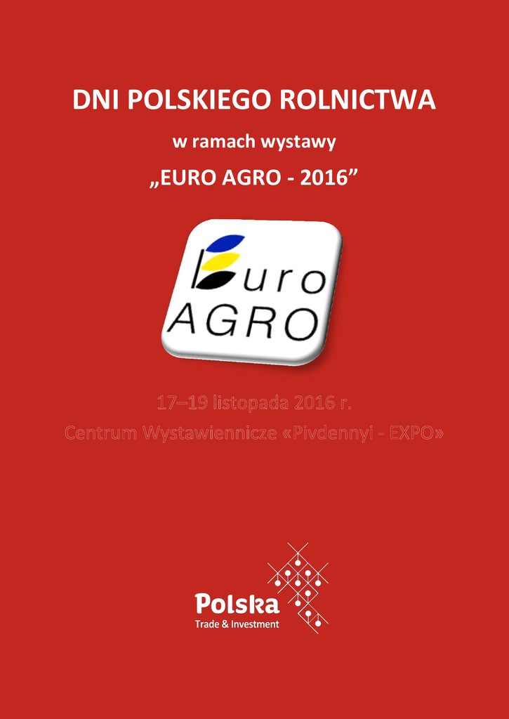 DNI POLSKIEGO ROLNICTWA w ramach wystawy „EURO AGRO - 2016” ORGANIZATORZY: PARTNERZY: PROGRAM «DNI POLSKIEGO ROLNICTWA» 16 listopada 2016 r. (środa) 14:00 – 18:00 Zagospodarowanie stoisk wystawienniczych na terenie Centrum Wystawienniczego „Pivdennyi Expo” (Lwów, ul. Szczyrecka 36) 17 listopada 2016 r. (czwartek) 10:00 – 10:30 Oficjalne otwarcie I Międzynarodowej Wystawy Rolniczej „Euro AGRO-2016” oraz II edycji „Dni Polskiego Rolnictwa” Prowadząca – Ołeksandra Antoniw, wiceprezydent Gal-Expo SA Przywitanie: Ołeh Syniutka – Przewodniczący Lwowskiej Obwodowej Administracji Państwowej Bartosz Musiałowicz - Kierownik Wydziału Promocji Handlu i Inwestycji Ambasady RP w Kijowie Włodzimierz Sulgostowski – Konsulat Generalny Rzeczypospolitej Polskiej we Lwowie Przedstawiciel Ministerstwa Polityki Agrarnej i Żywności Ukrainy Dariusz Michalak - Dyrektor Grupy Projektów Centrum Wystawienniczego i Kongresowego Targi Kielce SA – Polska Andrij Steruha – Prezydent Centrum Wystawienniczego Gal-EXPO SA – Ukraina Roman Fedyszyn – Dyrektor Rynku produktów rolnych "Szuwar" Sp. z o.o. Damian Ragan – Wiceprezes KredoBanku PKO Bank Polski Group Krzysztof Kalita – Prezes Zarządu Stowarzyszenia Integracja Europa – Wschód Zaproszeni goście 10:30 – 11:00 Oficjalna wizytacja stoisk Konferencja prasowa Rejestracja uczestników konferencji, kawa powitalna 11:00 – 11:30 11:30 – 12:00 Konferencja «Polsko-ukraińska współpraca w przemyśle i sektorze rolno-spożywczym» I dzień (miejsce: sala konferencyjna Centrum Wystawiennicze „Pivdennyj Expo”) 12:00 – 13:30 Sesja pierwsza: Inwestycje - stabilne przesłanki konkurencyjnego rozwoju gospodarki rolnej Moderatorzy: p. Oleg Dubisz – Wiceprezydent Polsko – Ukraińskiej Izby Gospodarczej p. Wołodymyr Korud, Naczelnik Zarządu ds. Międzynarodowych Stosunków Gospodarczych Lwowskiej Izby Przemysłowo-Handlowej Atrakcyjność inwestycyjna rolnictwa w regionie lwowskim Rostysław Zamłynskyj – pierwszy zastępca Przewodniczącego Lwowskiej Obwodowej Administracji Państwowowej Czynniki sukcesów i problemów polskiego rolnictwa w okresie transformacji ekonomicznej prof dr hab. Czesław Nowak, Uniwersytet Rolniczy w Krakowie, przewodniczący Rady Społecznej ODR woj. świętokrzyskiego Struktura gospodarki rolnej - gwarancja rozwoju MŚP i obszarów wiejskich. Doradztwo instrument zarządzania inwestycjami Adam Fura – dyrektor Oddziału Świętokrzyskiego Ośrodka Doradztwa Rolniczego w Sandomierzu Polityka wzajemnie powiązanego wieloukładowego rozwoju - instrument realizacji strategii rozwoju sektora rolnego gospodarki Ukrainy Witalij Sabłuk – zastępca dyrektora Narodowe Centrum Naukowe "Instytut Gospodarki Rolnej" Kooperacja - szkoła samodzielnego organizowania się oraz rozwiązywania indywidualnych problemów gospodarstw wiejskich Roman Korinec – prezydent narodowego zrzeszenia rolniczych doradczych służb Ukrainy Mykoła Hrycenko – ekspert przedsiębiorczości rolnej. 13:30 – 14:00 14:00 – 16:00 Przerwa na kawę Efektywność inwestowania. Problemy i sposoby rozwiązywania Igor Płotycja – dyrektor RSP „Szuwar” Sp. z o.o. Inna Kucharczuk – przewodnicząca stowarzyszenia rolników Winnicczyzny Maksym Bełozurow – dyrektor „Galrost” Sp. z o.o. Oleh Iwanczyna – kierownik przedsiębiorstwa rolnego “Biłyj Stik” rej. sokalski, obw. lwowski Oferta KredoBanku dla sektora rolniczego Ukrainy Jewhen Zaihraiev - Dyrektor Wykonawczy ds. MŚP i Korpo Iryna Hruj - Dyrektor Departamaentu Klientów MŚP Podsumowanie, dyskusja 19:00 -21:00 Przyjęcie dla uczestników wystawy (organizator Targi Kielce, Gal-EXPO) 10:00 – 10:30 Drugi dzień wystawy „EURO-AGRO” Rejestracja uczestników drugiego dnia konferencji, powitalna kawa Spotkania B2B na indywidualnych stoiskach polskich firm oraz na stoisku promocyjnym WPHI (Lwowska Izba Handlowo - Przemysłowa, Lwowska Państwowa Administracja Obwodowa, Biuro Promocji Eksportu MRGiH, firmy z branży rolniczej) 18 listopada 2016 r. (piątek) 11:00 – 15:00 Konferencja «Polsko-ukraińska współpraca w przemyśle i sektorze rolno-spożywczym» II dzień (miejsce: sala konferencyjna Centrum Wystawiennicze „Pivdennyj Expo”) 10:30 – 11:20 Sesja pierwsza: prezentacja ofert polskich przedsiębiorstw Moderator: Ryszard Białacki, koordynator Świętokrzyskiego Biura Domu Wschodniej Polski w Brukseli 11:20 – 12:10 Sesja druga: projekty inwestycyjne ukraińskich przedsiębiorstw w sektorze rolnym Moderator: Iwan Stefanyszyn, radca dyrektora ds. rolnych RSP „Szuwar” Sp. z o.o. 12:10 – 13:00 Uroczystości z okazji święta Dnia rolnika - Lwowska Obwodowa Administracja Państwowa 13:00 – 14:00 Prezentacja międzynarodowego projektu Europejski System Rozwoju CERTUA - Stowarzyszenie Integracja Europa – Wschód - Winnicka Izba Handlowo – Przemysłowa Sesja trzecia: rozwój rynku organicznego na Ukrainie Rozwój rynku organicznego na Ukrainie Tetiana Sytnik – ekspert, kierownik Retail Academy Praktyczne doświadczenia optymalizacji żywienia roślin i odnawiania naturalnej urodzajności gruntów Oleksandr Dżyha – dyrektor przedsiębiorstwa „Sun Berry – Ukraine” Ustawa jako wsparcie produkcji organicznej: regulacje prawne Ołena Rakowa – dyrektor wykonawczy Stowarzyszenia producentów organicznych certyfikowanych produktów Organiczna Ukraina, ekspert rynku organicznego Doświadczenia prowadzenia organicznego sadownictwa. Etap przedprojektowy Konstiantyn Sicznyj – kierownik stowarzyszenia Organiczna Ukraina Zachód Polskie Produkty Regionalne i Tradycyjne wpisane na listy: Chroniona Nazwa Pochodzenia, Chronione Oznaczenie Geograficzne, Gwarantowana Tradycyjna Specjalność Kacper Nowak - Uniwersytet Jagielloński w Krakowie Zakończenie konferencji – podsumowanie, przerwa na kawę Wieczorne zwiedzanie Lwowa z przewodnikiem (opcjonalnie) 19:00 19 listopada 2016 r. (sobota) 10:00 – 18:00 Trzeci dzień wysta