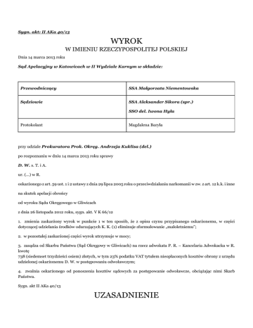 Sygn. akt: II AKa 40/13 WYROK W IMIENIU RZECZYPOSPOLITEJ POLSKIEJ Dnia 14 marca 2013 roku Sąd Apelacyjny w Katowicach w II Wydziale Karnym w składzie: Przewodniczący SSA Małgorzata Niementowska Sędziowie SSA Aleksander Sikora (spr.) SSO del. Iwona Hyła Protokolant Magdalena Baryła przy udziale Prokuratora Prok. Okręg. Andrzeja Kuklisa (del.) po rozpoznaniu w dniu 14 marca 2013 roku sprawy D. W. s. T. i A. ur. (...) w R. oskarżonego z art. 59 ust. 1 i 2 ustawy z dnia 29 lipca 2005 roku o przeciwdziałaniu narkomanii w zw. z art. 12 k.k. i inne na skutek apelacji obrońcy od wyroku Sądu Okręgowego w Gliwicach z dnia 26 listopada 2012 roku, sygn. akt. V K 66/12 1. zmienia zaskarżony wyrok w punkcie 1 w ten sposób, że z opisu czynu przypisanego oskarżonemu, w części dotyczącej udzielania środków odurzających K. K. (1) eliminuje sformułowanie „małoletniemu”; 2. w pozostałej zaskarżonej części wyrok utrzymuje w mocy; 3. zasądza od Skarbu Państwa (Sąd Okręgowy w Gliwicach) na rzecz adwokata P. R. – Kancelaria Adwokacka w R. kwotę 738 (siedemset trzydzieści osiem) złotych, w tym 23% podatku VAT tytułem nieopłaconych kosztów obrony z urzędu udzielonej oskarżonemu D. W. w postępowaniu odwoławczym; 4. zwalnia oskarżonego od ponoszenia kosztów sądowych za postępowanie odwoławcze, obciążając nimi Skarb Państwa. Sygn. akt II AKa 40/13 UZASADNIENIE Wyrokiem z dnia 26 listopada 2012 roku Sąd Okręgowy w Gliwicach, w sprawie o sygnaturze V K 66/12, uznał oskarżonego D. W. za winnego tego, że w okresie od maja 2011 roku do 13 kwietnia 2012 roku w K., działając w krótkich odstępach czasu, w wykonaniu z góry powziętego zamiaru oraz w celu osiągnięcia korzyści majątkowej, wbrew przepisom ustawy, udzielał ustalonym osobom, w tym małoletnim, środki odurzające a także psychotropowe i tak: • dwukrotnie sprzedał małoletniemu K. K. (1) łącznie 2 gramy środków odurzających w postaci marihuany za łączną kwotę 60 złotych, • sześciokrotnie sprzedał małoletniemu K. K. (2) łącznie 6 gram środków odurzających w postaci marihuany za łączną kwotę 180 złotych, • sześciokrotnie sprzedał R. M. łącznie 6 gram środków odurzających w postaci marihuany za łączną kwotę 180 złotych, • czterokrotnie sprzedał A. O. łącznie 4 gramy środków odurzających w postaci marihuany za łączną kwotę 120 złotych, • dwukrotnie sprzedał K. M. łącznie 2 gramy substancji psychotropowej w postaci amfetaminy za łączną kwotę 80 złotych, czym wyczerpał znamiona przestępstwa z art. 59 ust. 1 i 2 ustawy z dnia 29 lipca 2005 roku o przeciwdziałaniu narkomanii w zw. z art. 11 § 2 kk i 12 kk i za to na podstawie art. 59 ust. 2 powołanej ustawy o przeciwdziałaniu narkomanii w zw. z art. 11 § 3 kk wymierzono mu karę 3 lat pozbawienia wolności. Tym samym wyrokiem oskarżony D. W. został uznany za winnego popełnienia przestępstwa z art. 62 ust. 1 ustawy z dnia 29 lipca 2005 roku o przeciwdziałaniu narkomanii, za co wymierzono mu karę 8 miesięcy pozbawienia wolności, jednakże w tym zakresie wyrok nie został zaskarżony. Na podstawie art. 85 kk i art. 86 § 1 kk wymierzono oskarżonemu karę łączną 3 lat i 3 miesięcy pozbawienia wolności. W oparciu o art. 45 § 1 kk orzeczono wobec oskarżonego środek karny w postaci przepadku równowartości korzyści majątkowej, osiągniętej z popełnienia przestępstwa z art. 59 ust. 1 i 2 powołanej wyżej ustawy o przeciwdziałaniu narkomanii i inne, w łącznej kwocie 620 złotych. Na podstawie art. 70 ust. 2 powołanej wyżej ustawy o przeciwdziałaniu narkomanii orzeczono wobec oskarżonego przepadek środków odurzających w postaci marihuany, o łącznej wadze 23, 87 grama netto, zabezpieczonych w sprawie. Na podstawie art. 63 § 1 kk na poczet wymierzonej oskarżonemu łącznej kary pozbawienia wolności zaliczono okres tymczasowego aresztowania od dnia 13 kwietnia 2012 do dnia 23 maja 2012 roku. Na rzecz występującego w sprawie obrońcy z urzędu zasądzono koszty udzielonej oskarżonemu pomocy prawnej, a na zasadzie art. 624 § 1 kpk zwolniono oskarżonego od ponoszenia kosztów sądowych, obciążając nimi Skarb Państwa. Apelację od wyroku złożył obrońca oskarżonego, zaskarżając wyrok w części, to jest w punkcie 1 orzeczenia (dot. przypisanego oskarżonemu czynu z art. 59 ust. 1 i 2 ustawy o przeciwdziałaniu narkomanii) i zarzucając mu błąd w ustaleniach faktycznych przyjętych za podstawę orzeczenia, mający wpływ na jego treść, a polegający na przyjęciu przez Sąd I instancji, że oskarżony D. W. miał świadomość małoletniości K. K. (1) i K. K. (2), podczas gdy materiał dowodowy zebrany w sprawie nie daje podstaw do ustalenia tej okoliczności. Z ostrożności procesowej obrońca sformułował nadto zarzut błędu w ustaleniach faktycznych, polegającego na przyjęciu, że oskarżony udzielał osobom wskazanym w akcie oskarżenia środków odurzających. Podnosząc te zarzuty obrońca wniósł o uniewinnienie oskarżonego od zarzucanego mu czynu opisanego w punkcie I aktu oskarżenia (punkt 1 wyroku), ewentualnie zaś o uchylenie orzeczenia w zaskarżonej części i przekazanie sprawy w tym zakresie Sądowi I instancji do ponownego rozpoznania. Sąd Apelacyjny zważył, co następuje: Drugi z zarzutów odwoławczych, sformułowany jako ewentualny, jest w istocie dalej idący i z nim wiąże się wniosek odwoławczy o uniewinnienie oskarżonego od popełnienia czynu przypisanego mu w punkcie 1 wyroku. Jedynym argumentem na poparcie tego zarzutu w uzasadnieniu apelacji jest wskazanie, iż błędu w ustaleniach faktycznych dopuścił się Sąd I instancji w wyniku nieprawidłowej oceny materiału dowodowego, a to nieprawidłowo za wiarygodne uznając zeznania osób, które potwierdzały zakup narkotyków od oskarżonego, jednocześnie zaś poprzez uznanie za niewiarygodne wyjaśnień oskarżonego, złożonych przed sądem, w 