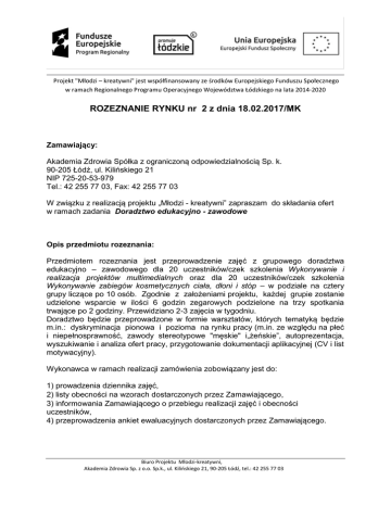 Projekt "Młodzi – kreatywni" jest współfinansowany ze środków Europejskiego Funduszu Społecznego w ramach Regionalnego Programu Operacyjnego Województwa Łódzkiego na lata 2014-2020 ROZEZNANIE RYNKU nr 2 z dnia 18.02.2017/MK Zamawiający: Akademia Zdrowia Spółka z ograniczoną odpowiedzialnością Sp. k. 90-205 Łódź, ul. Kilińskiego 21 NIP 725-20-53-979 Tel.: 42 255 77 03, Fax: 42 255 77 03 W związku z realizacją projektu „Młodzi - kreatywni” zapraszam do składania ofert w ramach zadania Doradztwo edukacyjno - zawodowe Opis przedmiotu rozeznania: Przedmiotem rozeznania jest przeprowadzenie zajęć z grupowego doradztwa edukacyjno – zawodowego dla 20 uczestników/czek szkolenia Wykonywanie i realizacja projektów multimedialnych oraz dla 20 uczestników/czek szkolenia Wykonywanie zabiegów kosmetycznych ciała, dłoni i stóp – w podziale na cztery grupy liczące po 10 osób. Zgodnie z założeniami projektu, każdej grupie zostanie udzielone wsparcie w ilości 6 godzin zegarowych podzielone na trzy spotkania trwające po 2 godziny. Przewidziano 2-3 zajęcia w tygodniu. Doradztwo będzie przeprowadzone w formie warsztatów, których tematyką będzie m.in.: dyskryminacja pionowa i pozioma na rynku pracy (m.in. ze względu na płeć i niepełnosprawność, zawody stereotypowe "męskie" i„żeńskie”, autoprezentacja, wyszukiwanie i analiza ofert pracy, przygotowanie dokumentacji aplikacyjnej (CV i list motywacyjny). Wykonawca w ramach realizacji zamówienia zobowiązany jest do: 1) prowadzenia dziennika zajęć, 2) listy obecności na wzorach dostarczonych przez Zamawiającego, 3) informowania Zamawiającego o przebiegu realizacji zajęć i obecności uczestników, 4) przeprowadzenia ankiet ewaluacyjnych dostarczonych przez Zamawiającego. Biuro Projektu Młodzi-kreatywni, Akademia Zdrowia Sp. z o.o. Sp.k., ul. Kilińskiego 21, 90-205 Łódź, tel.: 42 255 77 03 Projekt "Młodzi – kreatywni" jest współfinansowany ze środków Europejskiego Funduszu Społecznego w ramach Regionalnego Programu Operacyjnego Województwa Łódzkiego na lata 2014-2020 Wymagania: O udzielenie zamówienia mogą ubiegać się Wykonawcy, którzy: posiadają wykształcenie wyższe w zakresie psychologii doradztwa zawodowego, bądź ukończone studia podyplomowe w zakresie doradztwa zawodowego, posiadają wiedzę i doświadczenie zawodowe w pracy doradcy zawodowego, a w szczególności w prowadzeniu grupowego doradztwa zawodowego, tj. min. 200 godzin udokumentowanego doświadczenia w okresie nie krótszym niż 24 miesiące bezpośrednio przed podjęciem zatrudnienia, są osobami fizycznymi lub osobami samozatrudnionymi (osobami fizycznymi prowadzącymi jednoosobową działalność gospodarczą, przy czym zaznacza się, że Wykonawca będzie świadczył w projekcie usługi osobiście), w przypadku osób prowadzących jednoosobową działalność gospodarczą zaznacza się, że w stosunku do firmy: nie otwarto likwidacji i nie ogłoszono jej upadłości, nie zalega z uiszczaniem podatków, opłat lub składek na ubezpieczenia zdrowotne i społeczne, nie została skazana za przestępstwo popełnione w związku z postępowaniem o udzielenie zamówienia, a także firma posiada wpis do Rejestru Instytucji Szkoleniowych i Krajowego Rejestru Agencji Zatrudnienia, nie są powiązani osobowo lub kapitałowo z Zamawiającym. Przez powiązania kapitałowe lub osobowe rozumie się wzajemne powiązania między beneficjentem lub osobami upoważnionymi do zaciągania zobowiązań w imieniu beneficjenta lub osobami wykonującymi w imieniu beneficjenta czynności związanych z przygotowaniem i przeprowadzeniem procedury wyboru Wykonawcy a Wykonawcą, polegające w szczególności na: a) uczestniczeniu w spółce jako wspólnik spółki cywilnej lub spółki osobowej, b) posiadaniu co najmniej 10 % udziałów lub akcji, c) pełnieniu funkcji członka organu nadzorczego lub zarządzającego, prokurenta, pełnomocnika, Biuro Projektu Młodzi-kreatywni, Akademia Zdrowia Sp. z o.o. Sp.k., ul. Kilińskiego 21, 90-205 Łódź, tel.: 42 255 77 03 Projekt "Młodzi – kreatywni" jest współfinansowany ze środków Europejskiego Funduszu Społecznego w ramach Regionalnego Programu Operacyjnego Województwa Łódzkiego na lata 2014-2020 d) pozostawaniu w związku małżeńskim, w stosunku pokrewieństwa lub powinowactwa w linii prostej, pokrewieństwa drugiego stopnia lub powinowactwa drugiego stopnia przysposobienia, opieki lub kurateli. w linii bocznej lub w stosunku Informacja o dokumentach, jakie mają dostarczyć wykonawcy celem potwierdzenia spełnienia warunków udziału w prowadzonym rozeznaniu: 1. Curriculum Vitae 2. Kopia dyplomu potwierdzającego posiadanie wykształcenia wyższego potwierdzona za zgodność z oryginałem przez Oferenta. 3. Kopie rekomendacji/referencji wystawione przez podmiot/y zlecający/e usługę, dotyczące przeprowadzenia min. 200 godzin udokumentowanego doświadczenia w okresie nie krótszym niż 24 miesiące bezpośrednio przed podjęciem zatrudnienia, potwierdzone za zgodność z oryginałem przez Oferenta. 4. Wypełniony formularz oferty (załącznik nr 1). 5. Wykaz doświadczenia zawodowego z prowadzenia grupowego doradztwa zawodowego w zakresie opisanym w pkt 1. (załącznik nr 2). 6. Oświadczenie o braku powiązań osobowych z Zamawiającym (załącznik nr 3). lub kapitałowych 7. Oświadczenie dotyczące zgody na przetwarzanie danych osobowych (załącznik nr 4). 8. W przypadku osób prowadzących działalność gospodarczą oświadczenie o spełnieniu warunków udziału w postępowaniu oraz o braku innych podstaw do wykluczenia z udziału w postępowaniu, a także kopia potwierdzona za zgodność z oryginałem wpisu do Rejestru Instytucji Szkoleniowych (załącznik nr 5). Niezłożenie wyżej wymienionych dokumentów będzie skutkowało odrzuceniem oferty Wykonawcy. Biuro Projektu Młodzi-kreatywni, Akademia Zdrowia Sp. z o.o. Sp.k., ul. Kilińskiego 21, 90-205 Łó